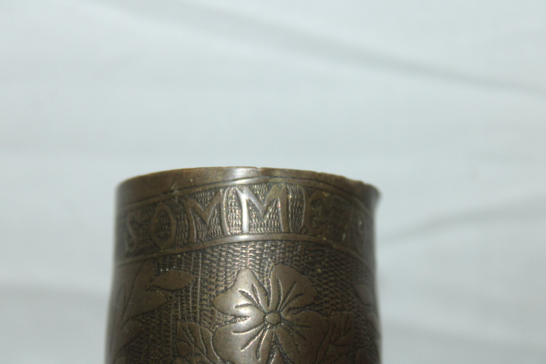 Artisanat fait dans une paire de douilles d'obus de 37 mm gravé avec des fleurs et souvenir de guerre. Hauteur 9.5 cm et 8cm.