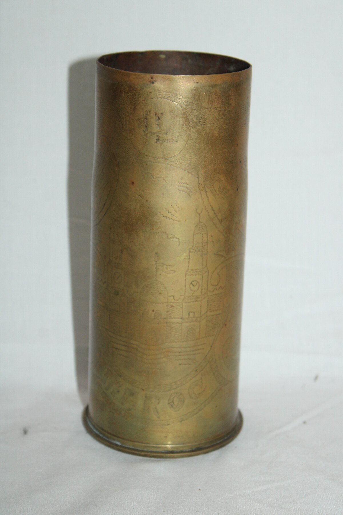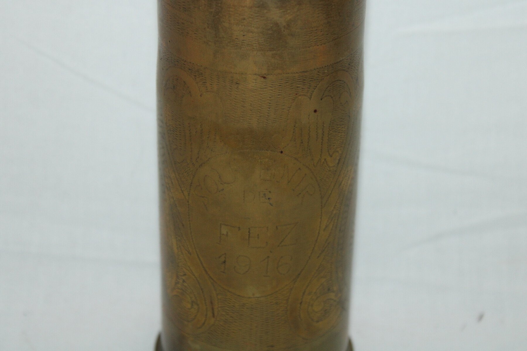 Lot  de 3 douilles d'obus de 65 mm gravé, une Alsace 1914-15-16-17, une souvenir de fez 1916 Maroc, une champagne Verdun 1914/1918 . Hauteur 17cm.