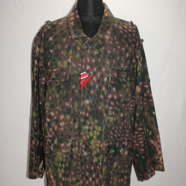 Ensemble veste et pantalon en camouflage petit pois. Insigne sur la manche. Trace de colle au col. Largeur D'épaule 56cm, longueur de manche 60cm. Taille pantalon: tour de taille 49cm à plat,...