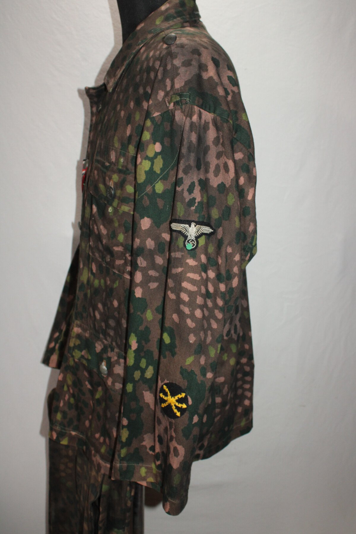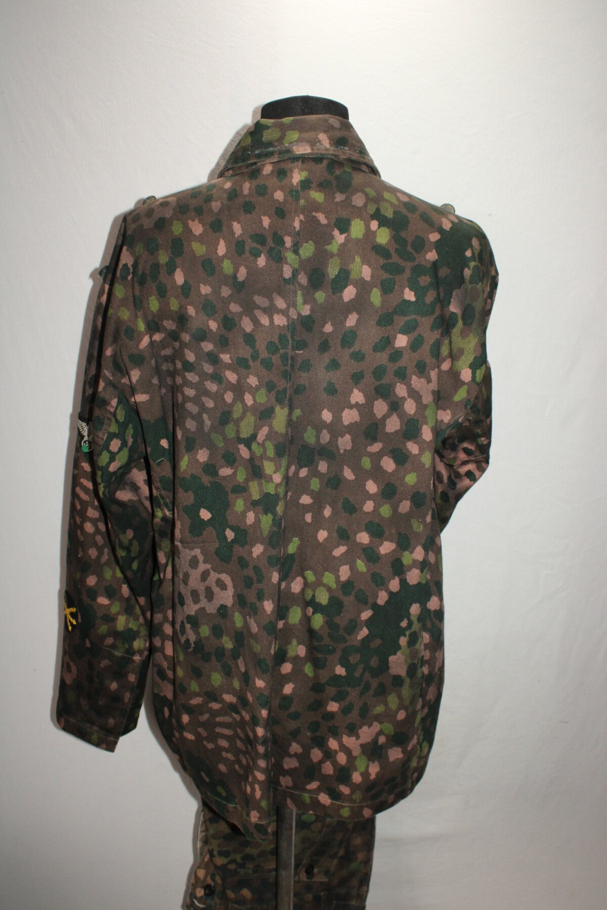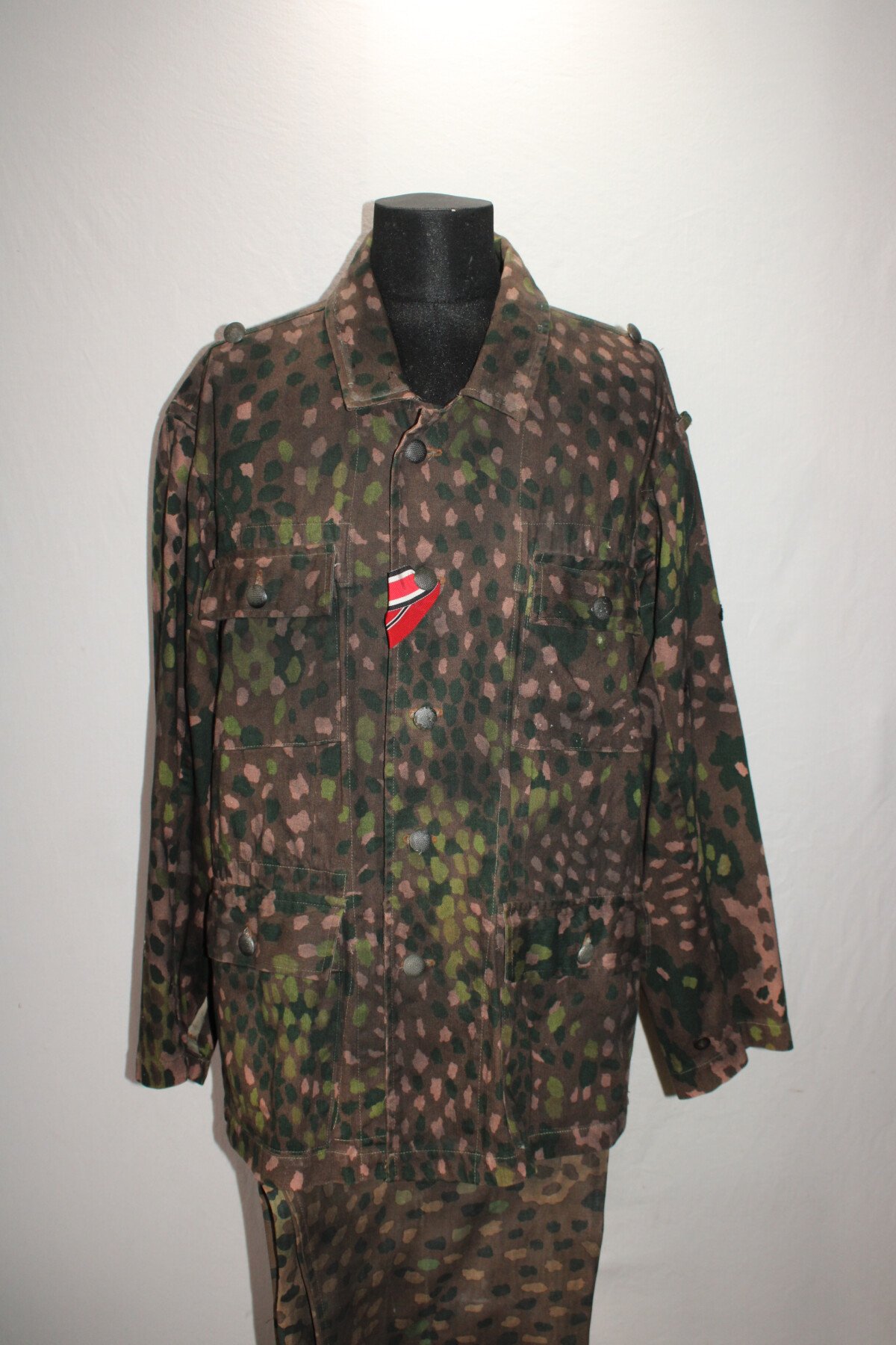 Ensemble veste et pantalon en camouflage petit pois. Insigne sur la manche. Trace de colle au col. Largeur D'épaule 56cm, longueur de manche 60cm. Taille pantalon: tour de taille 49cm à plat, hauteur total 99cm, hauteur d'entrejambe 71cm.