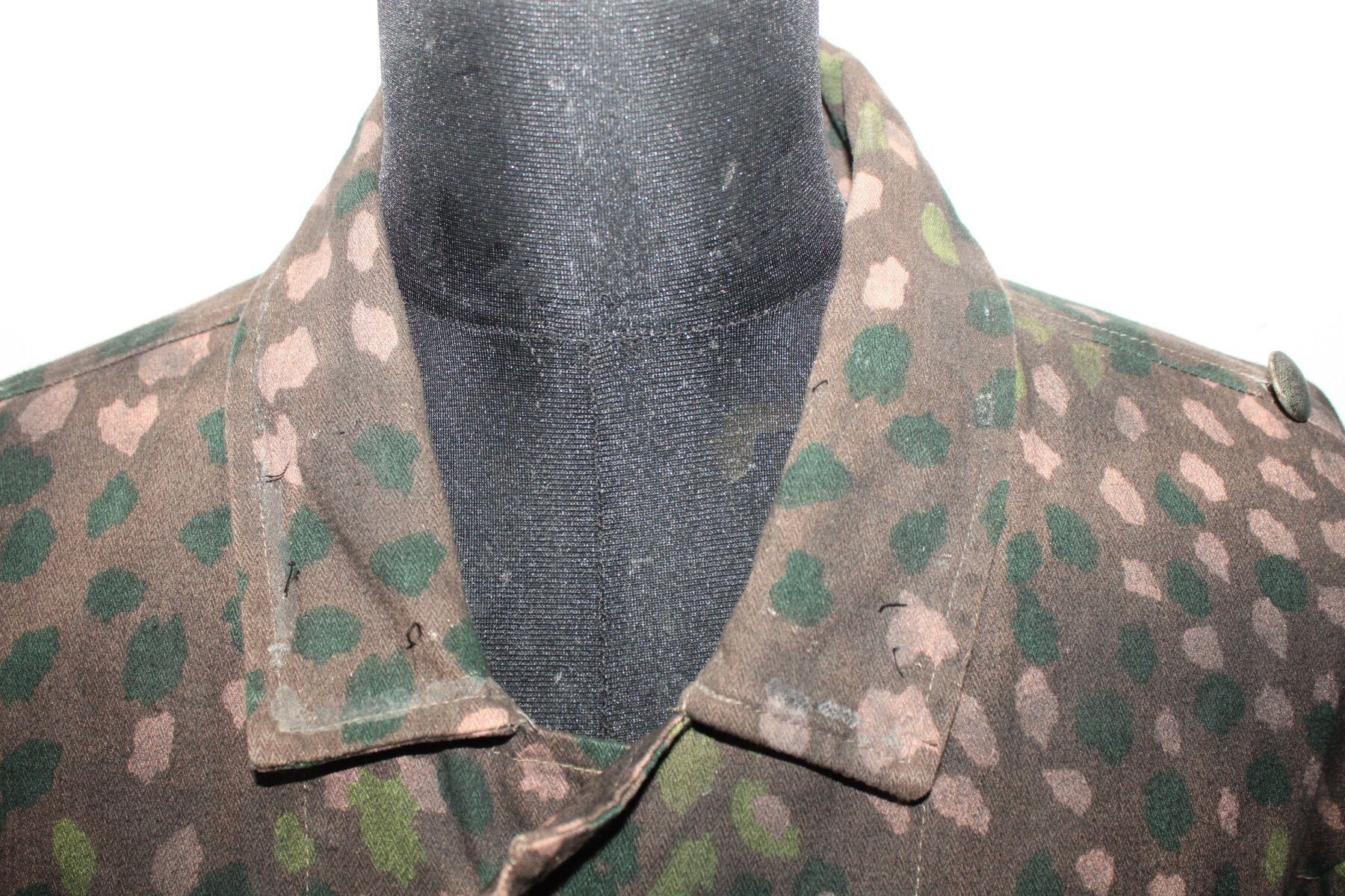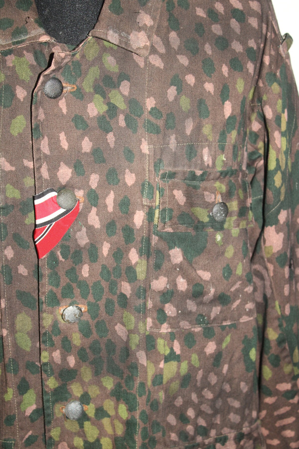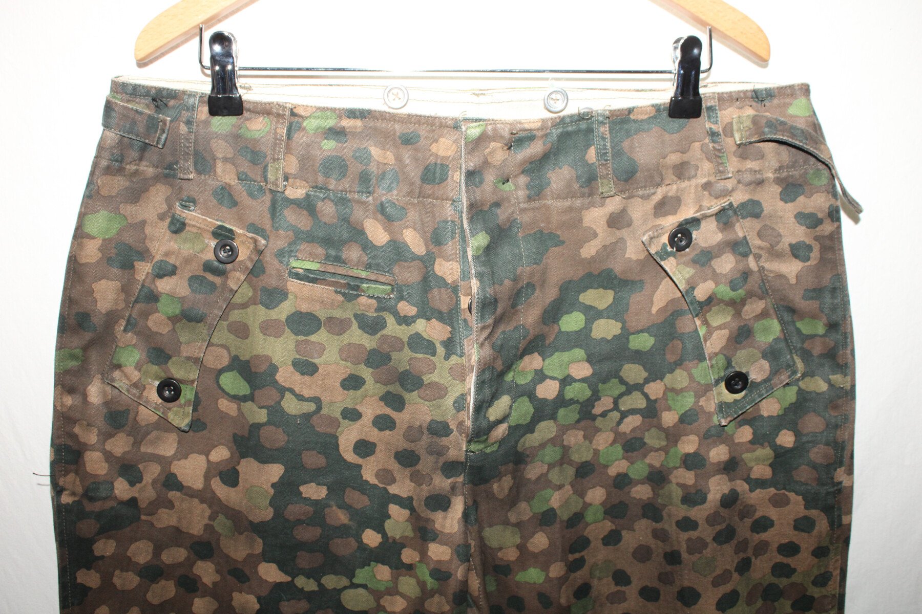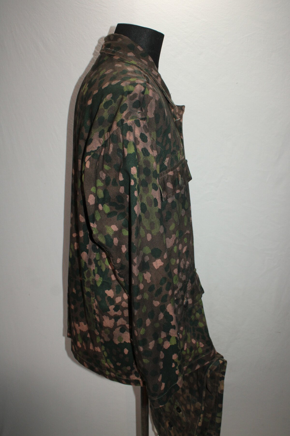 Ensemble veste et pantalon en camouflage petit pois. Insigne sur la manche. Trace de colle au col. Largeur D'épaule 56cm, longueur de manche 60cm. Taille pantalon: tour de taille 49cm à plat, hauteur total 99cm, hauteur d'entrejambe 71cm.