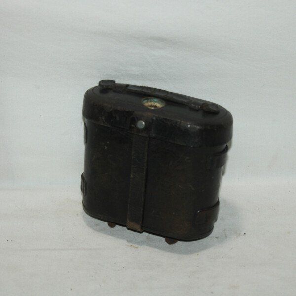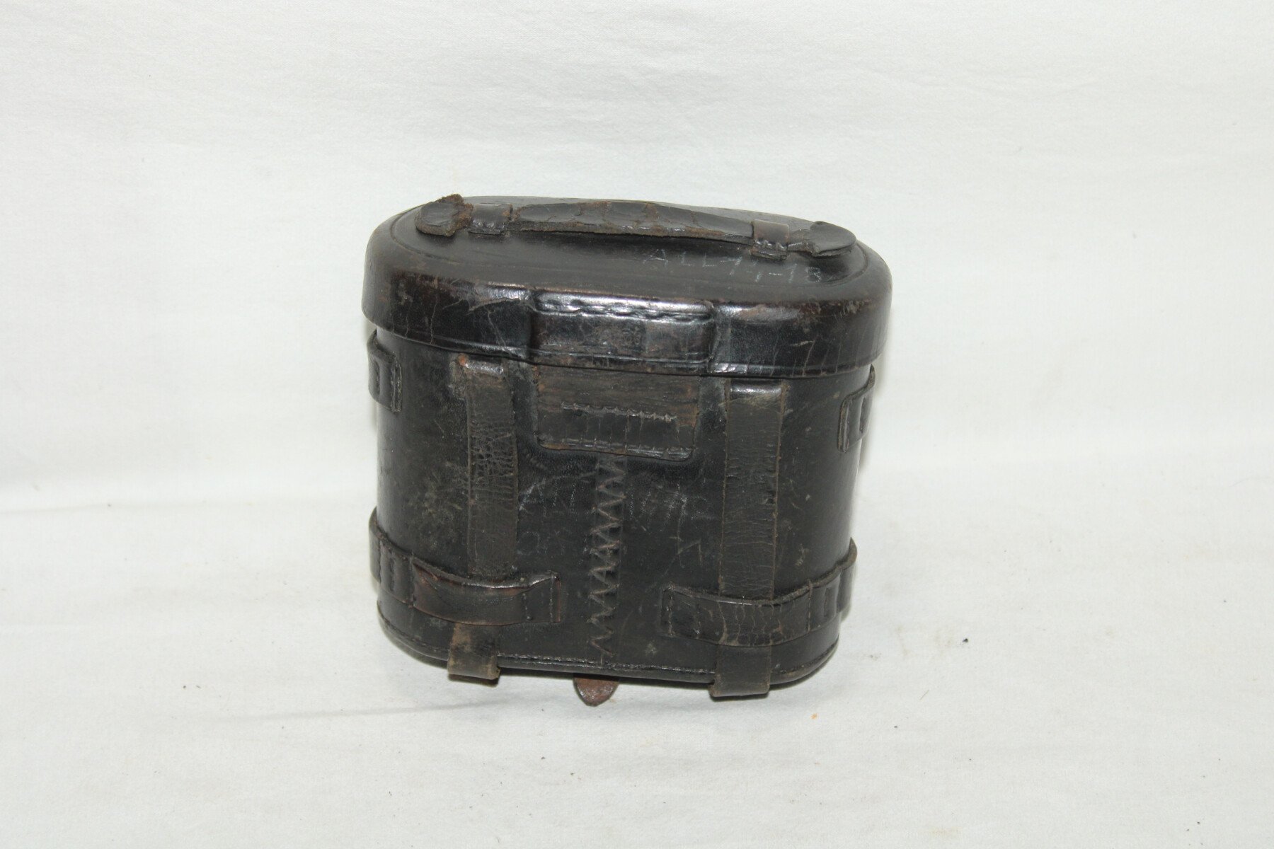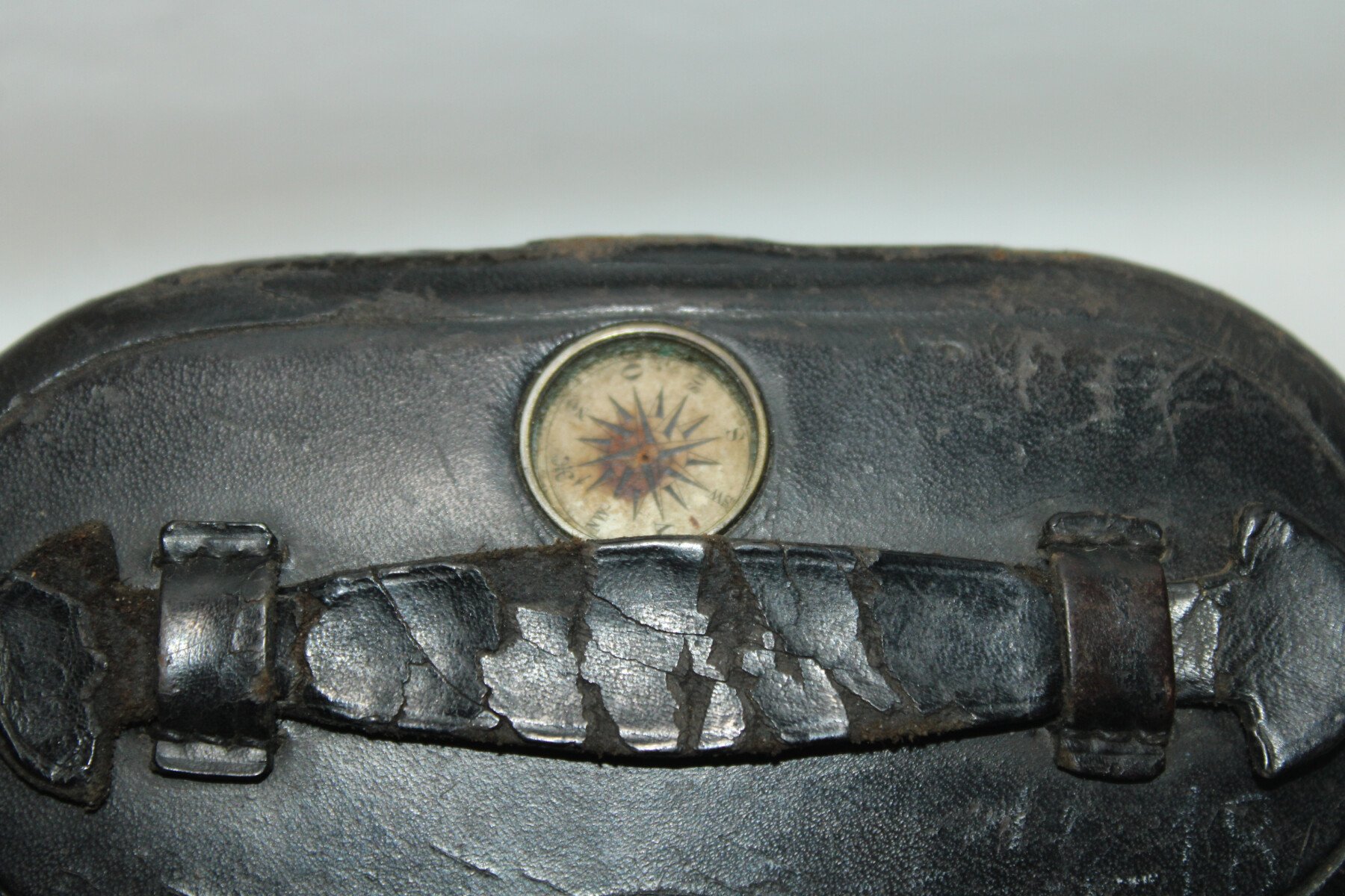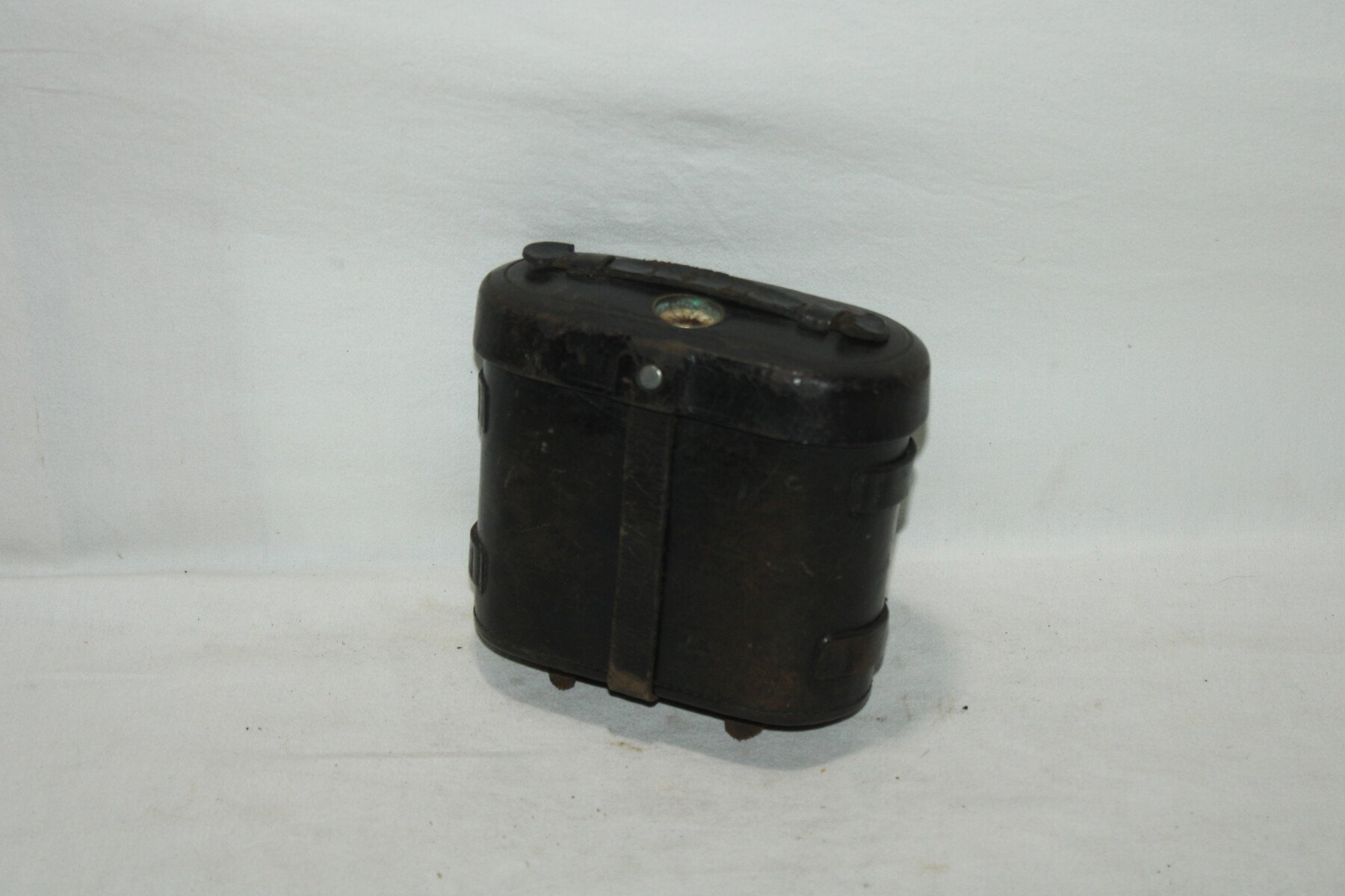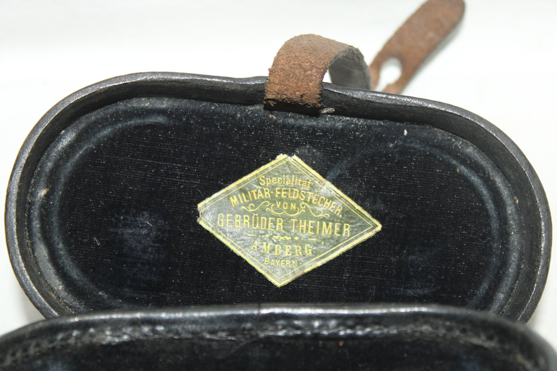 Etui en cuir pour paires de jumelles. Etiquette du fabricant Gebruder Theimer à Amberg. Boussole cassée. Cuir souple.