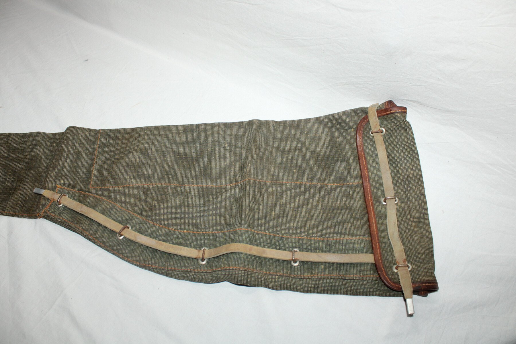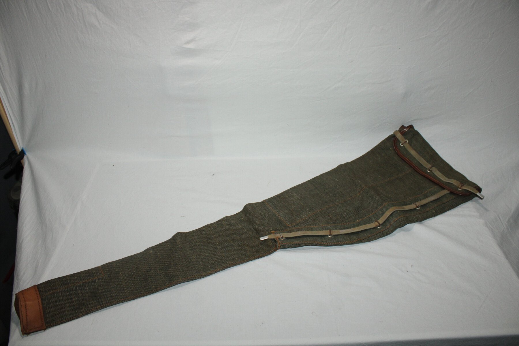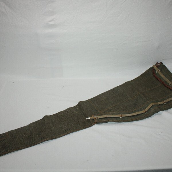 Housse de protection en toile et cuir pour mitrailleuse MAC 31. Aucun marquage visible. Cuir souple. Longueur total 110.5cm.