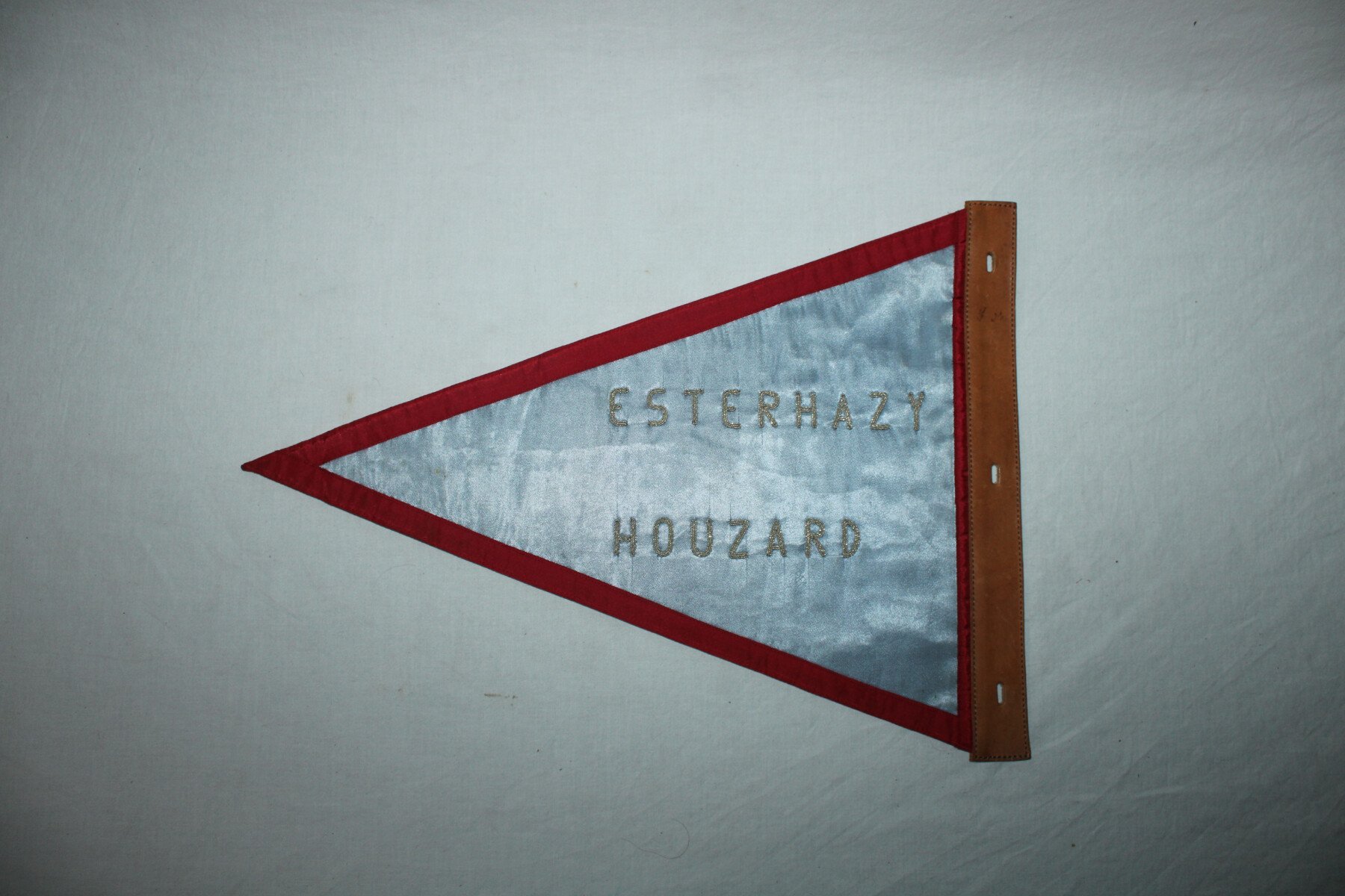Fanion d'unité du 2e escadron du 3e régiment de Hussard. Les lettres sont brodées en fil d'argent au dos figure la devise du régiment “Esterhazy Houzard”. Avec le renfort en cuir permettant le port sur l'arme ou la lance lors des parades et cérémonies.