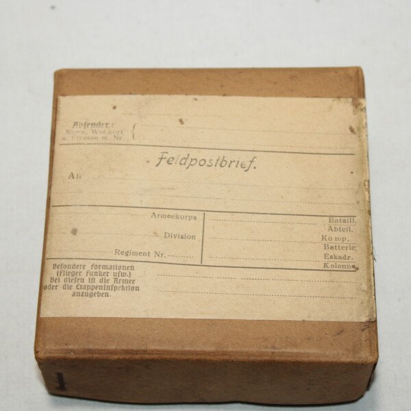 Petit colis feldpostbrief avec une boite en métal. Jamais utilisé. Dimensions : environ 10.5cm x 10.5cm X 4cm de haut