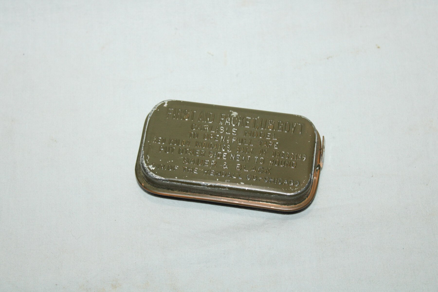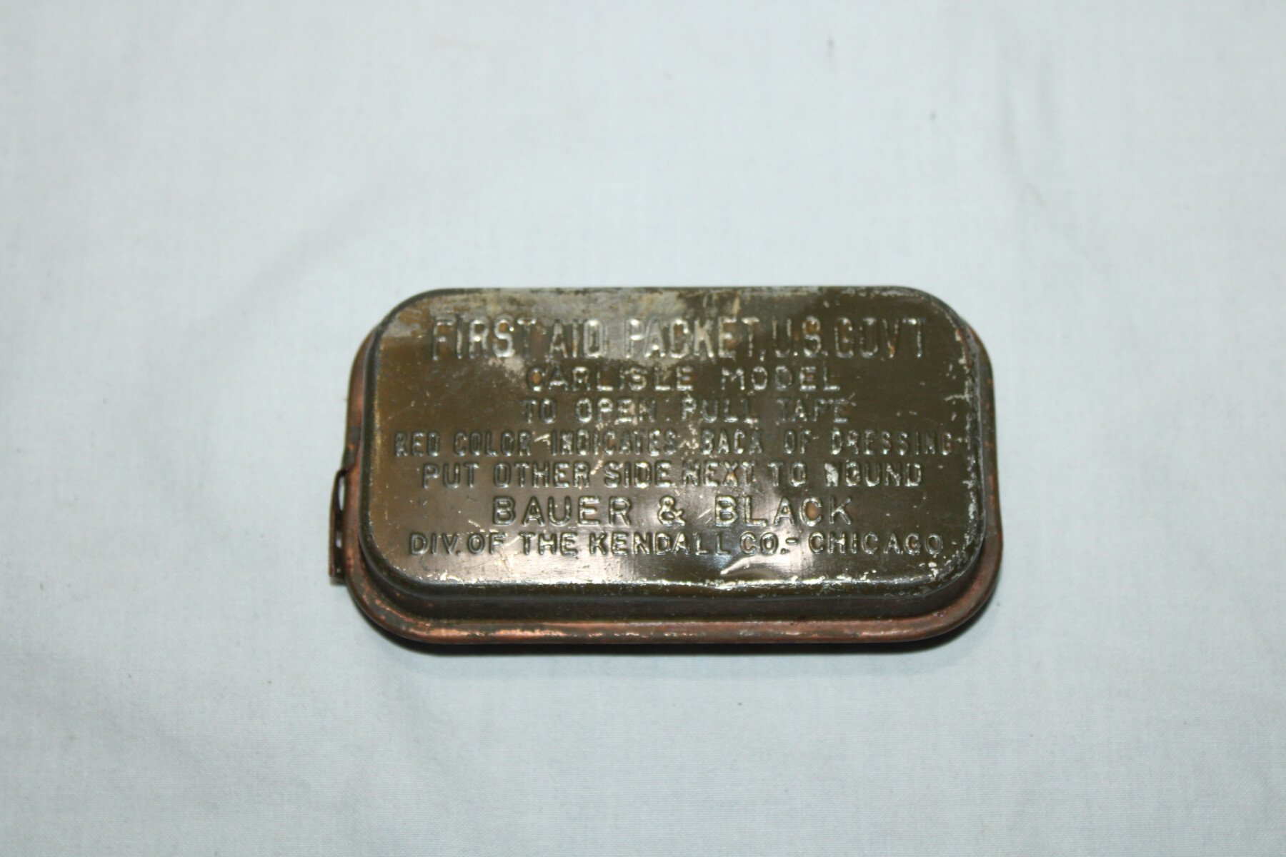 Kit first aid en boite métal kaki, fabriqué par Bauer & black.