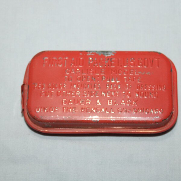 Kit first aid en boite métal rouge, fabriqué par Bauer & black. Photos non contractuelles, plusieurs de disponibles dans le même état.