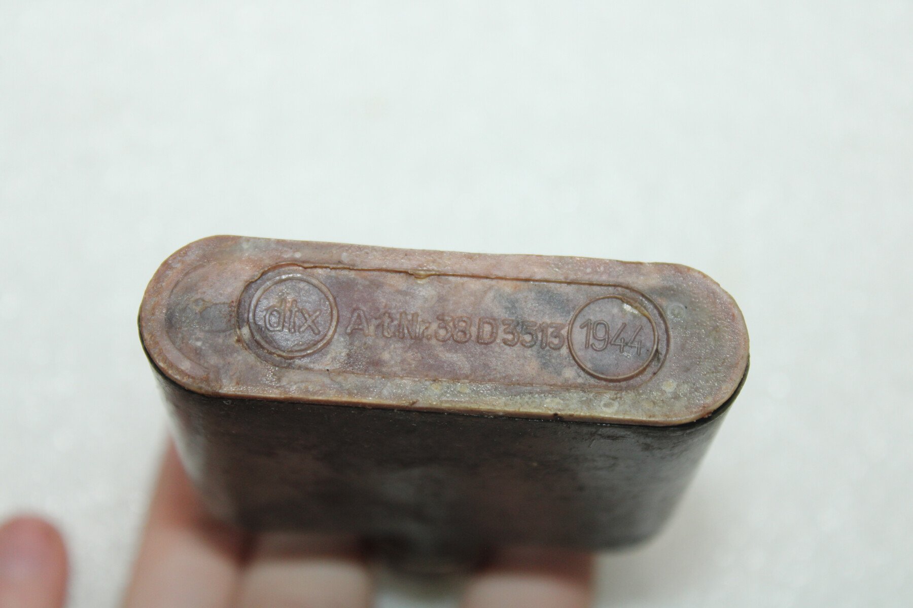 Flacon de produit décontaminent contre les gaz, en plastique marron. Daté 1944.