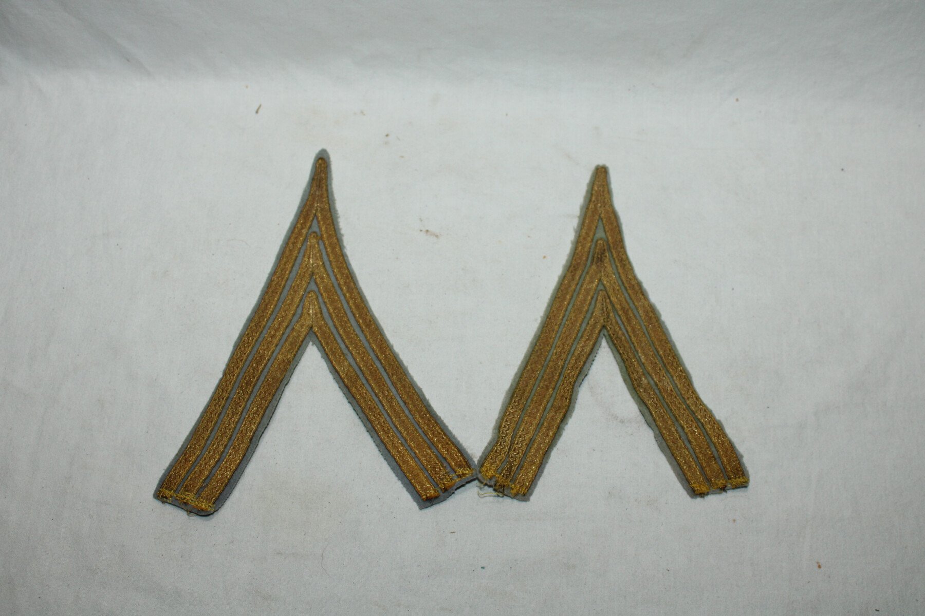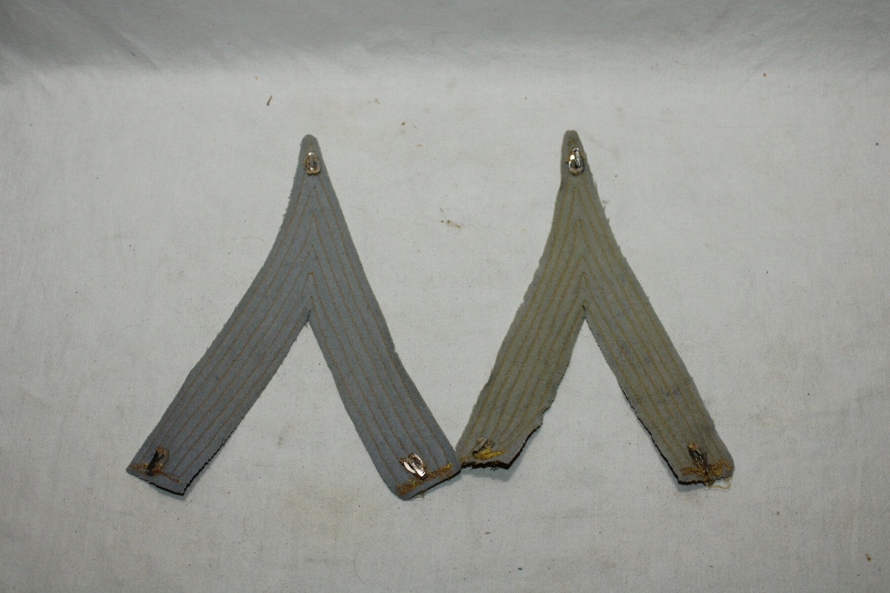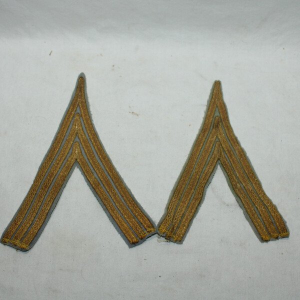 Paire de galons de manches de sergent-chef ou maréchal des logis chef sur fond bleu ciel/gris pour tenue de tirailleurs année20/40 avec crochets de fixation amovibles.