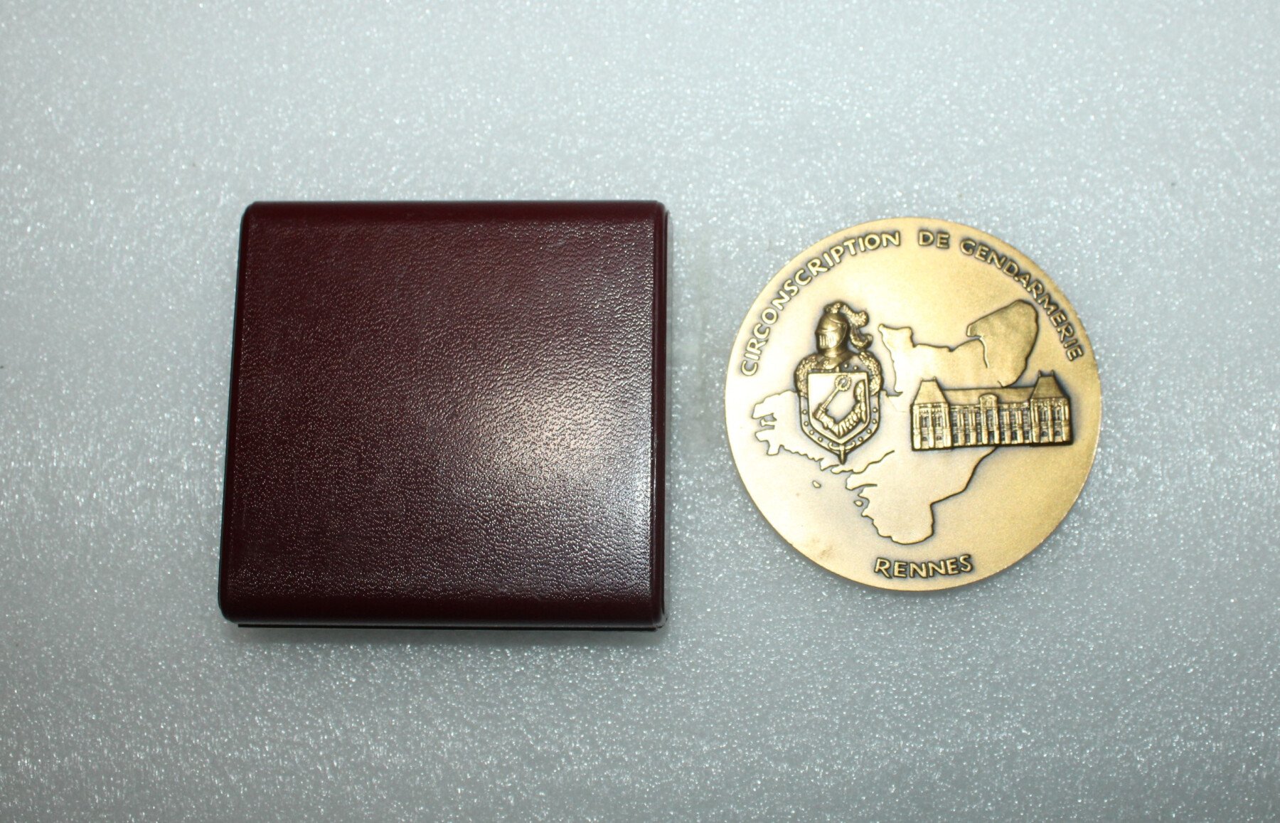 Médaille de table commémorative de la circonscription de gendarmerie de Rennes en bronze de la maison Pichard. Dans son coffret d'origine. Poids 275 grammes sans sa boite d'origine, diamètre 80mm.