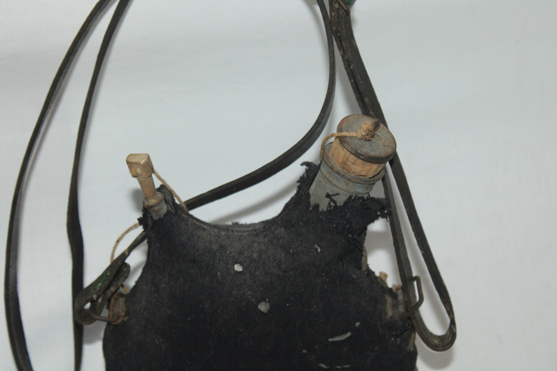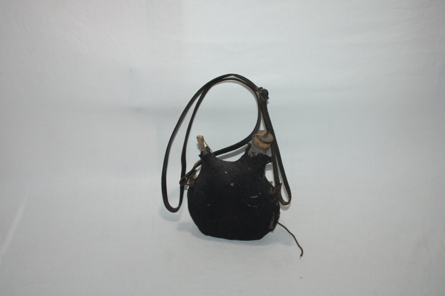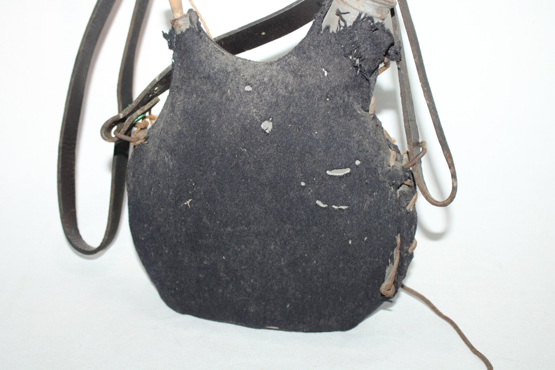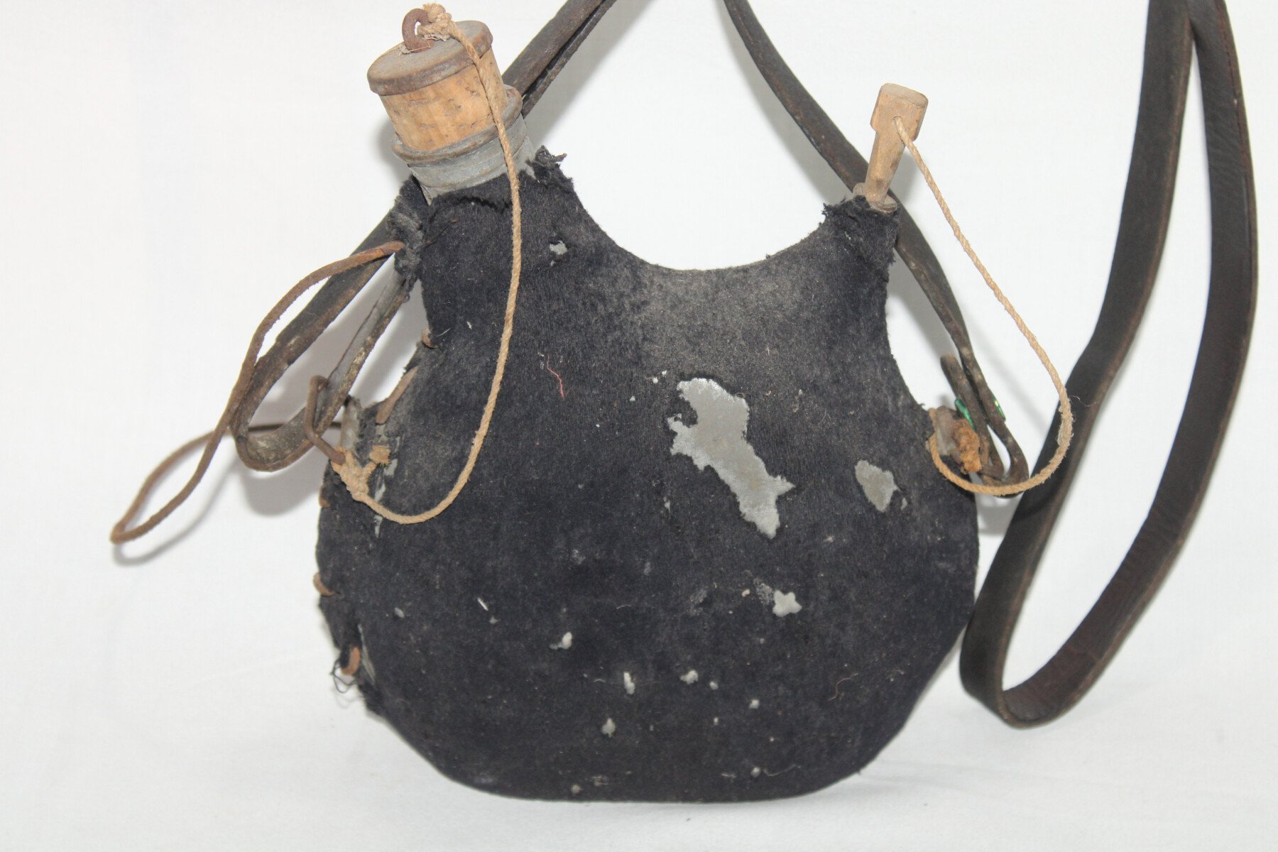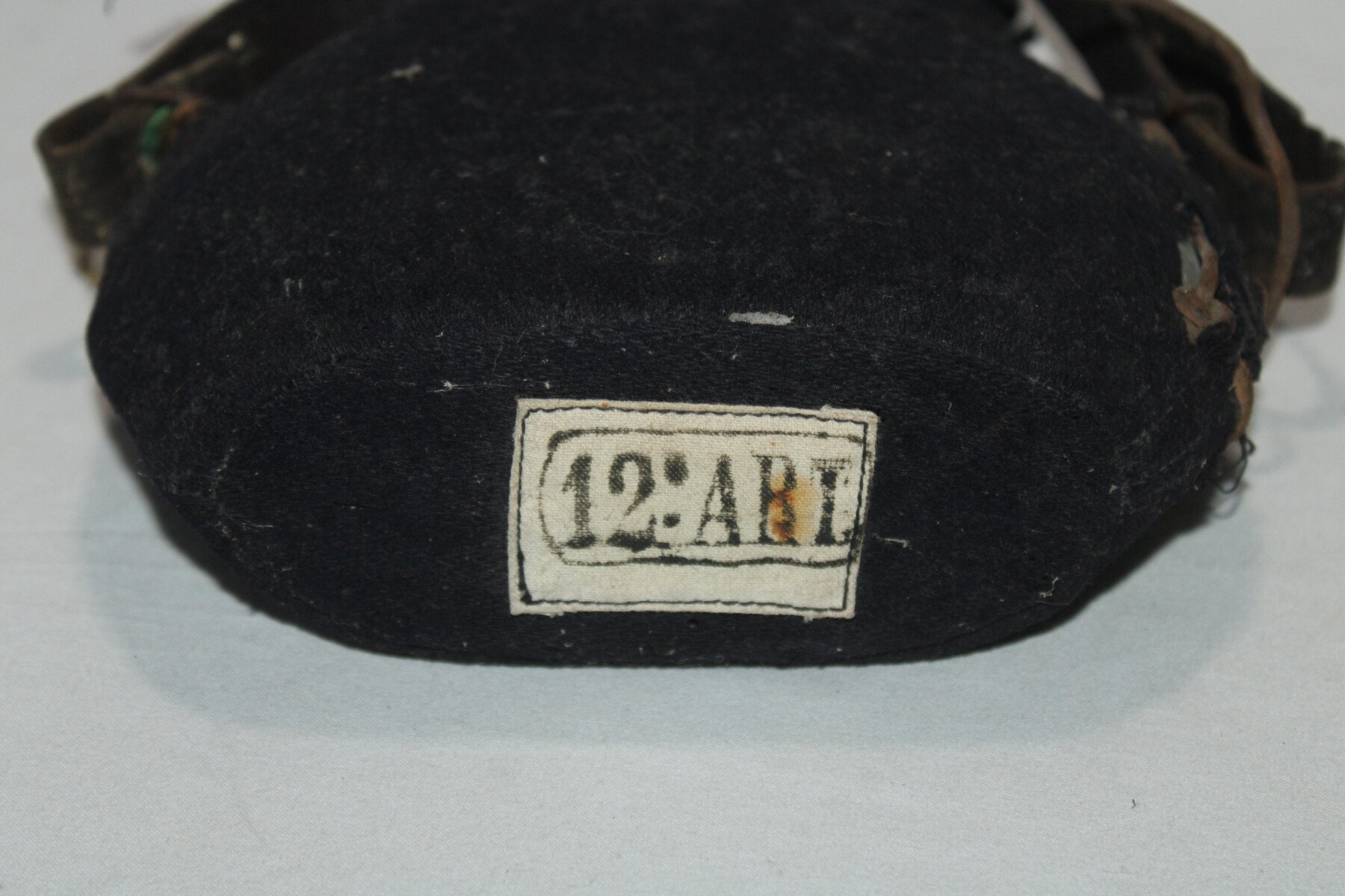 Gourde modèle 1877 de 1 litre drap de la housse couleur bleu, fabrication en trois partie, nombreux trous sur la housse. Régimenté au 12e d'artillerie. Le gros et le petit bouchon est présents. Sangle complète.