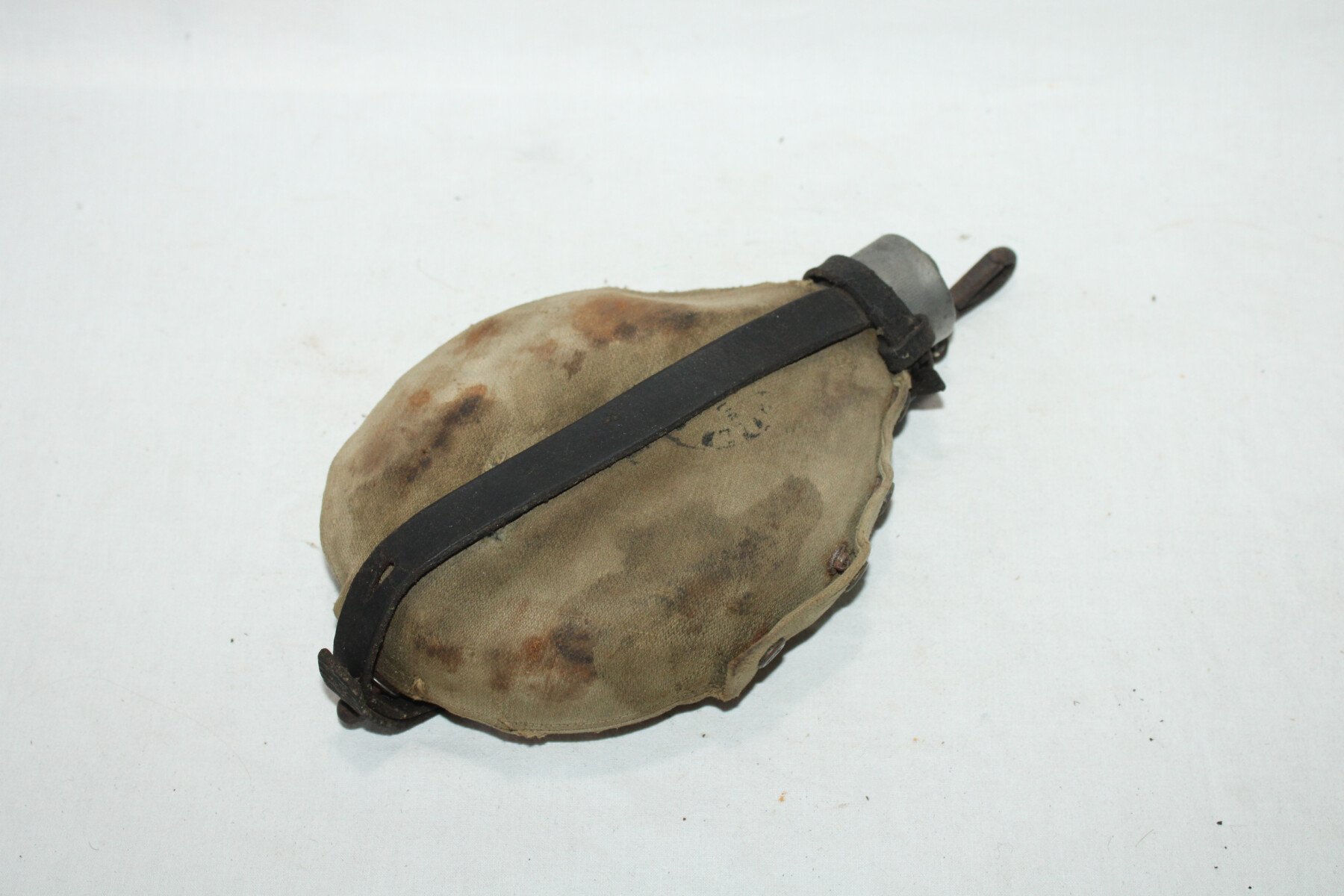 Gourde allemande complète avec son brelage. Bouchon de gourde daté 14, housse daté 1915. Deux déchirure sur la housse. Cuir souple a nourrir.