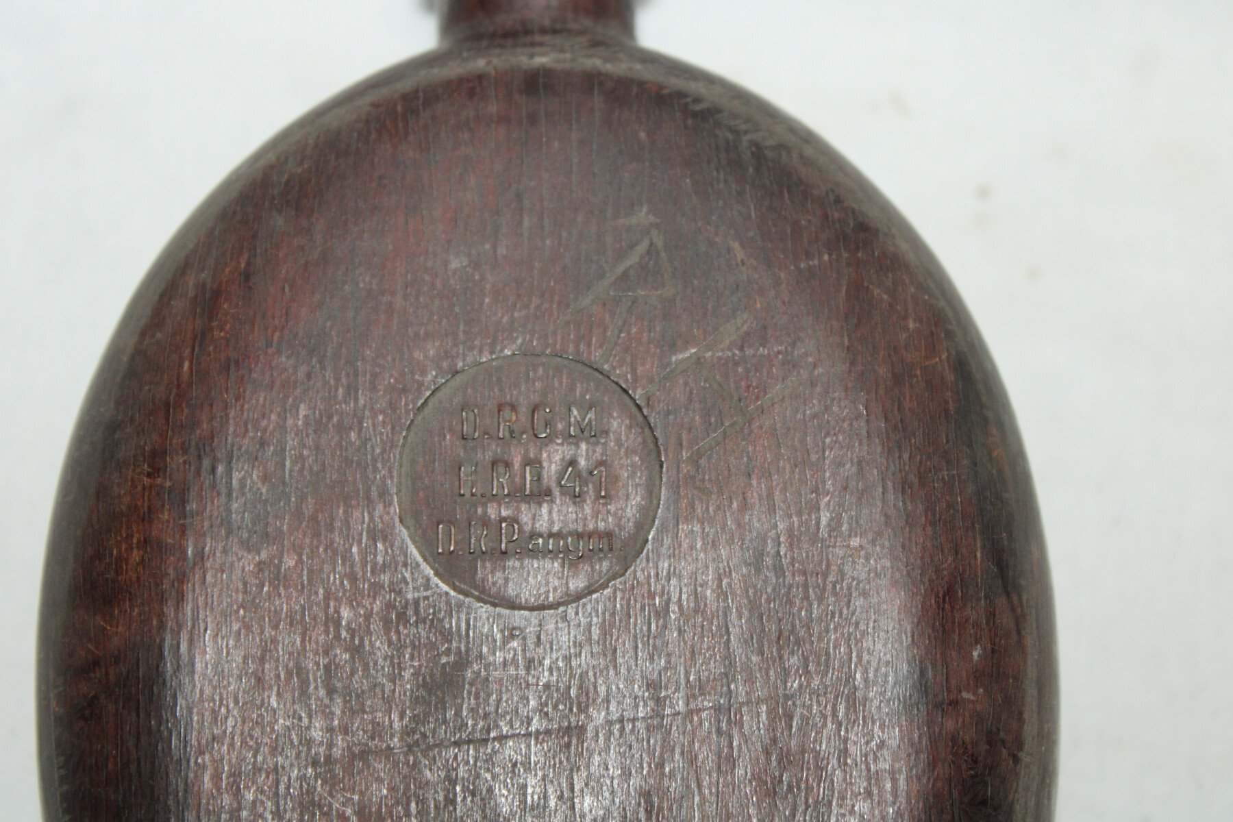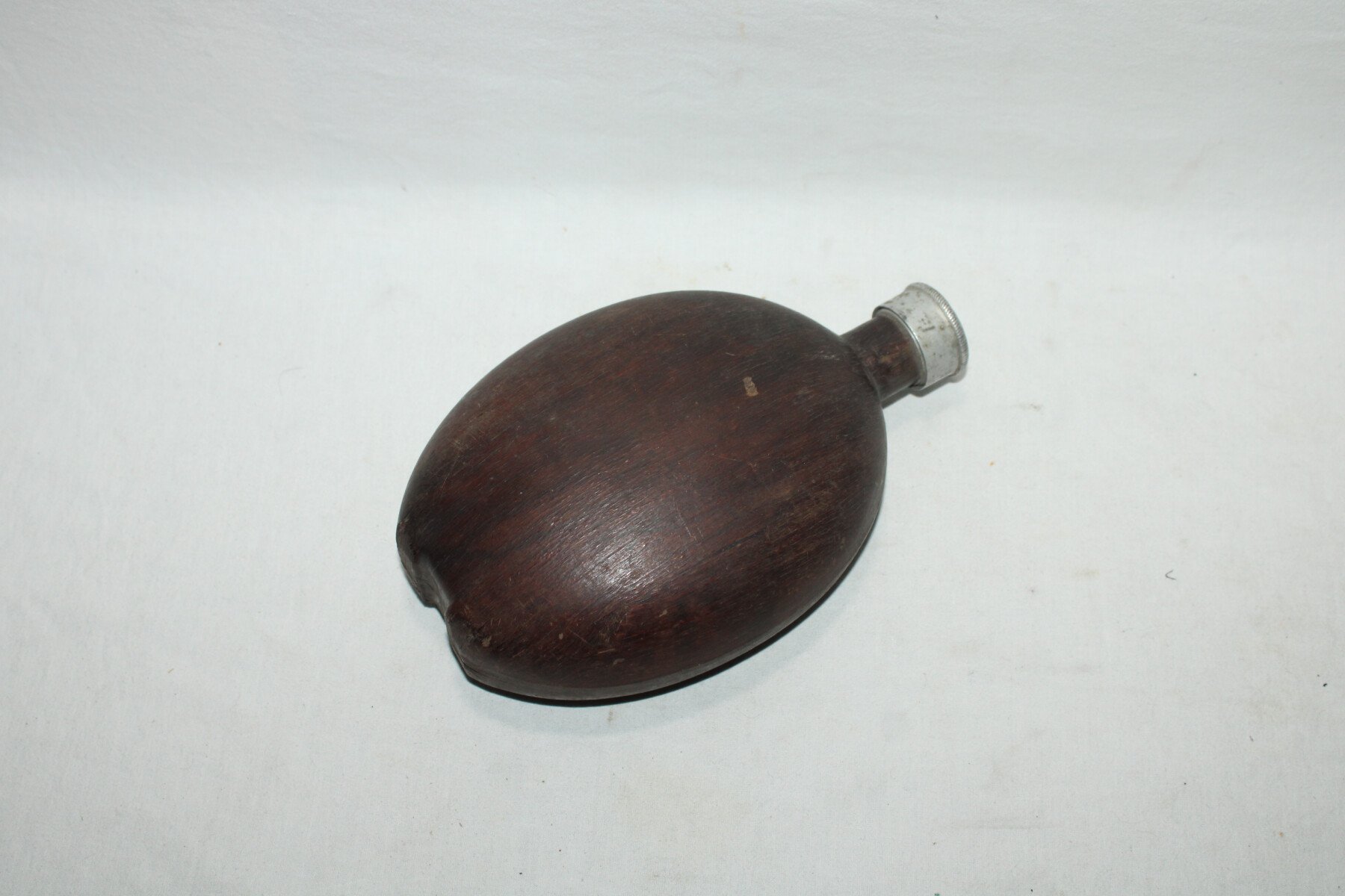 Gourde Coco en bois. Bon état, gourde daté 1941, bouchon daté 1934. Des initiales sur la gourde.