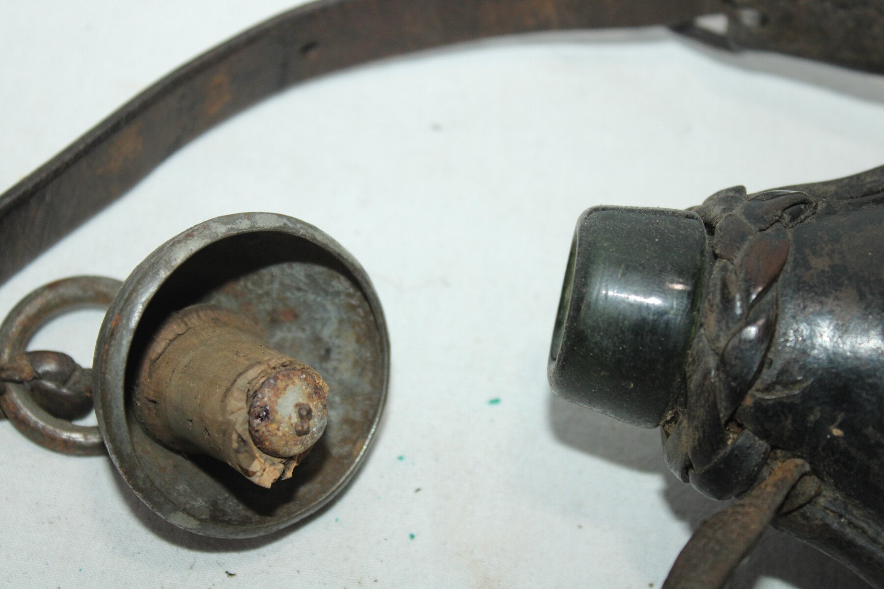 Gourde suisse modèle 1880 en verre recouvert de cuir. Cuir souple et verre non cassé.