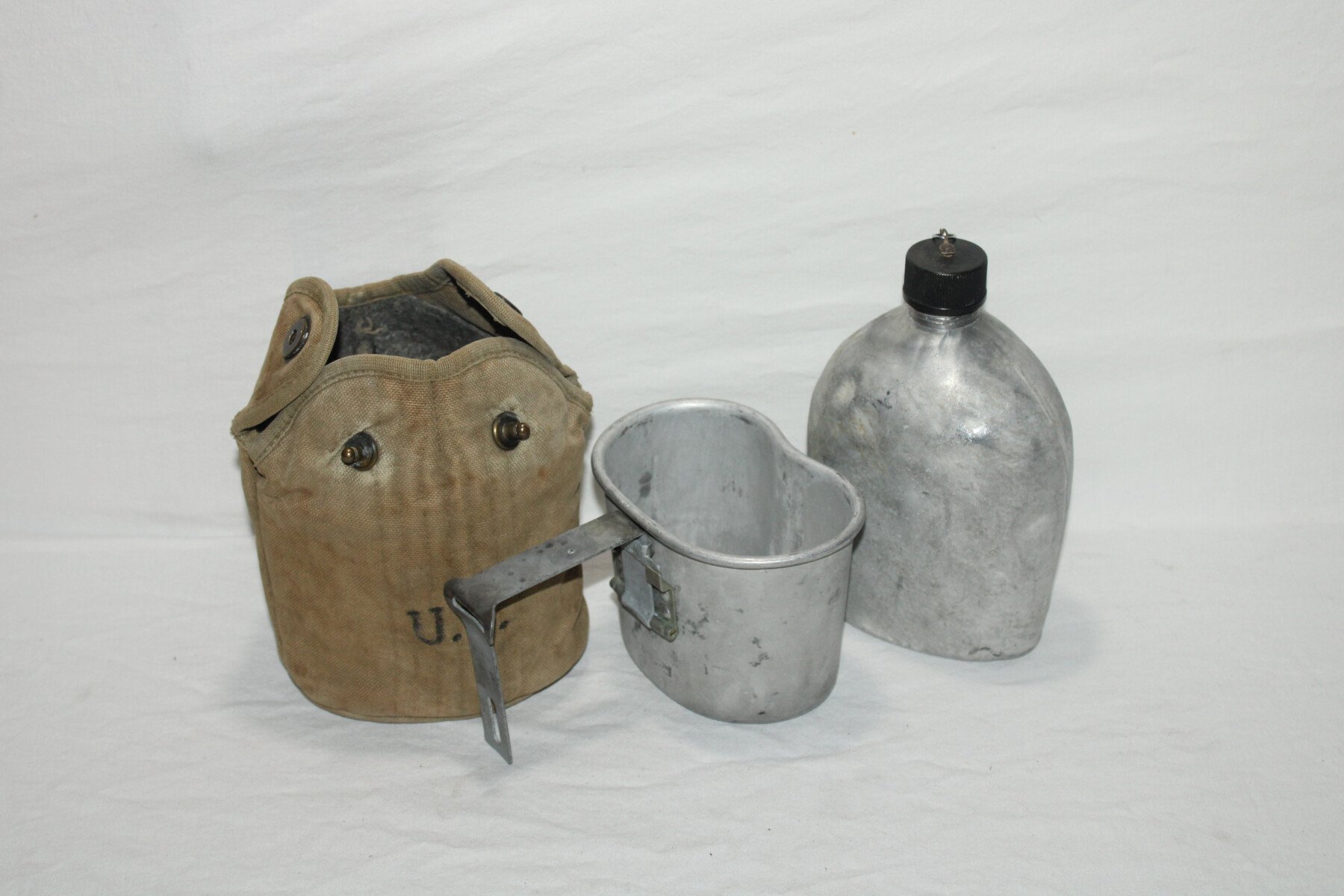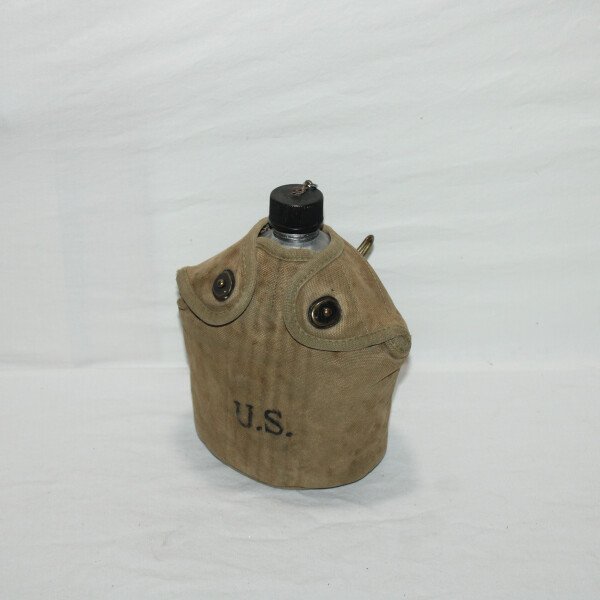 Gourde complète, housse OD3, date ilisible. Gourde modèle 1910 datée 1942 fabrication A.G.M.Co, bouchon en plastique 1er type. Quart non daté.
