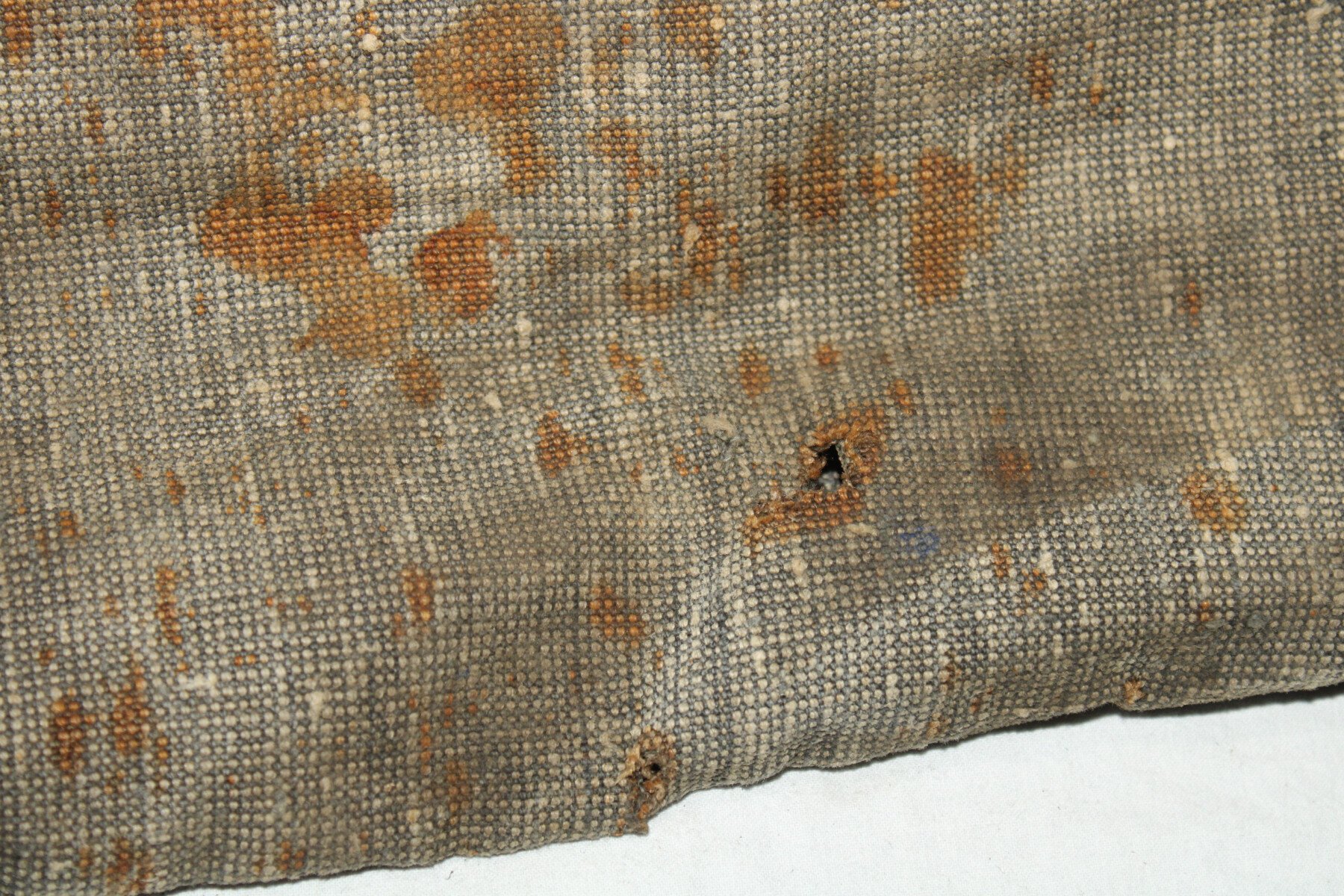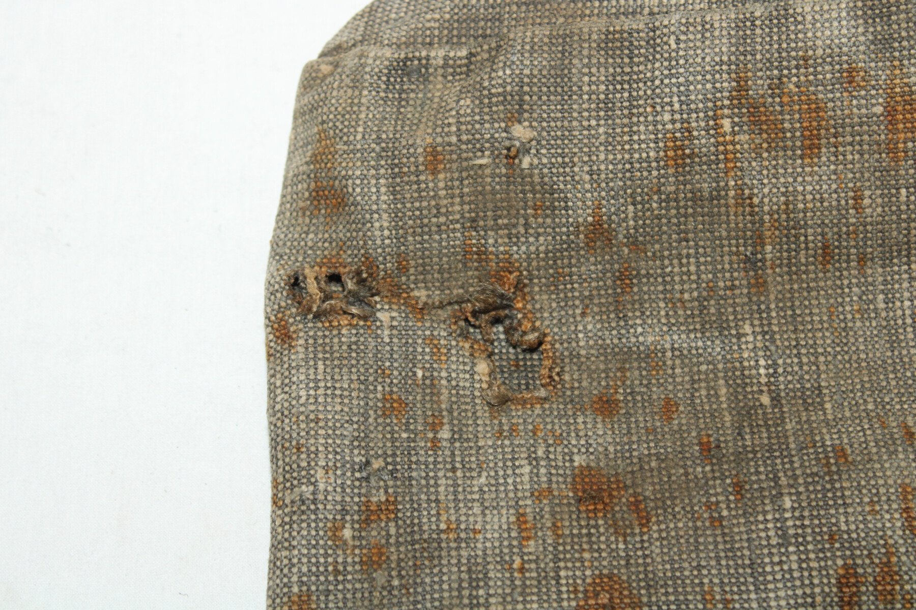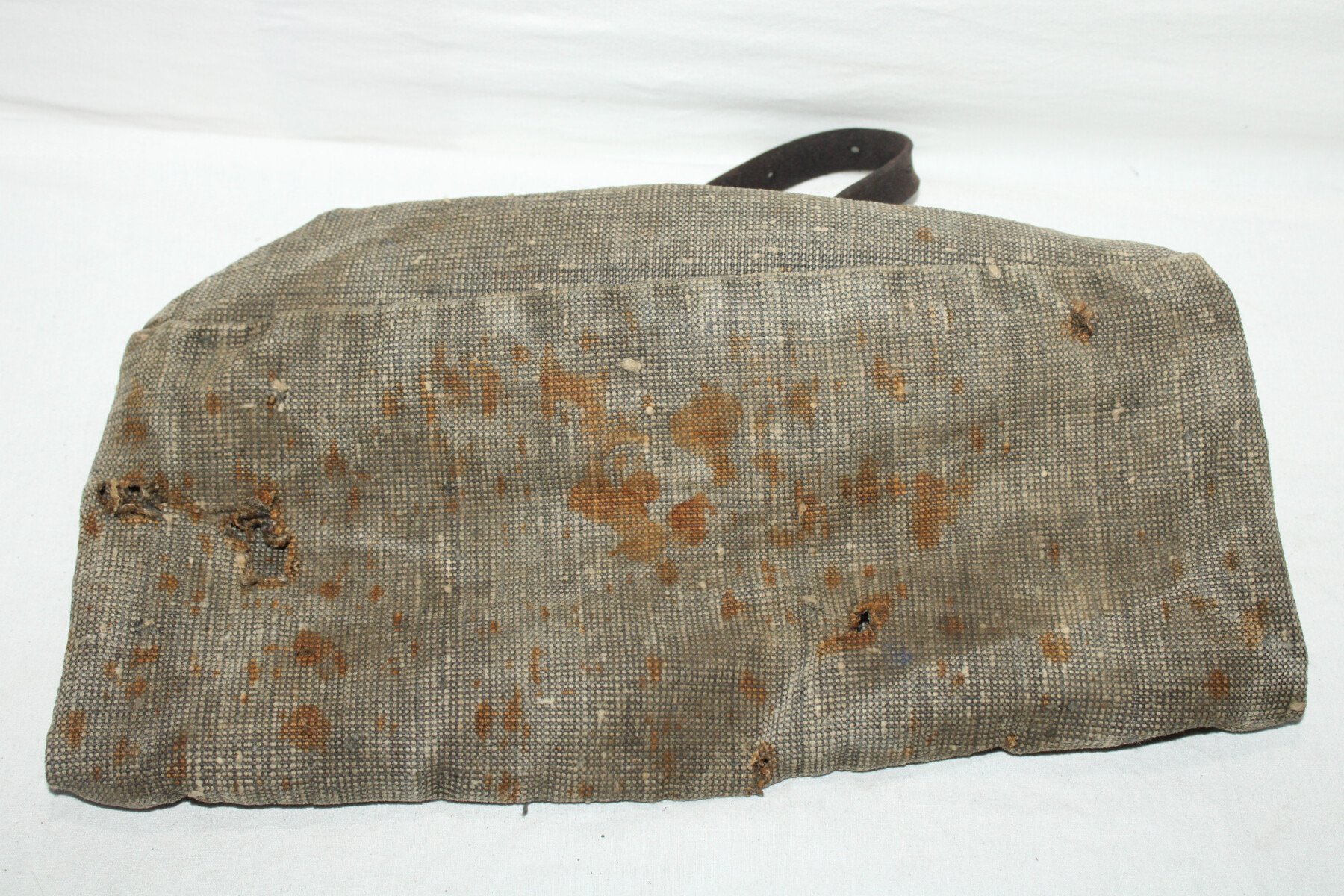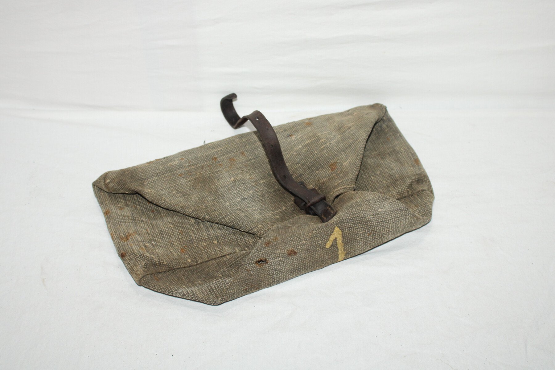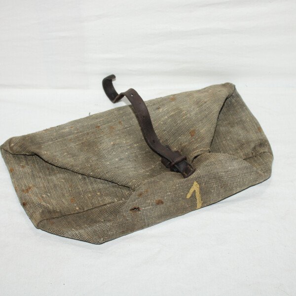 Housse en toile pour la tête d'affut de mitrailleuse Hotchkiss. Complet. Chiffre 1 peint. Plusieurs trous.
