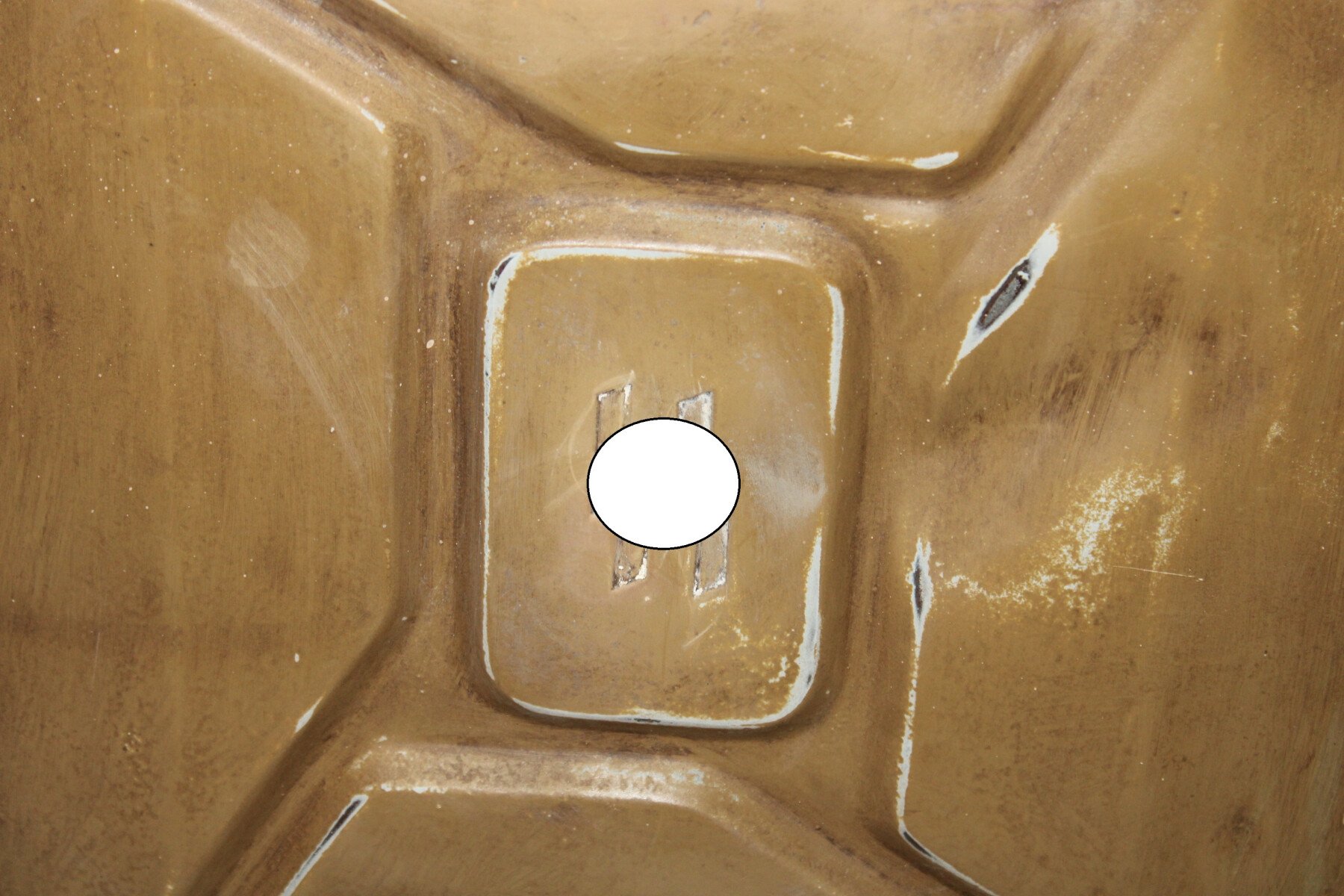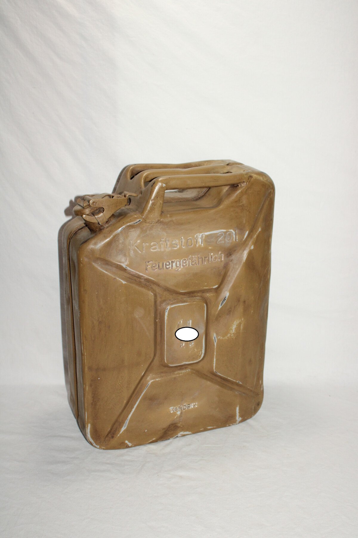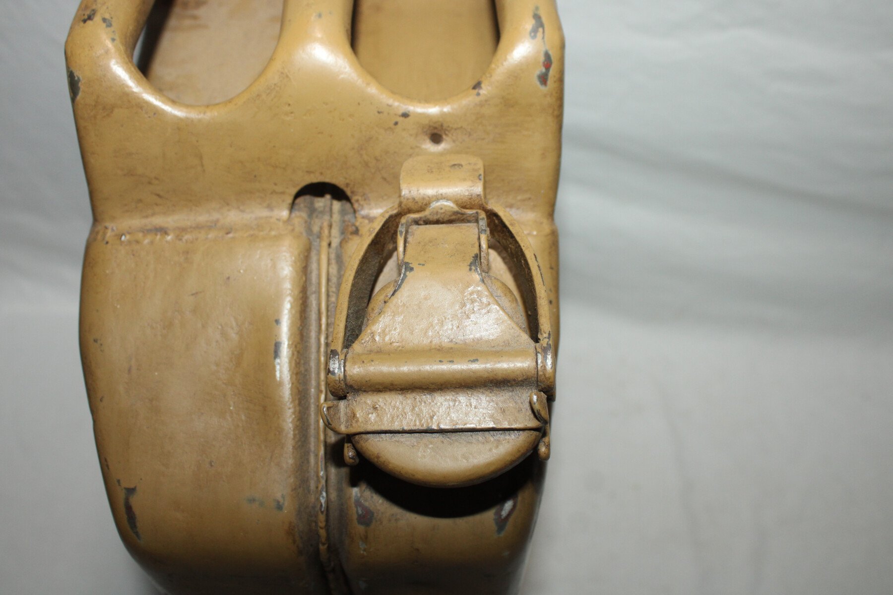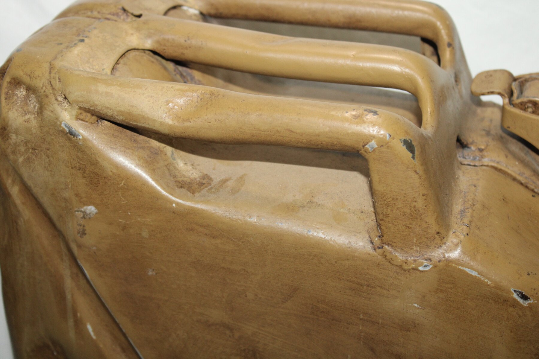 Jerrycan de fabrication pour la Waffen SS. Peinture sable non d'origine. Cabossé à plusieurs endroits. Un petit trous en dessous. Pièce authentique et garantie.
