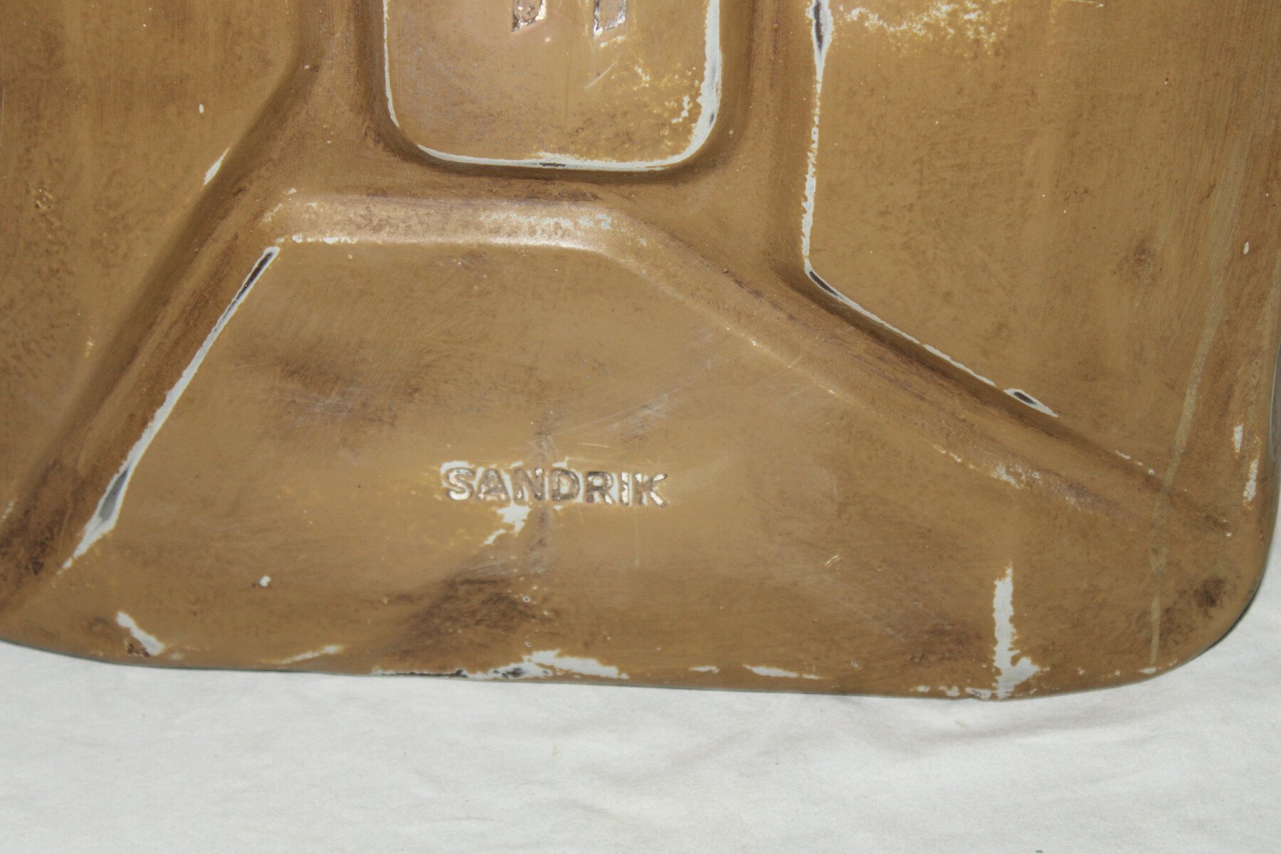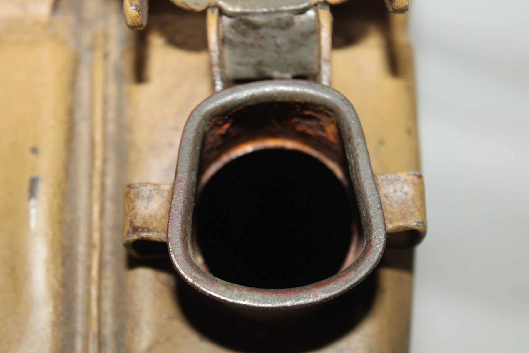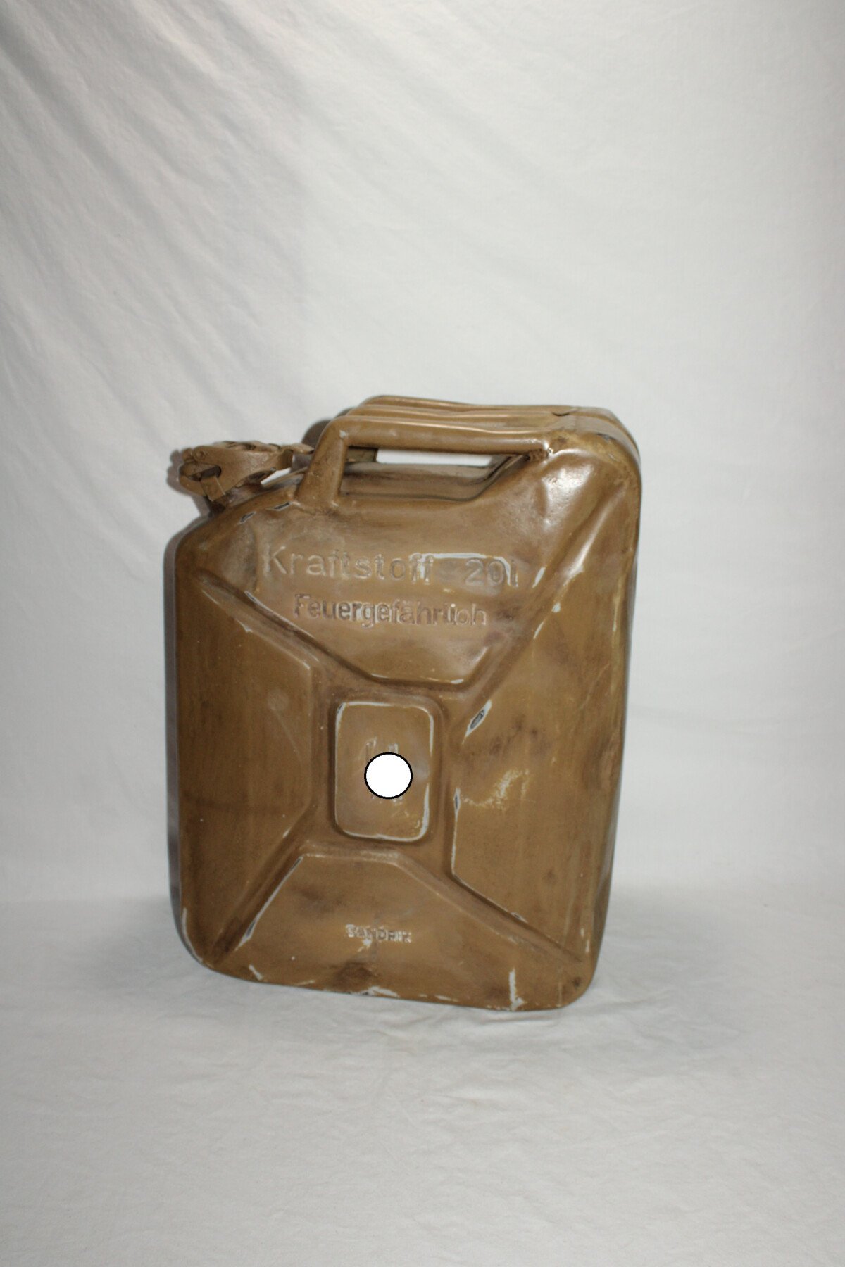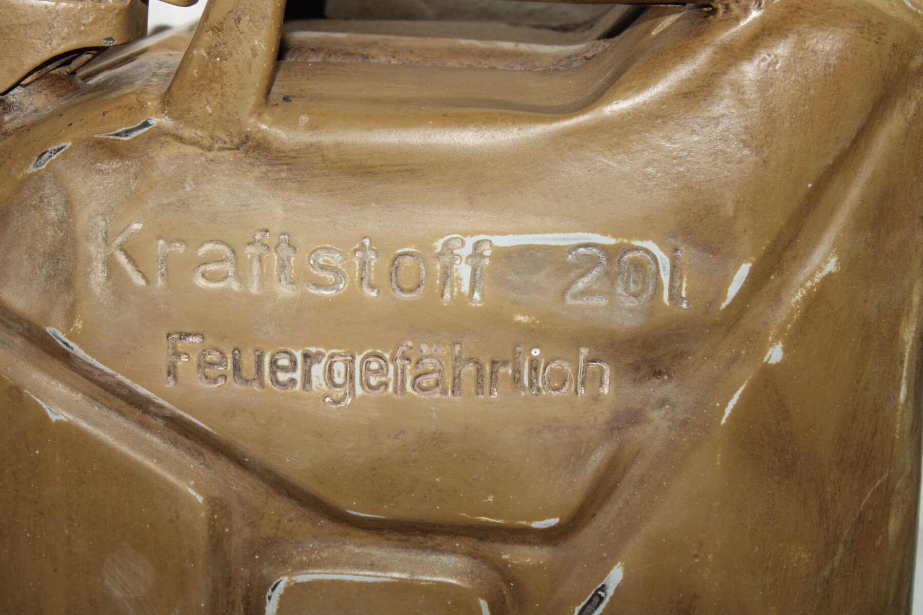 Jerrycan de fabrication pour la Waffen SS. Peinture sable non d'origine. Cabossé à plusieurs endroits. Un petit trous en dessous. Pièce authentique et garantie.