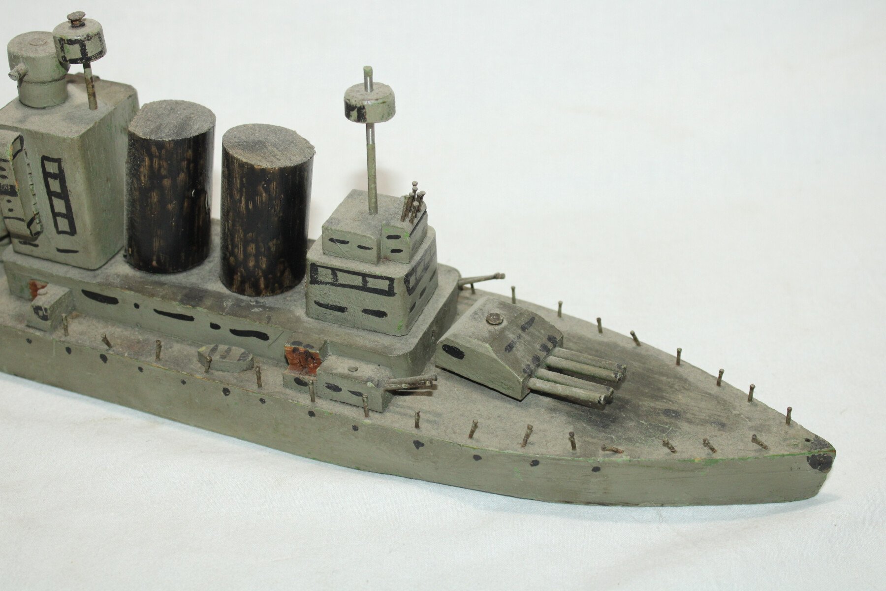 Petit jouet en bois représentant un cuirassé, quelque manque de bois. 45cm de long.
