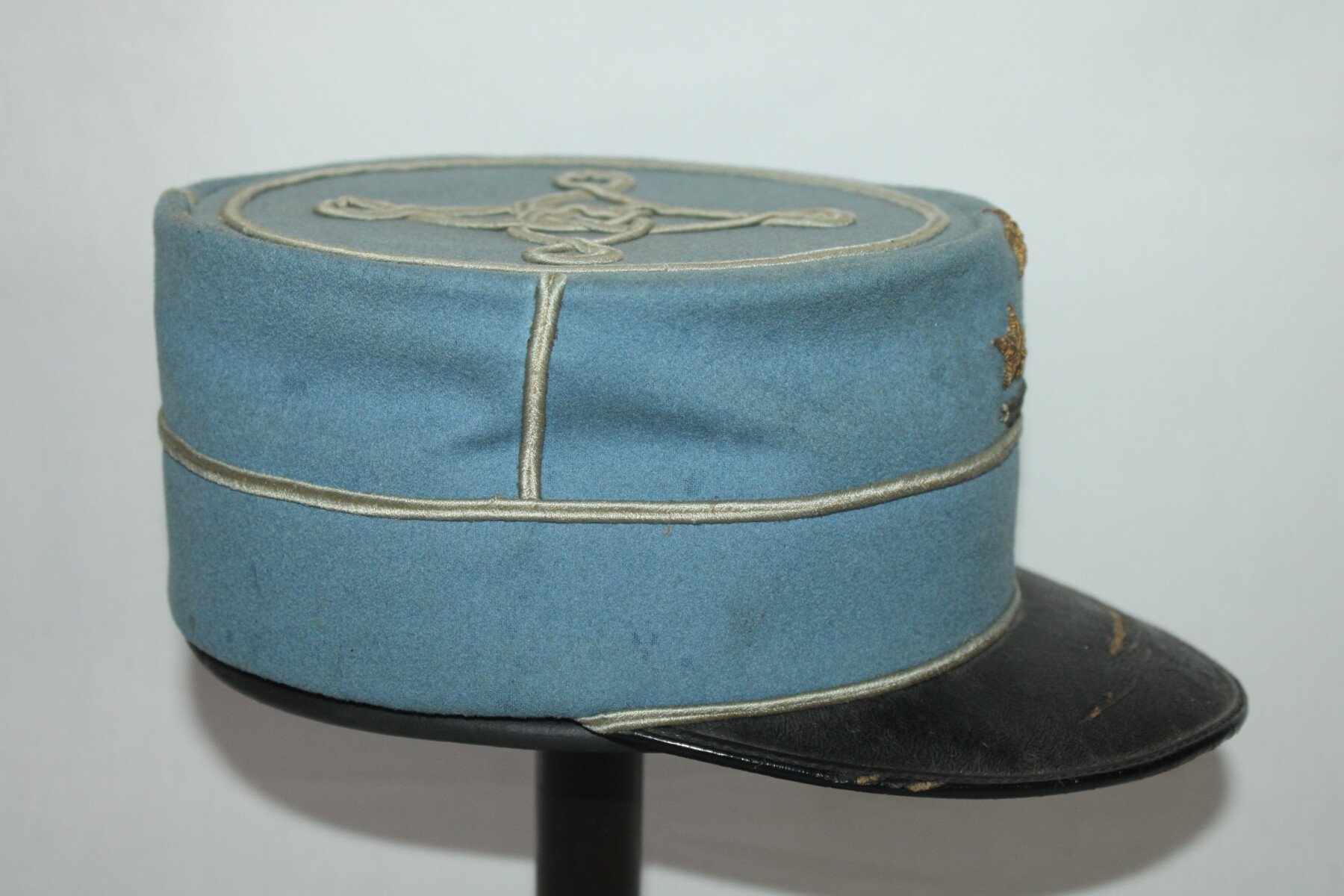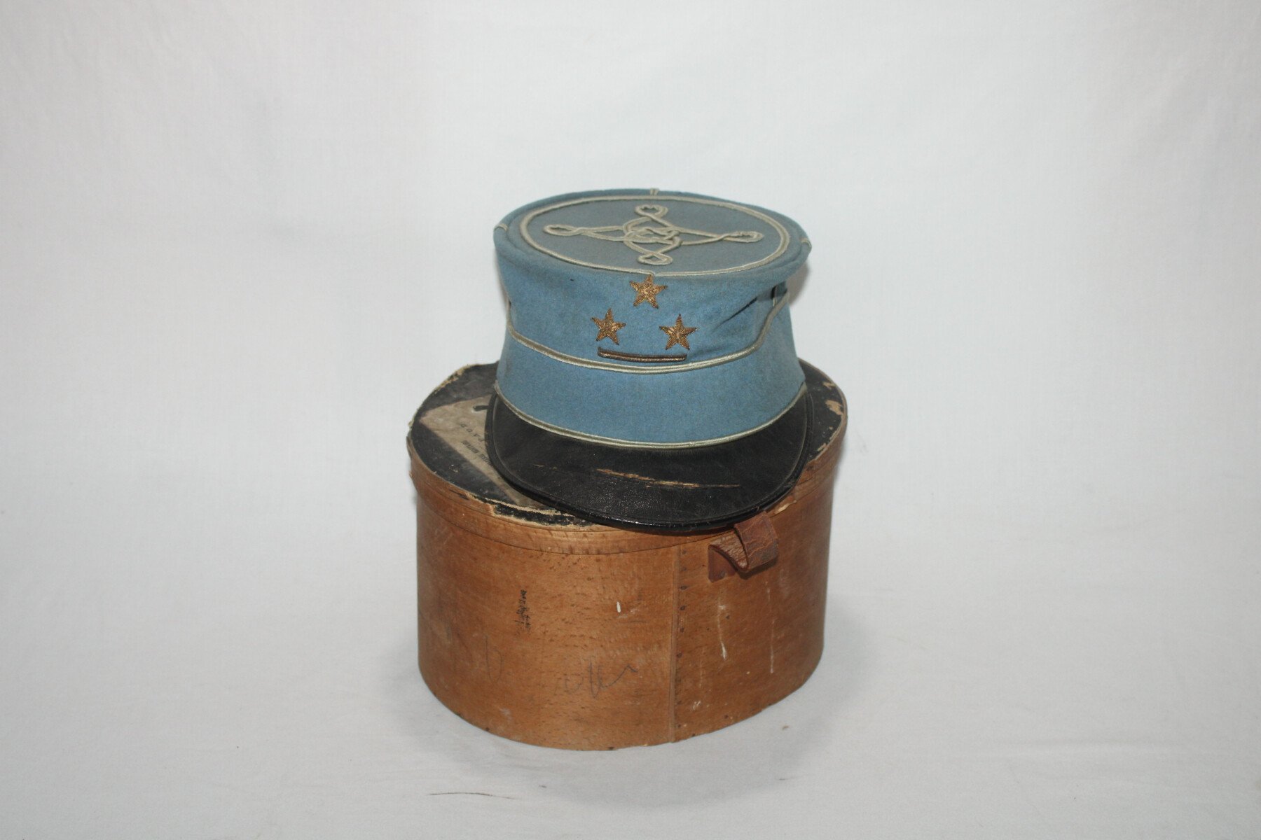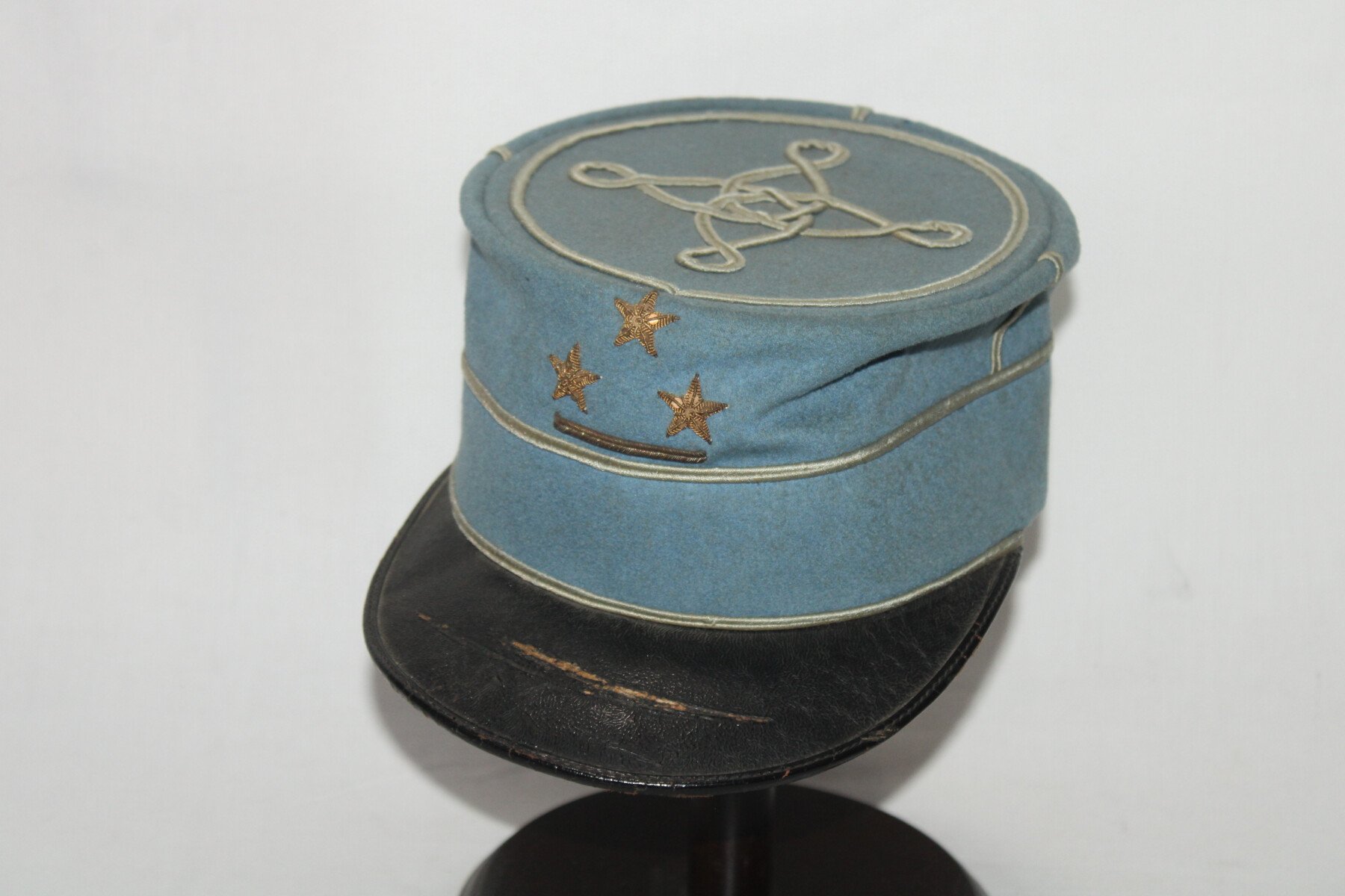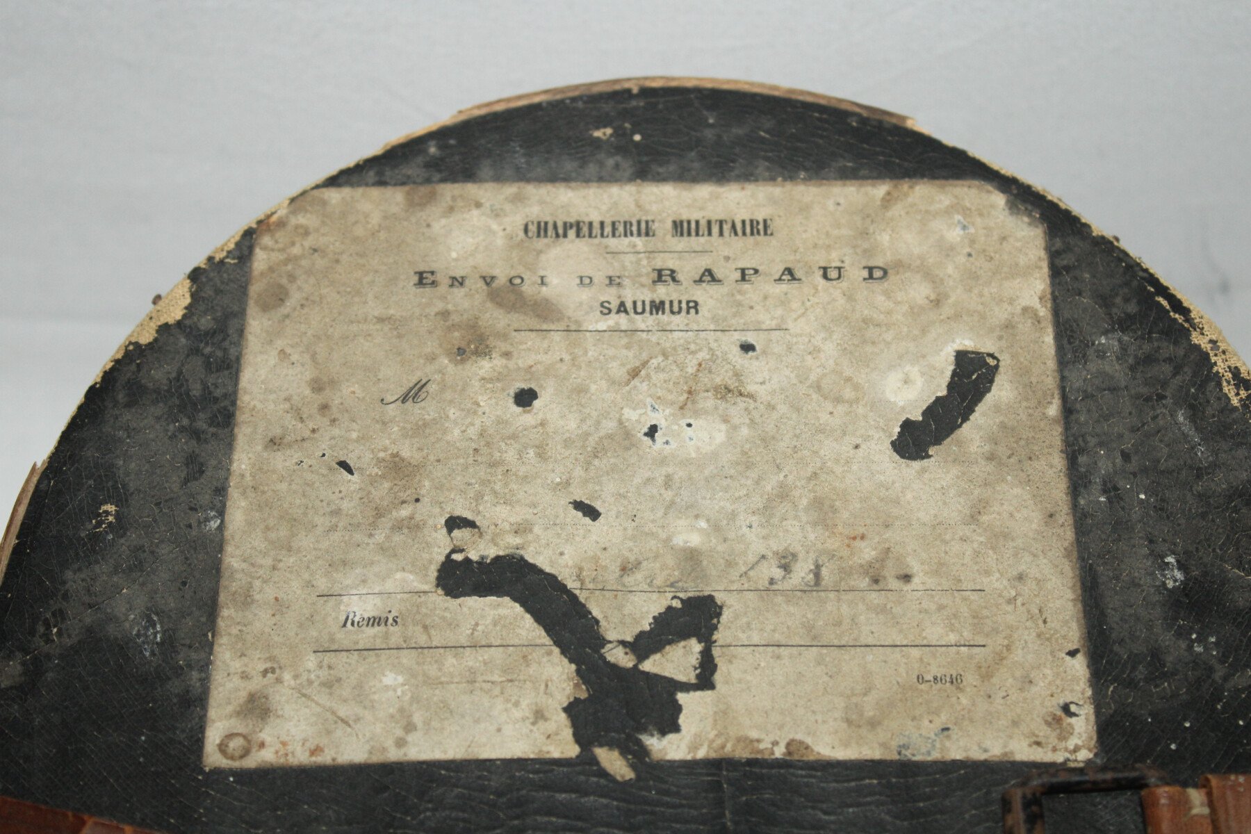 Rare képi de général de division avec commandement supérieur dans sa boite de transport. Coupe type Manchon en drap fin bleu horizon. Etoiles et barrette brodé. Un tous petit trou sur l'avant et quatre sur le dessus a l'arrière. Trace sur la visière. Taille 56 environs. Boite en bois, étiquette du fabricant Envoi de Rapaud Saumur chapellerie militaire. Lanière en partie cassé. Pas de nom inscrit sur la boite ou le Képi. Une belle pièce unique.