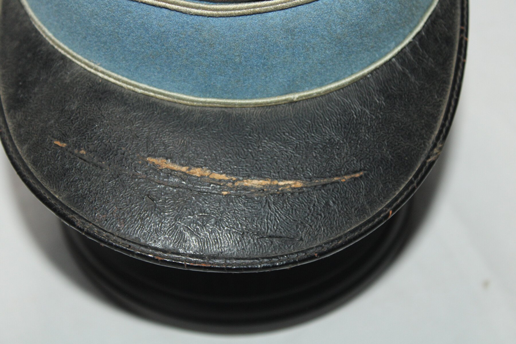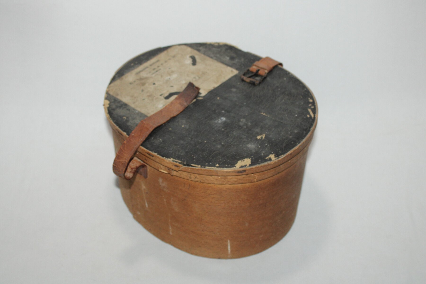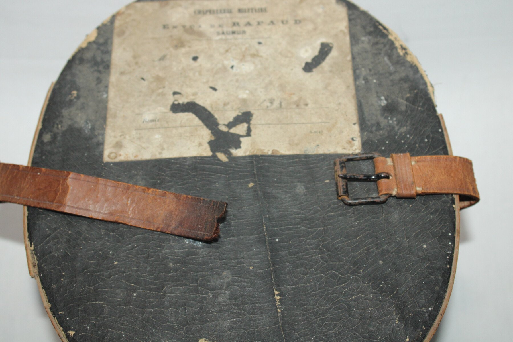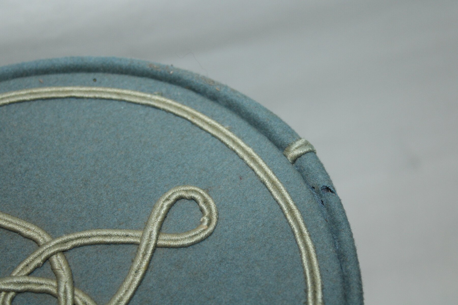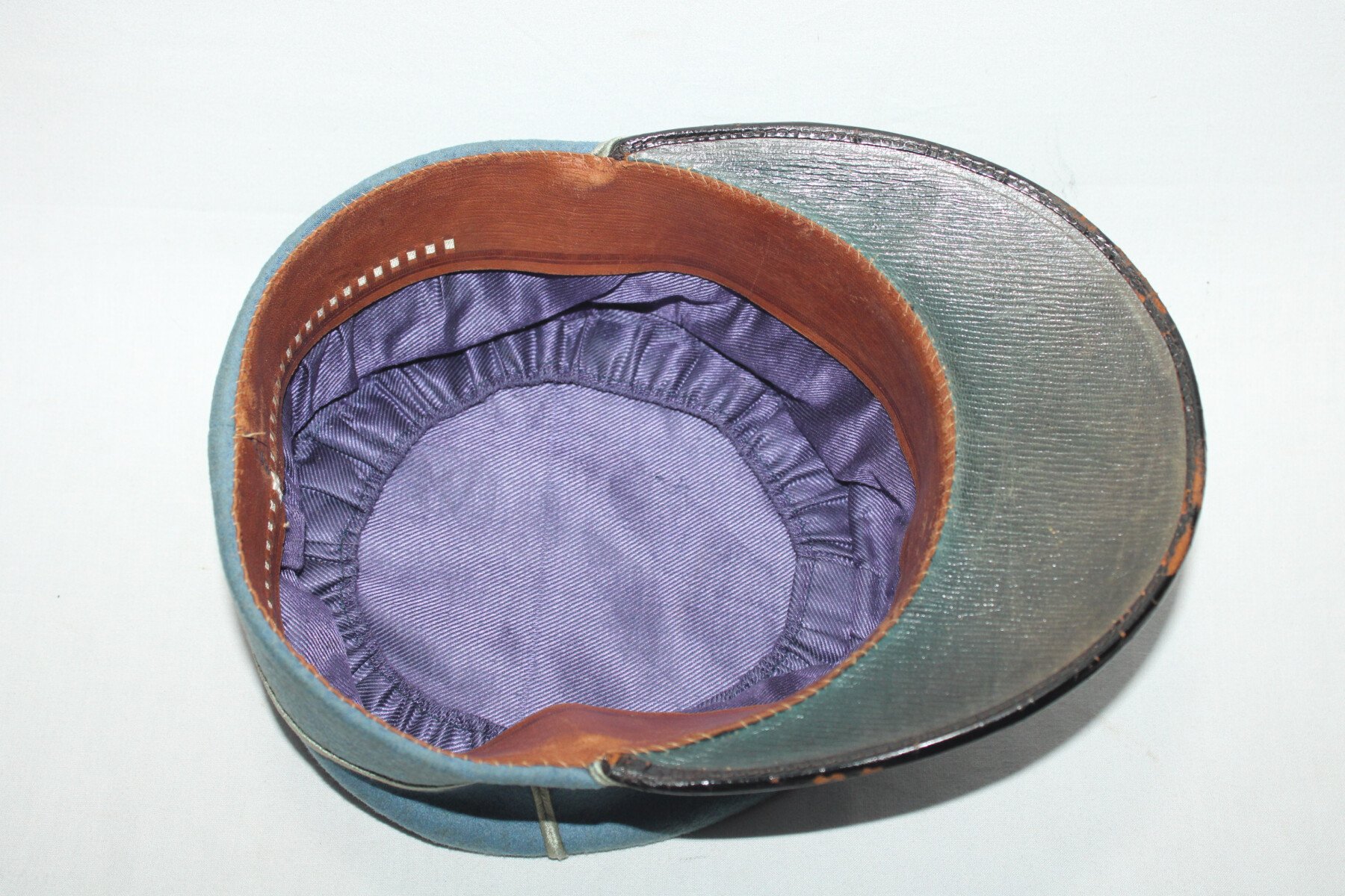 Rare képi de général de division avec commandement supérieur dans sa boite de transport. Coupe type Manchon en drap fin bleu horizon. Etoiles et barrette brodé. Un tous petit trou sur l'avant et quatre sur le dessus a l'arrière. Trace sur la visière. Taille 56 environs. Boite en bois, étiquette du fabricant Envoi de Rapaud Saumur chapellerie militaire. Lanière en partie cassé. Pas de nom inscrit sur la boite ou le Képi. Une belle pièce unique.