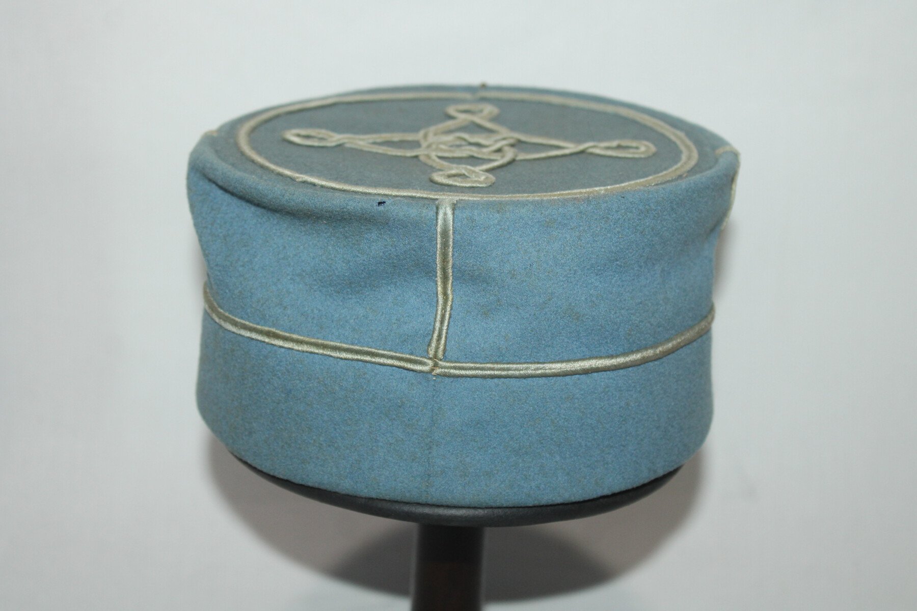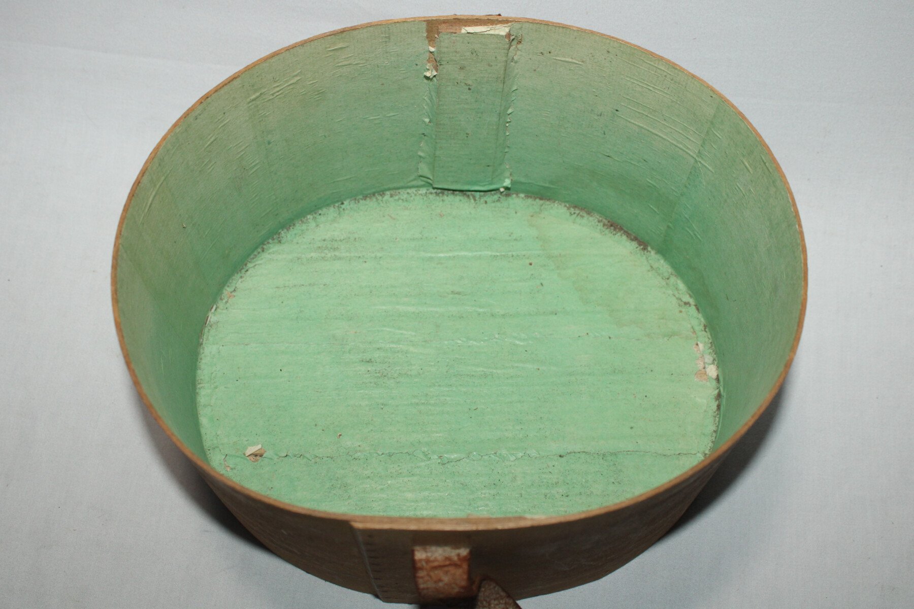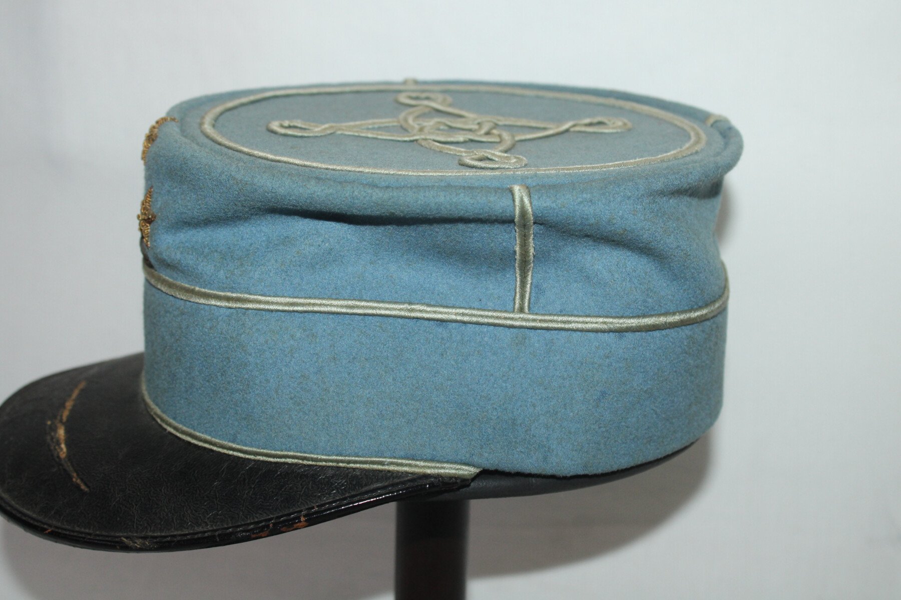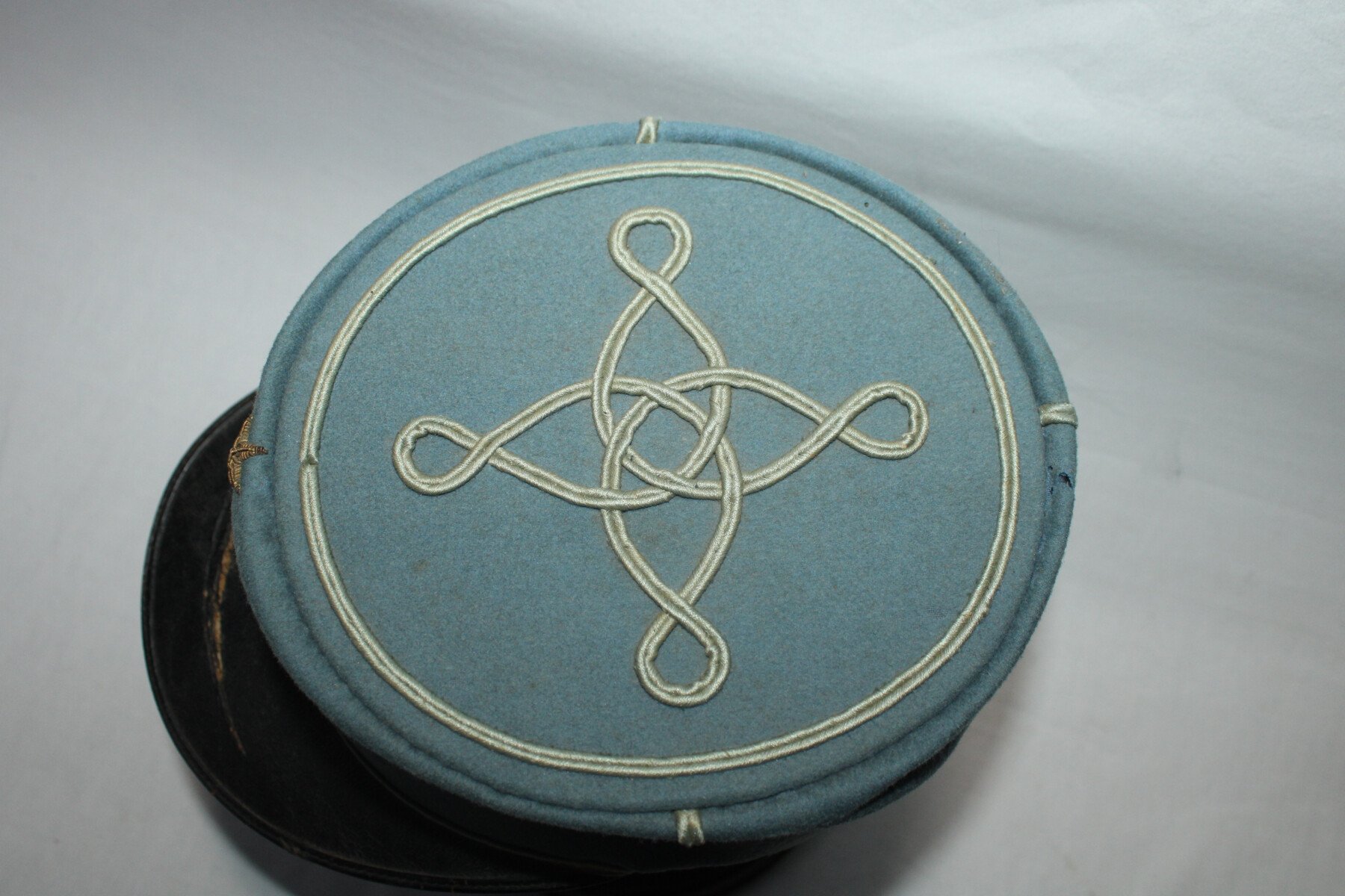 Rare képi de général de division avec commandement supérieur dans sa boite de transport. Coupe type Manchon en drap fin bleu horizon. Etoiles et barrette brodé. Un tous petit trou sur l'avant et quatre sur le dessus a l'arrière. Trace sur la visière. Taille 56 environs. Boite en bois, étiquette du fabricant Envoi de Rapaud Saumur chapellerie militaire. Lanière en partie cassé. Pas de nom inscrit sur la boite ou le Képi. Une belle pièce unique.