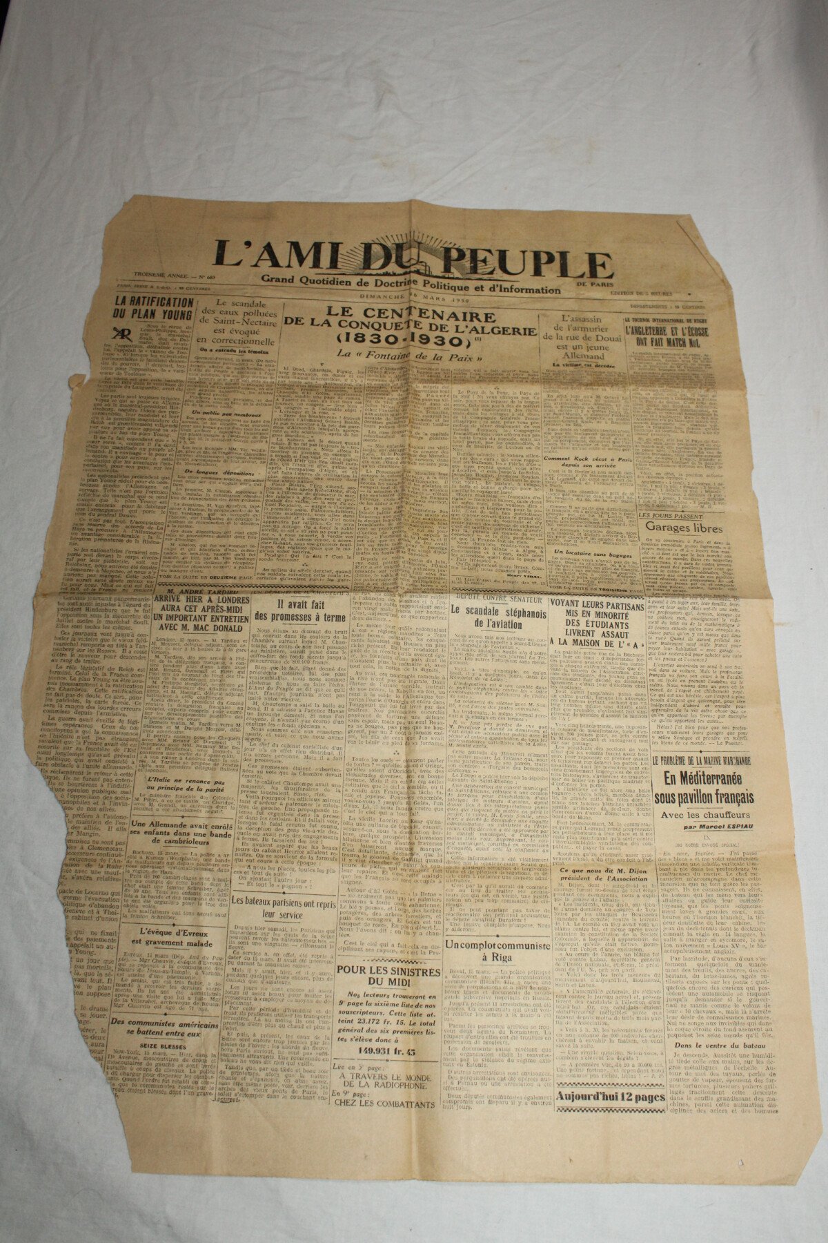 journal "L'ami du peuple" du dimanche 16 mars 1930. 1 page, idéal à présenter sous verre.