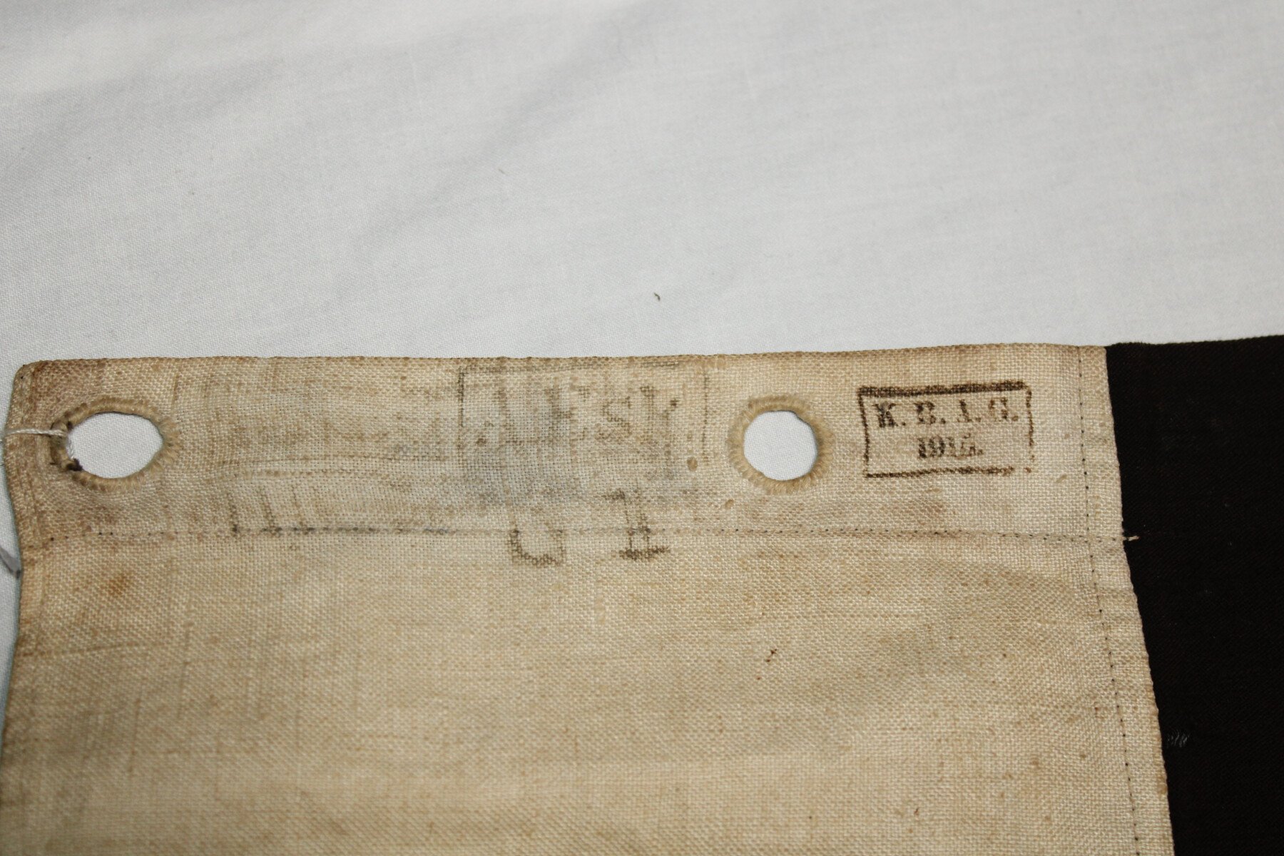 Lance de Cavalerie prussienne avec drapeau. Pas de marquage visible. Hampe en bois. Hauteur total 320cm. Marquage sur le drapeau peu lisible. Daté 1915. Plusieurs petit trous. Système d'attache...