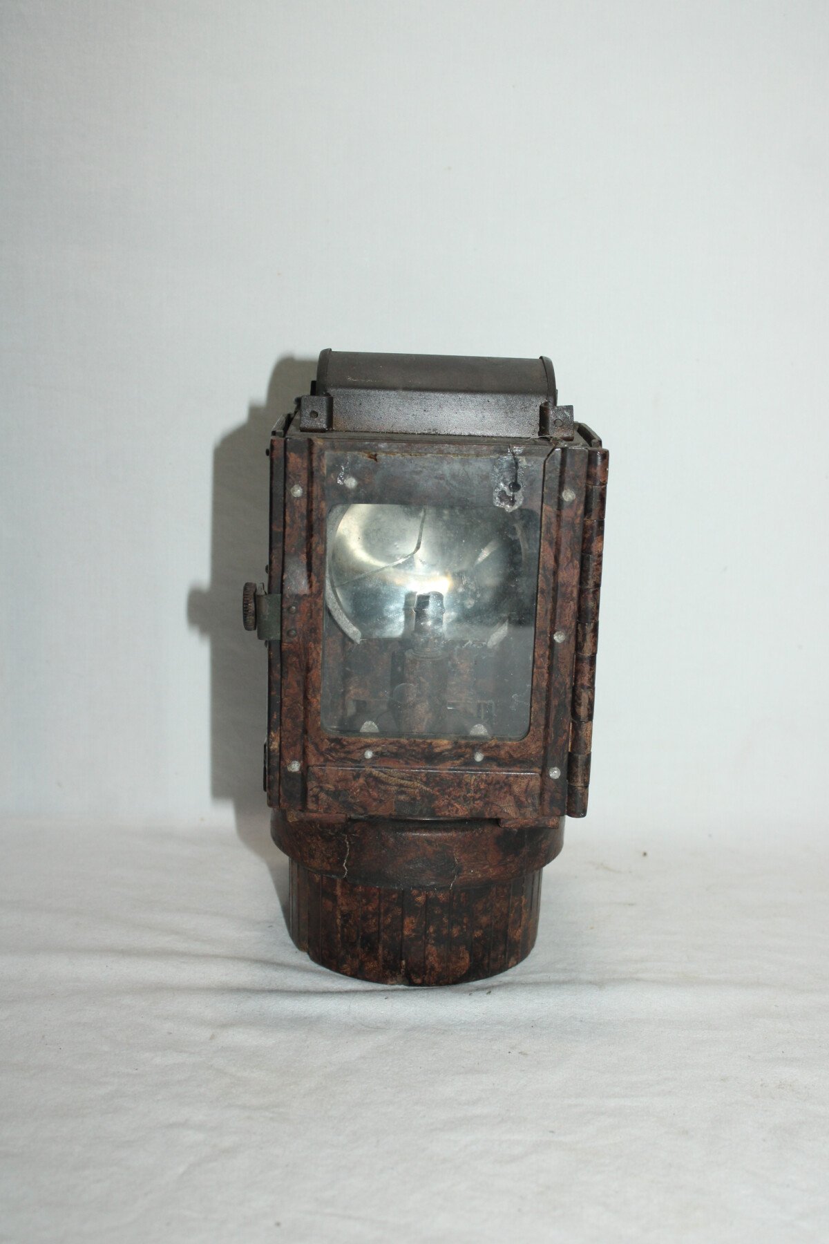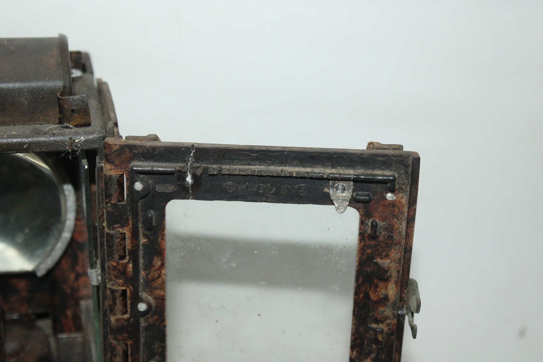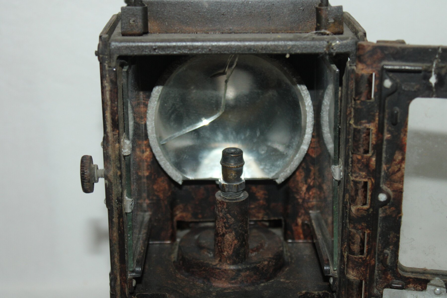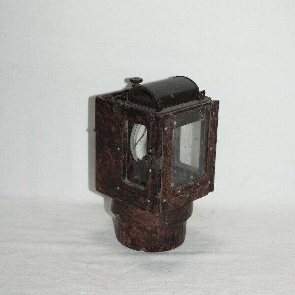 Lanterne à carbure en bakélite. Nombreuse pièce manquante. Carreaux présent. Miroir fêlé. Waffenamt sur le crochet arrière.