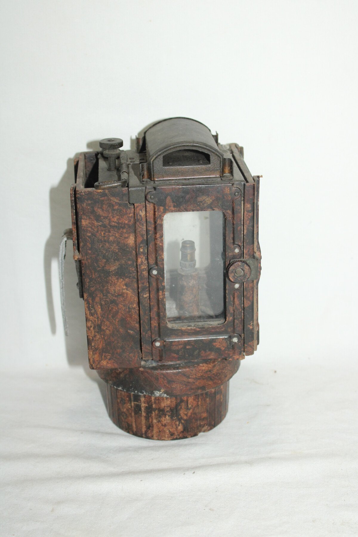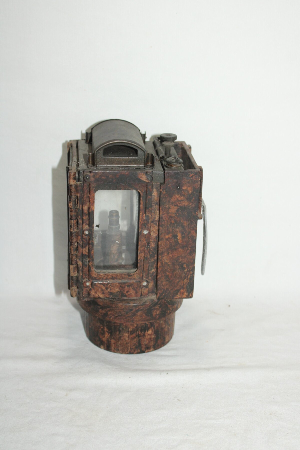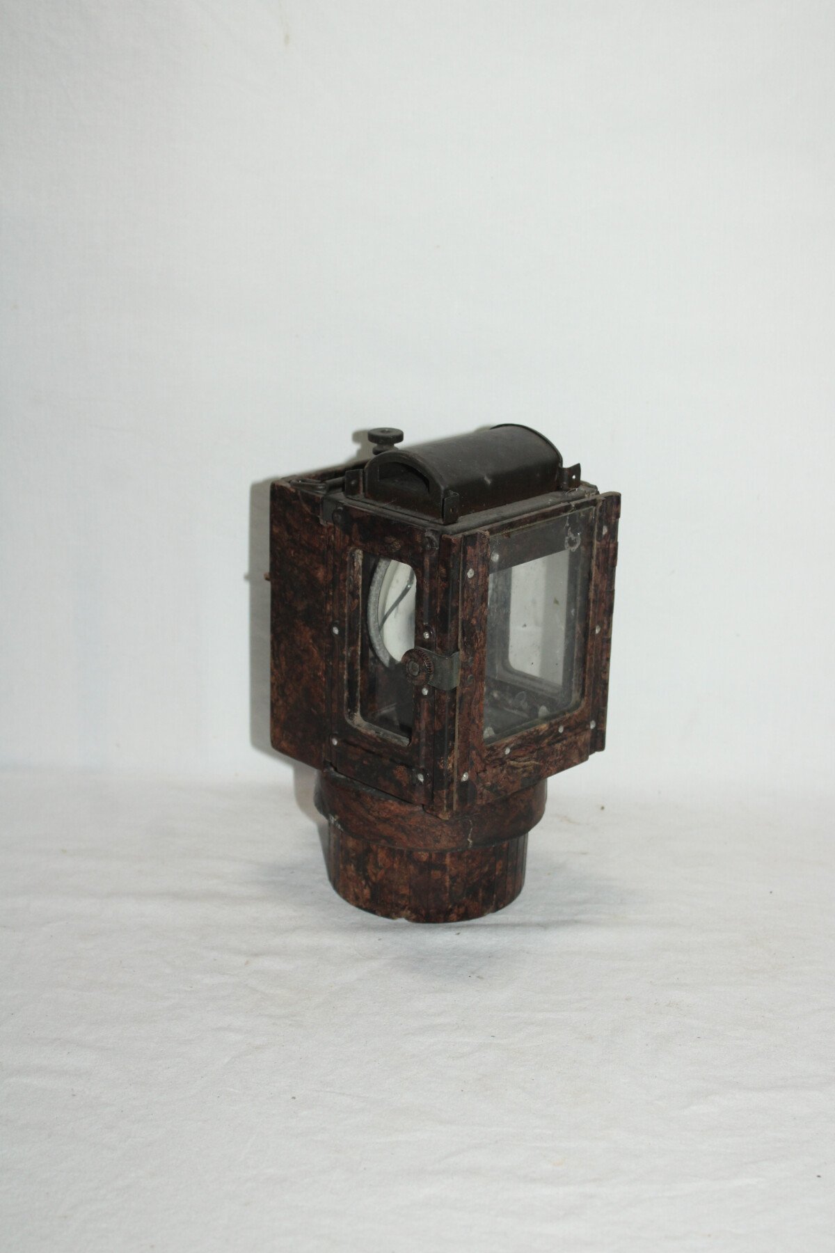 Lanterne à carbure en bakélite. Nombreuse pièce manquante. Carreaux présent. Miroir fêlé. Waffenamt sur le crochet arrière.