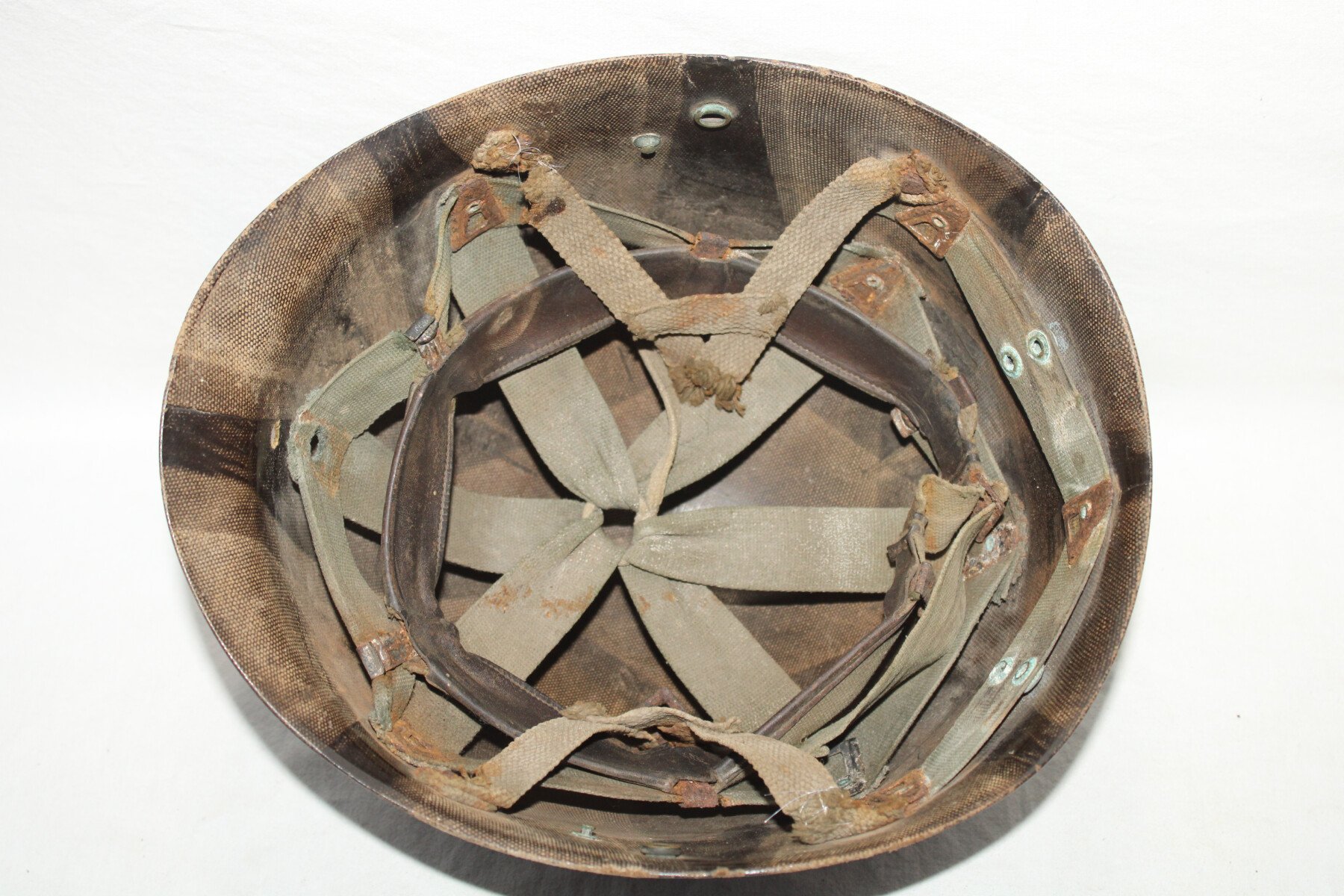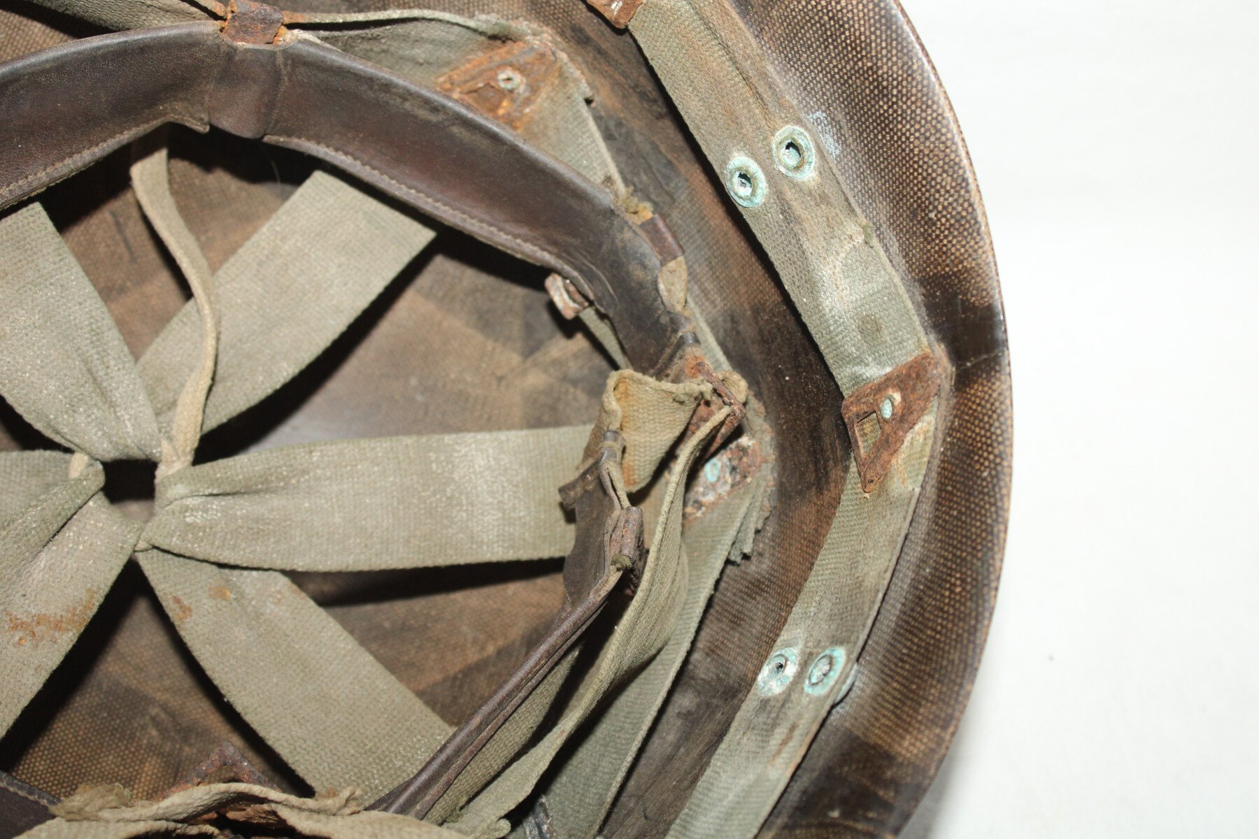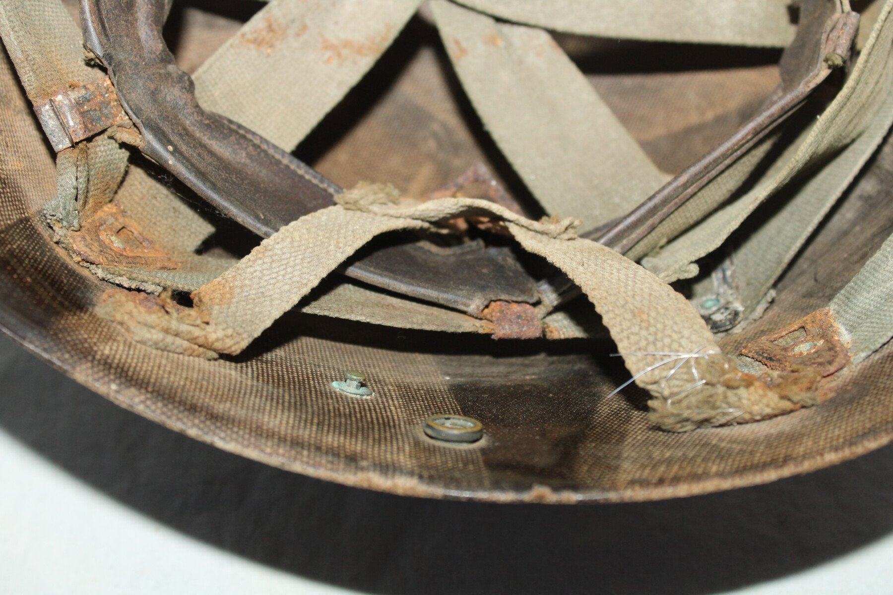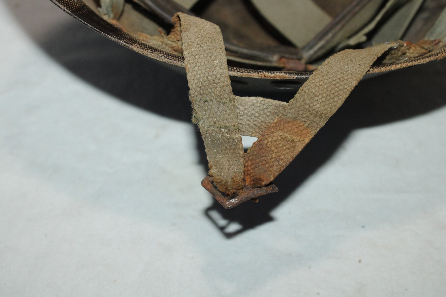 Liner de casque M1 modifié parachutiste période guerre de Corée. Liner fabrication Firestone. Nuquière et rivet frontal absent. Sangle en A inversé abimé, réparé a deux endroits, une boucle absente. Abimé sur le dessus de la coque.