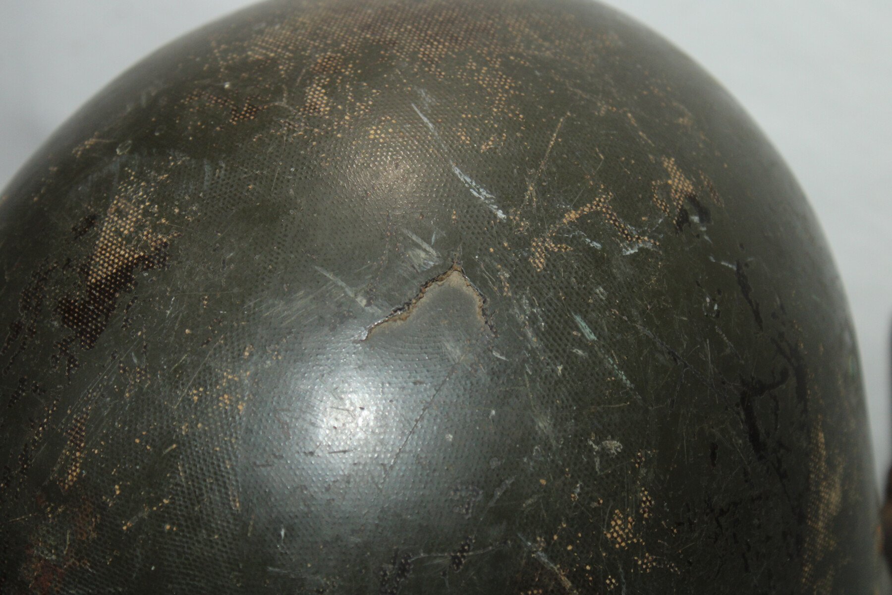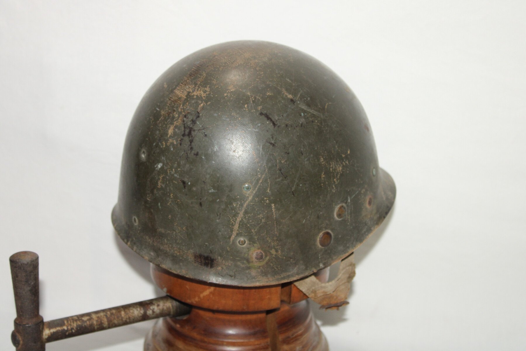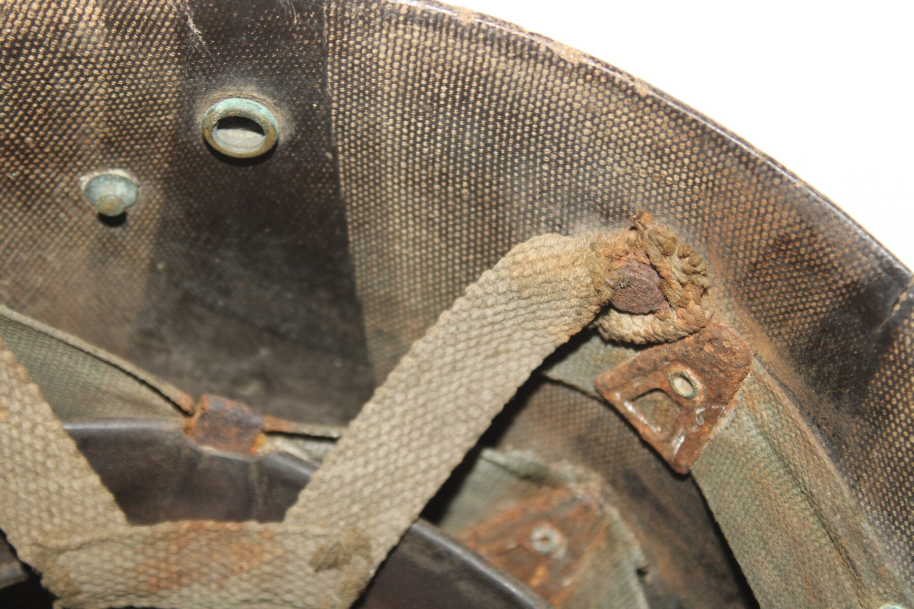 Liner de casque M1 modifié parachutiste période guerre de Corée. Liner fabrication Firestone. Nuquière et rivet frontal absent. Sangle en A inversé abimé, réparé a deux endroits, une boucle absente. Abimé sur le dessus de la coque.