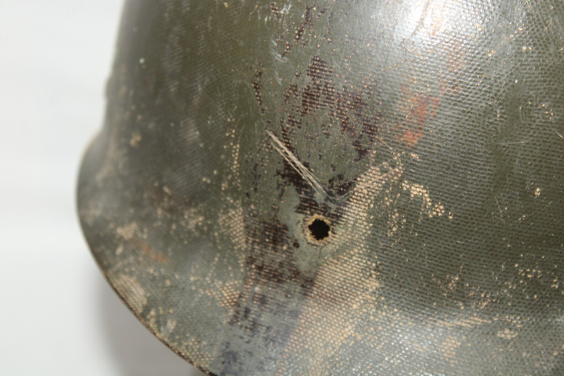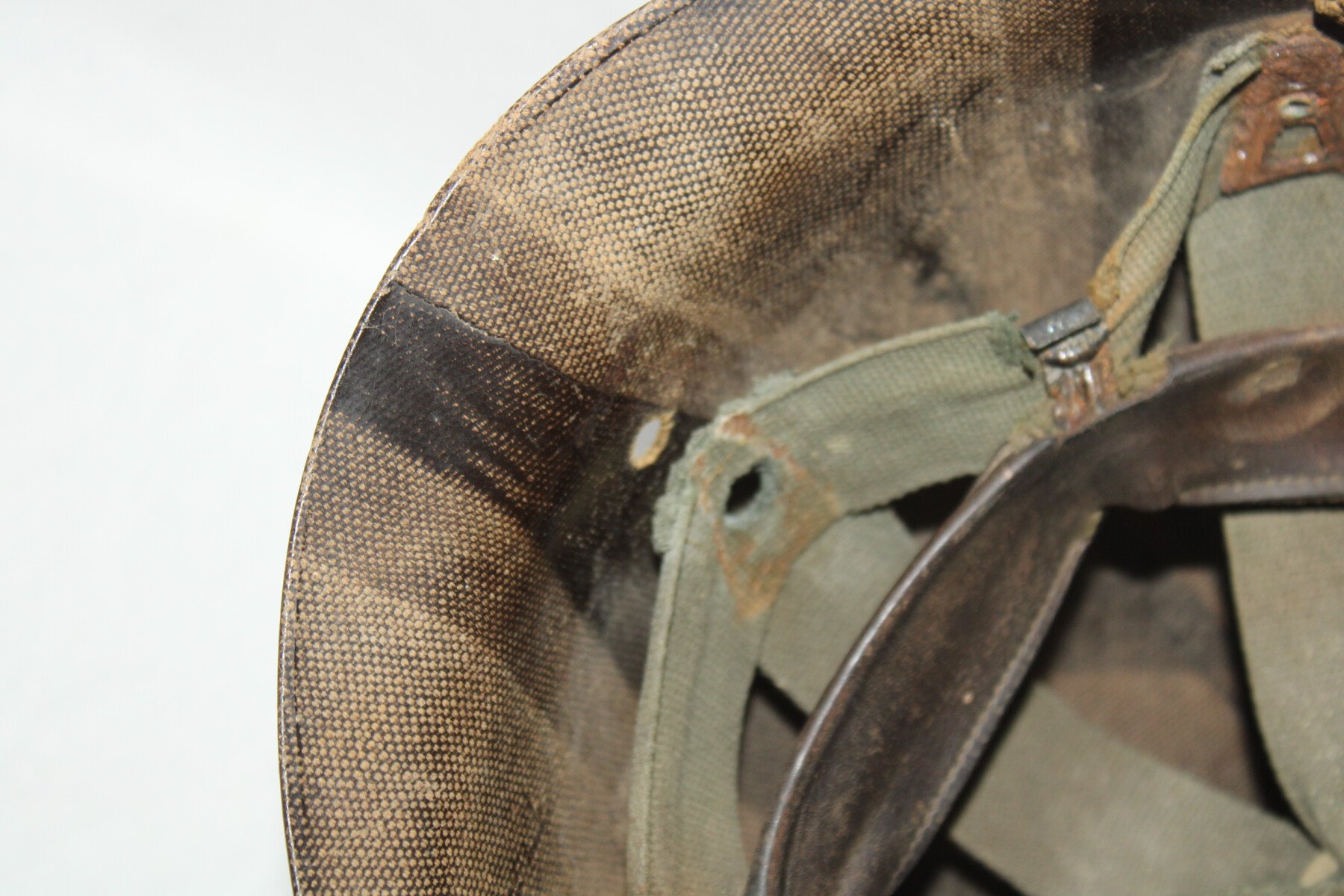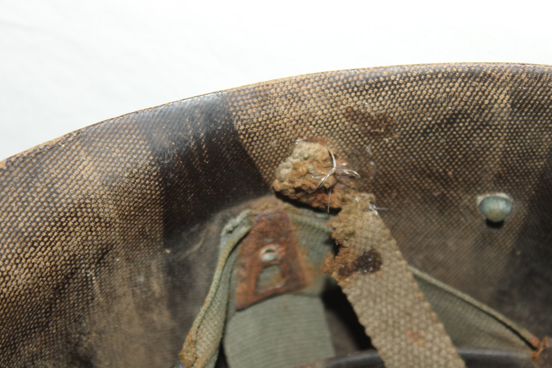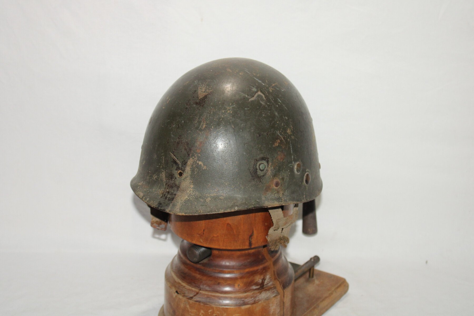 Liner de casque M1 modifié parachutiste période guerre de Corée. Liner fabrication Firestone. Nuquière et rivet frontal absent. Sangle en A inversé abimé, réparé a deux endroits, une boucle absente. Abimé sur le dessus de la coque.