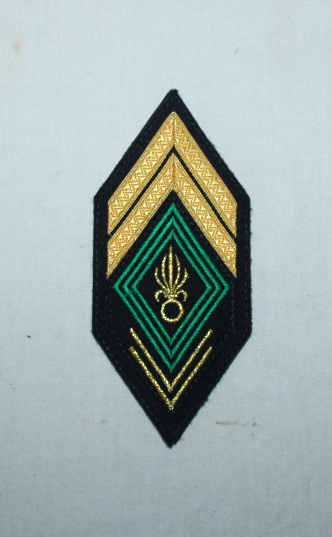 Fabrication actuelle du Losange de bras modèle 45 de sergent de la légion étrangère. Grenade Or de l'infanterie . Avec 2 chevron pour 10 ans de services.