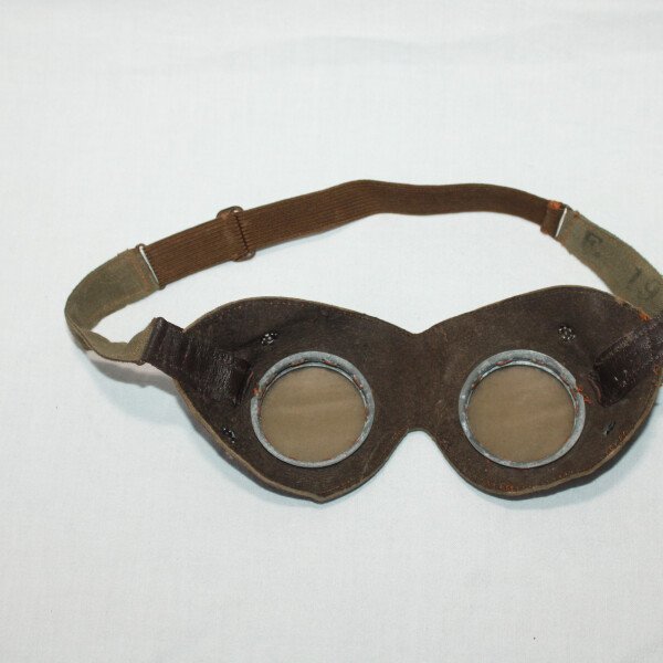 Paire de lunette anti poussière en cuir, fonctionnelle et utilisable. Un numéro sur le coté.