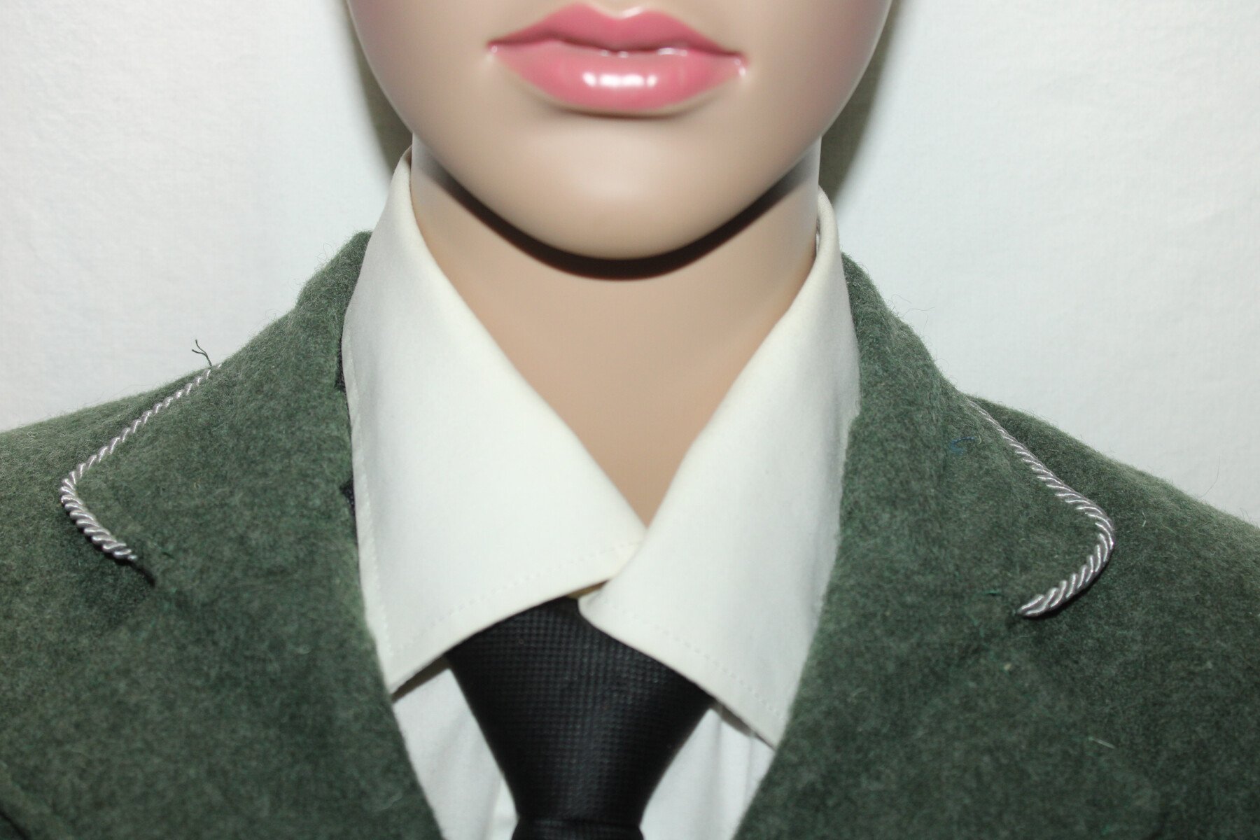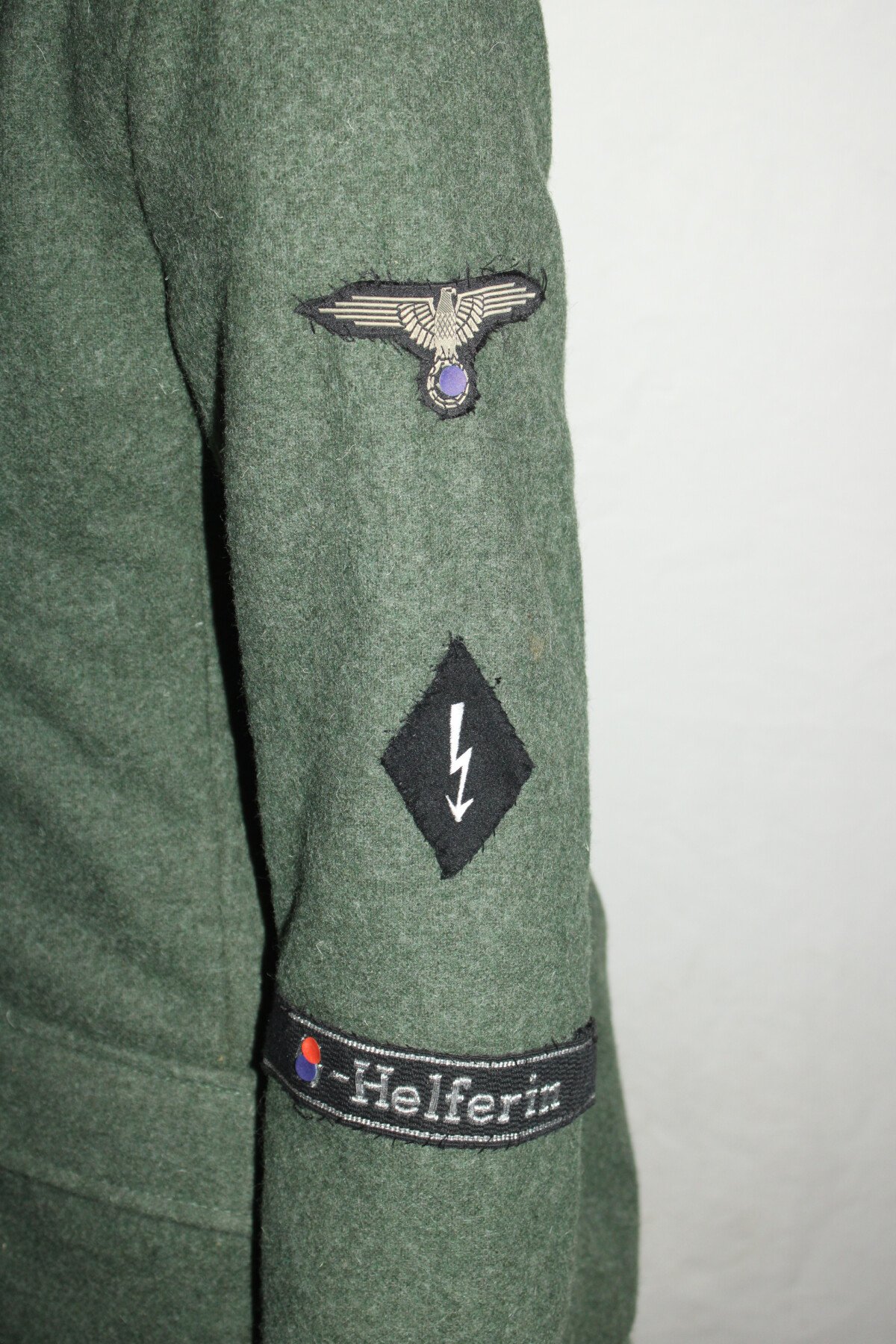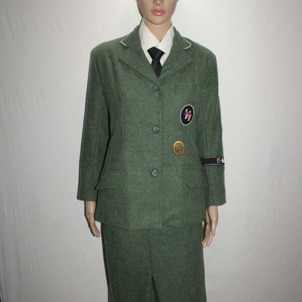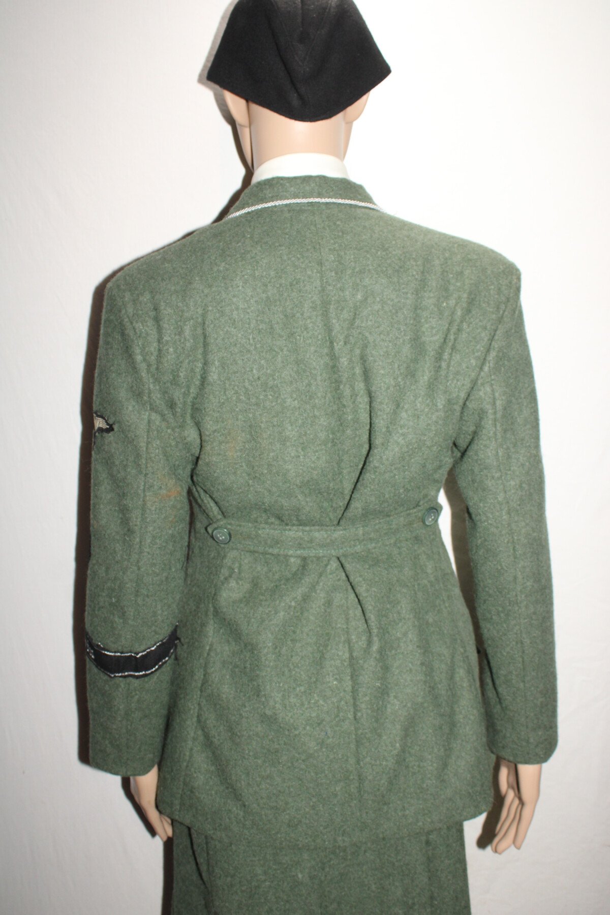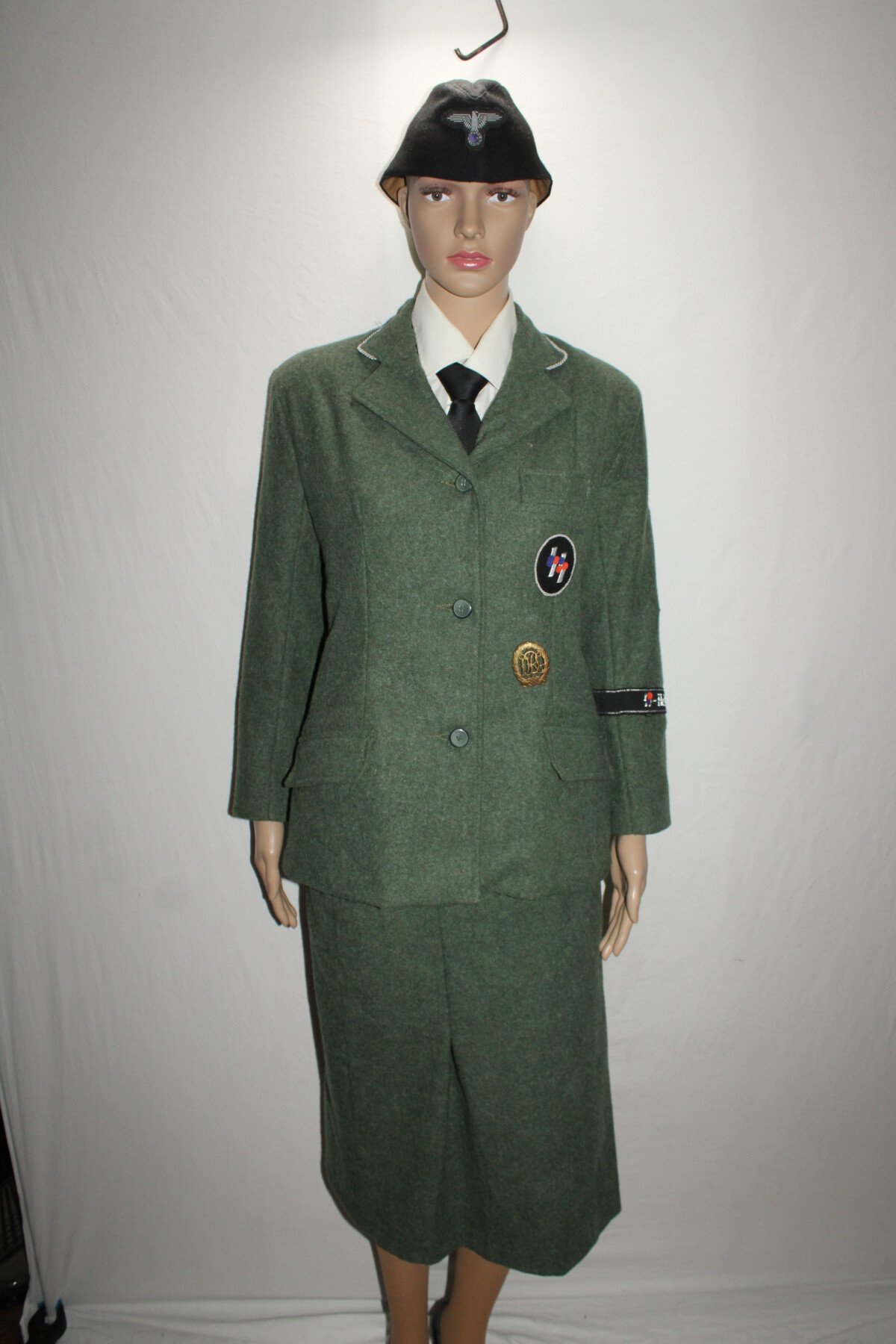 Ensemble veste et jupe en drap feldgrau de SS- helferin. Calot en taille 57. Vendue avec chemise, cravate et chaussures de fabrication actuelle. Chaussures collé aux pieds.Ensemble avec le mannequin...