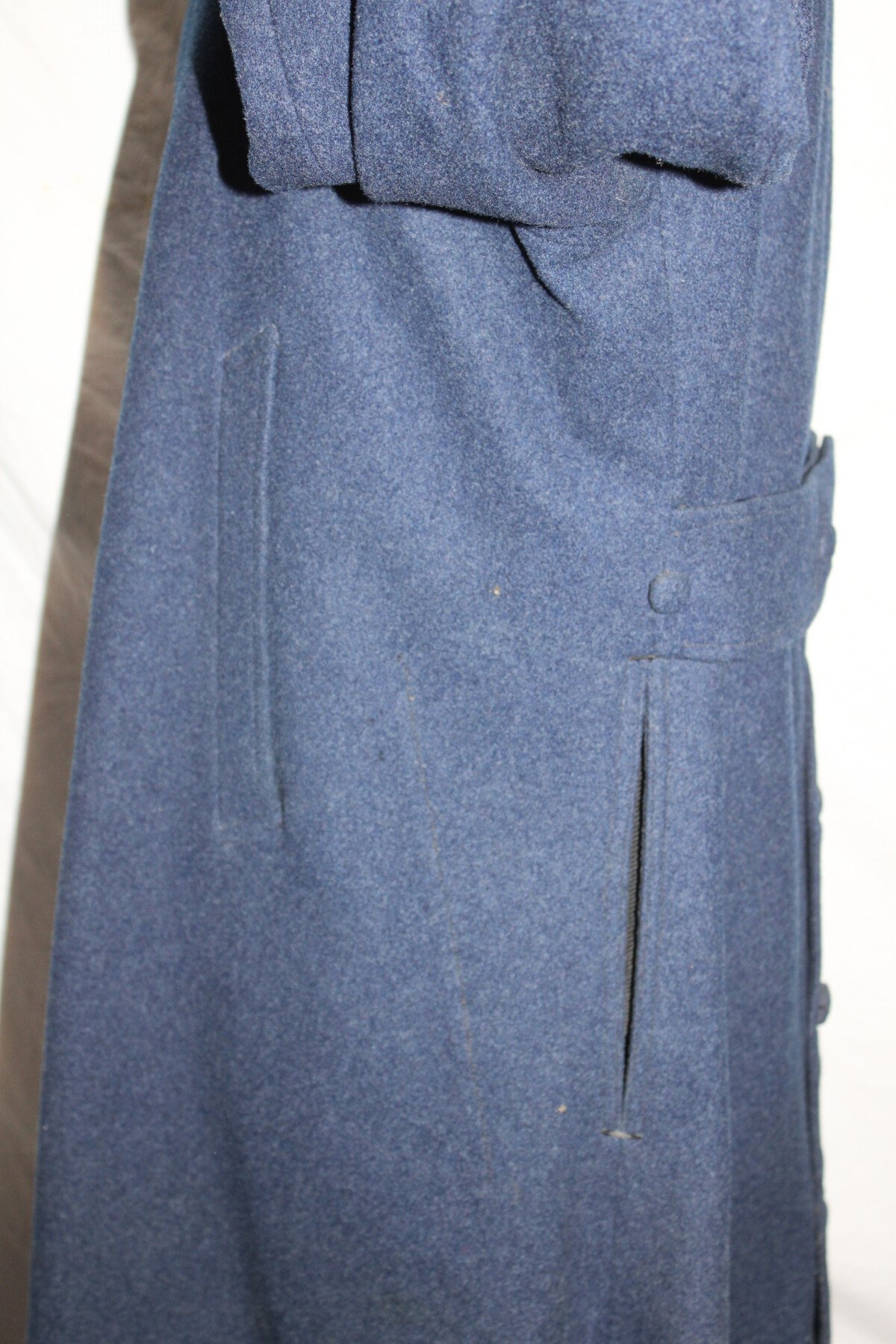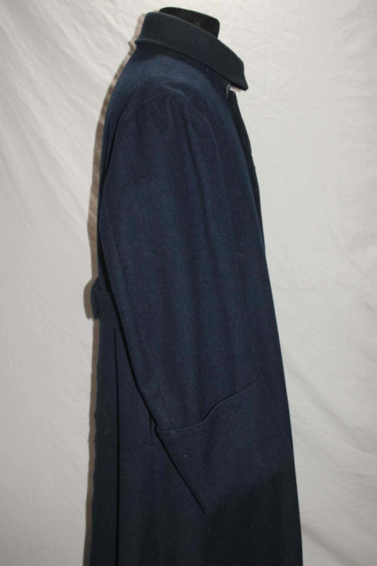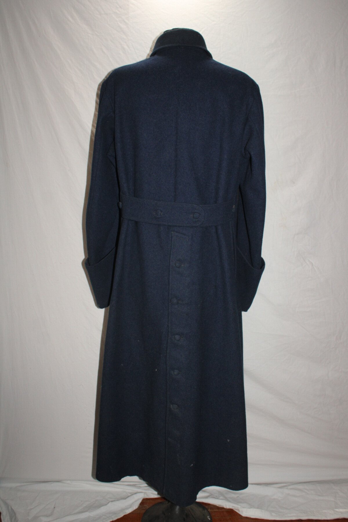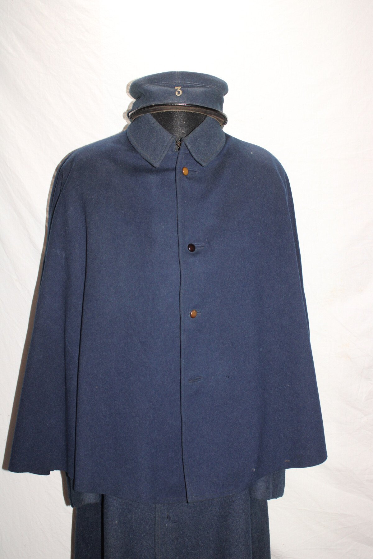 Beau manteau de cavalerie modèle 1872/1885 et Képi en drap gris de fer bleuté. Rotonde amovible, deux trous à l'arrière. Boutons argenté sur le manteau avant et en recouvert de drap à l'arrière. Un manquant sur la rotonde. Pas d'étiquette ou tampon de fabrication. Largeur d'épaule: 46cm, longueur de manche: 65cm. Hauteur total 182cm. Képi, boutons et jugulaire en drap gris de fer bleuté. Chiffre 3 en métal argenté. deux très petit trous sur le coté du képi. Hauteur 9cm, taille environs 56. Bel ensemble.