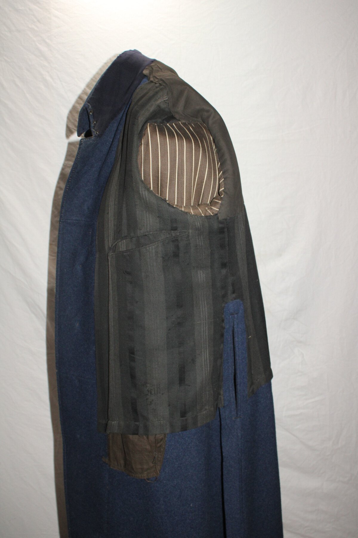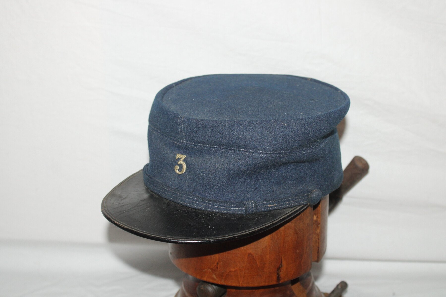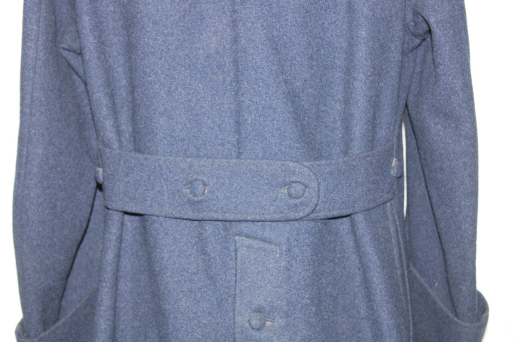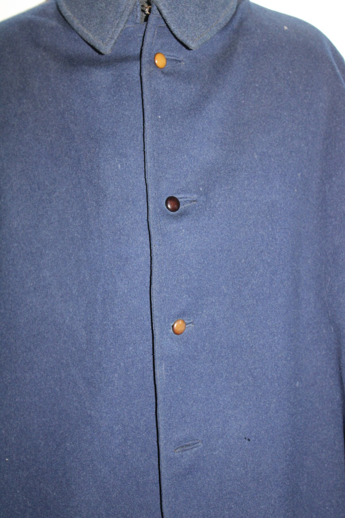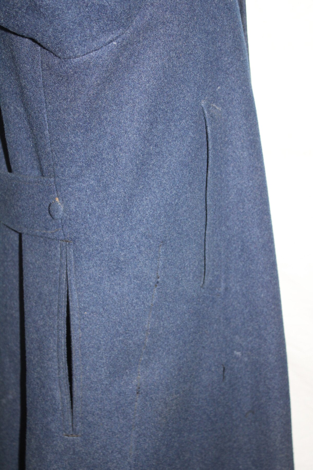 Beau manteau de cavalerie modèle 1872/1885 et Képi en drap gris de fer bleuté. Rotonde amovible, deux trous à l'arrière. Boutons argenté sur le manteau avant et en recouvert de drap à l'arrière. Un manquant sur la rotonde. Pas d'étiquette ou tampon de fabrication. Largeur d'épaule: 46cm, longueur de manche: 65cm. Hauteur total 182cm. Képi, boutons et jugulaire en drap gris de fer bleuté. Chiffre 3 en métal argenté. deux très petit trous sur le coté du képi. Hauteur 9cm, taille environs 56. Bel ensemble.