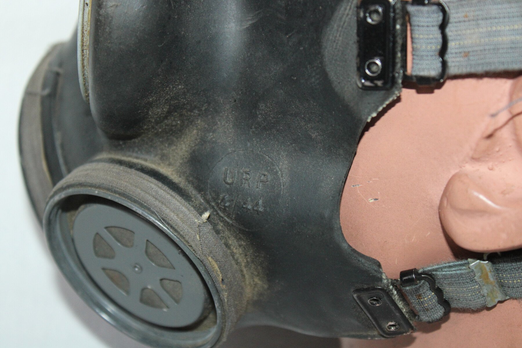 Light respirator dans ca housse de transport utilisé par toute les troupes britannique dès 1943, repassé armé danoise. Masque daté 1944 taille normal, caoutchouc souple. Cartouche datée 53. Housse sans crochets, daté 1943, sangle non daté.