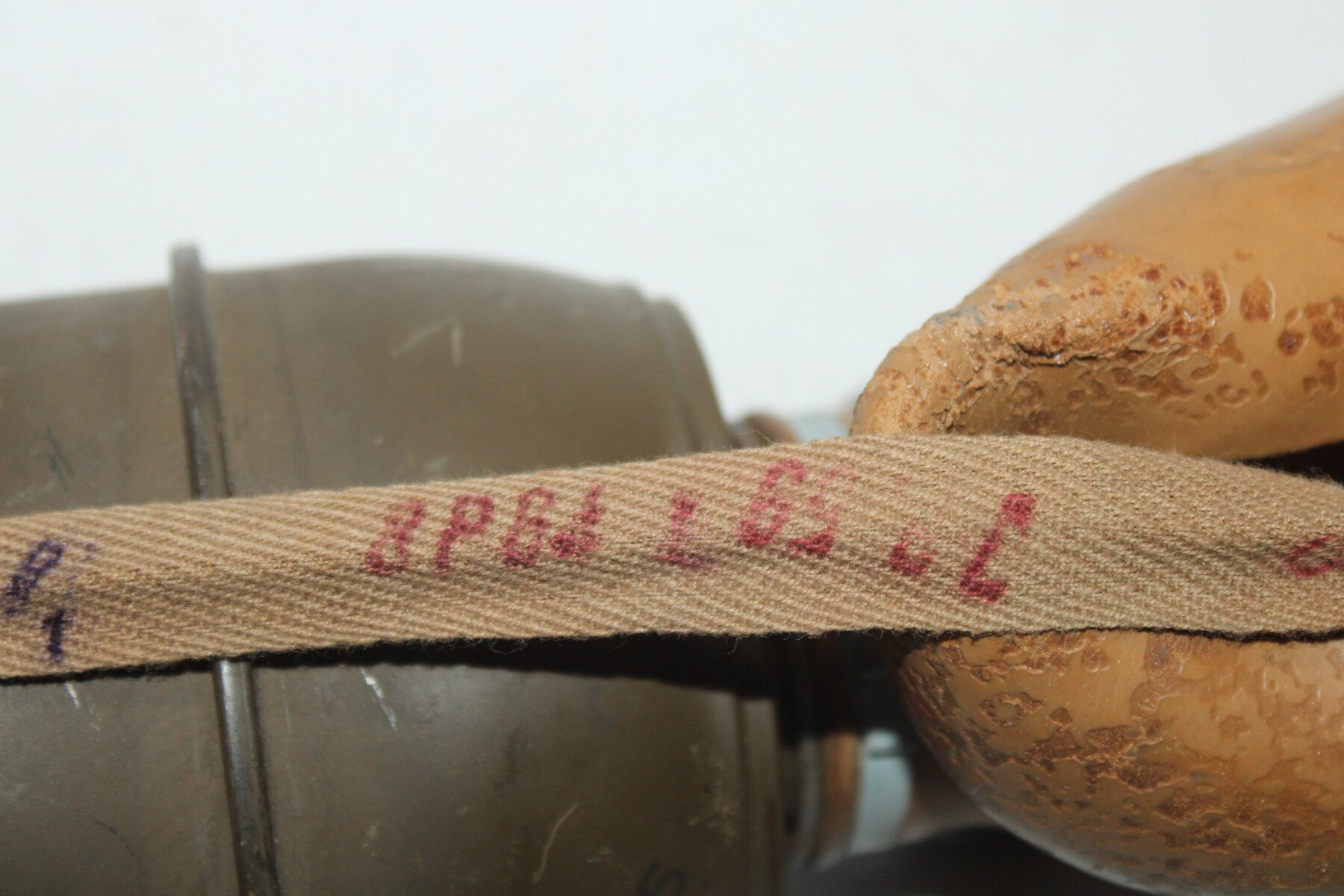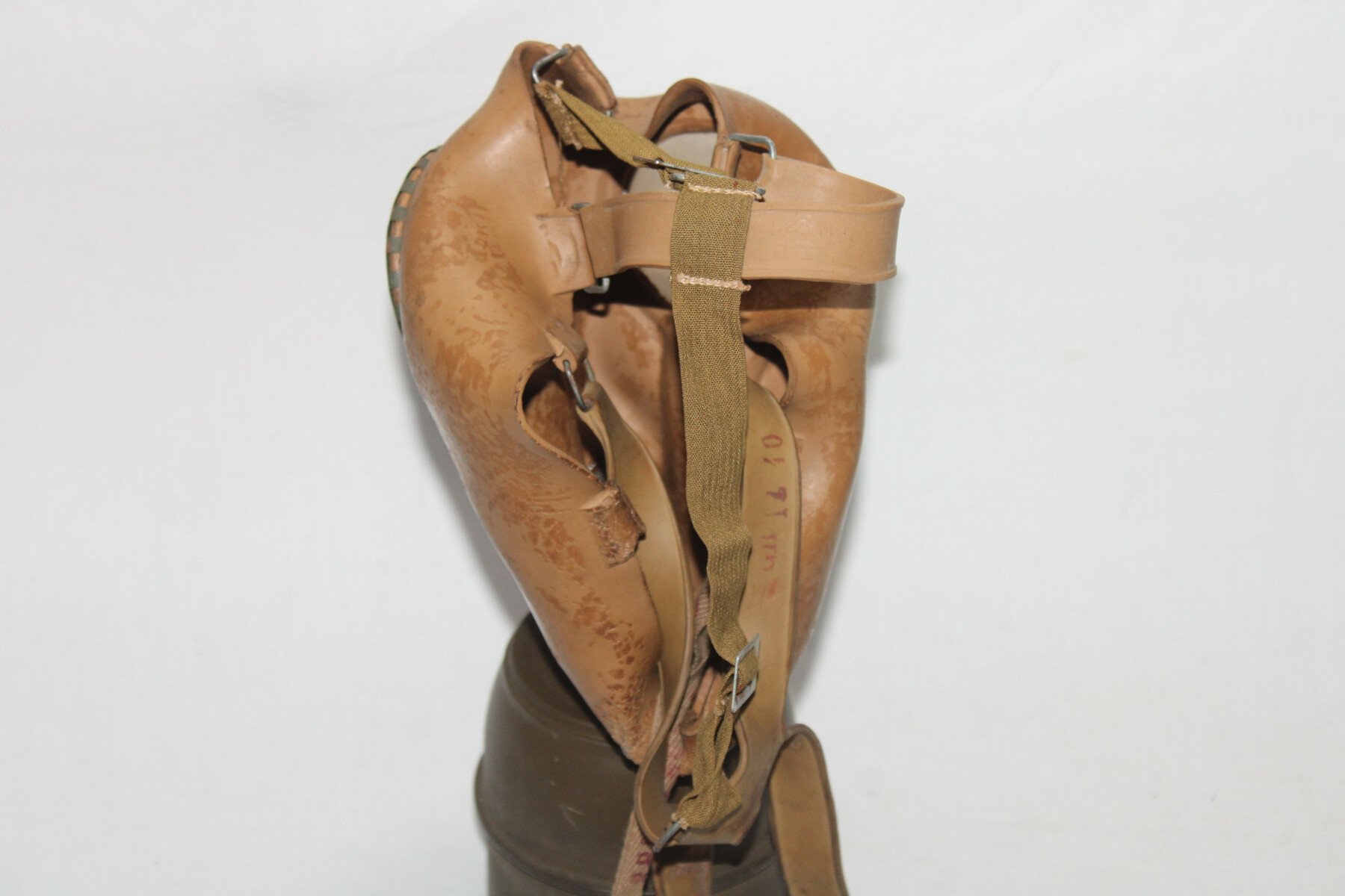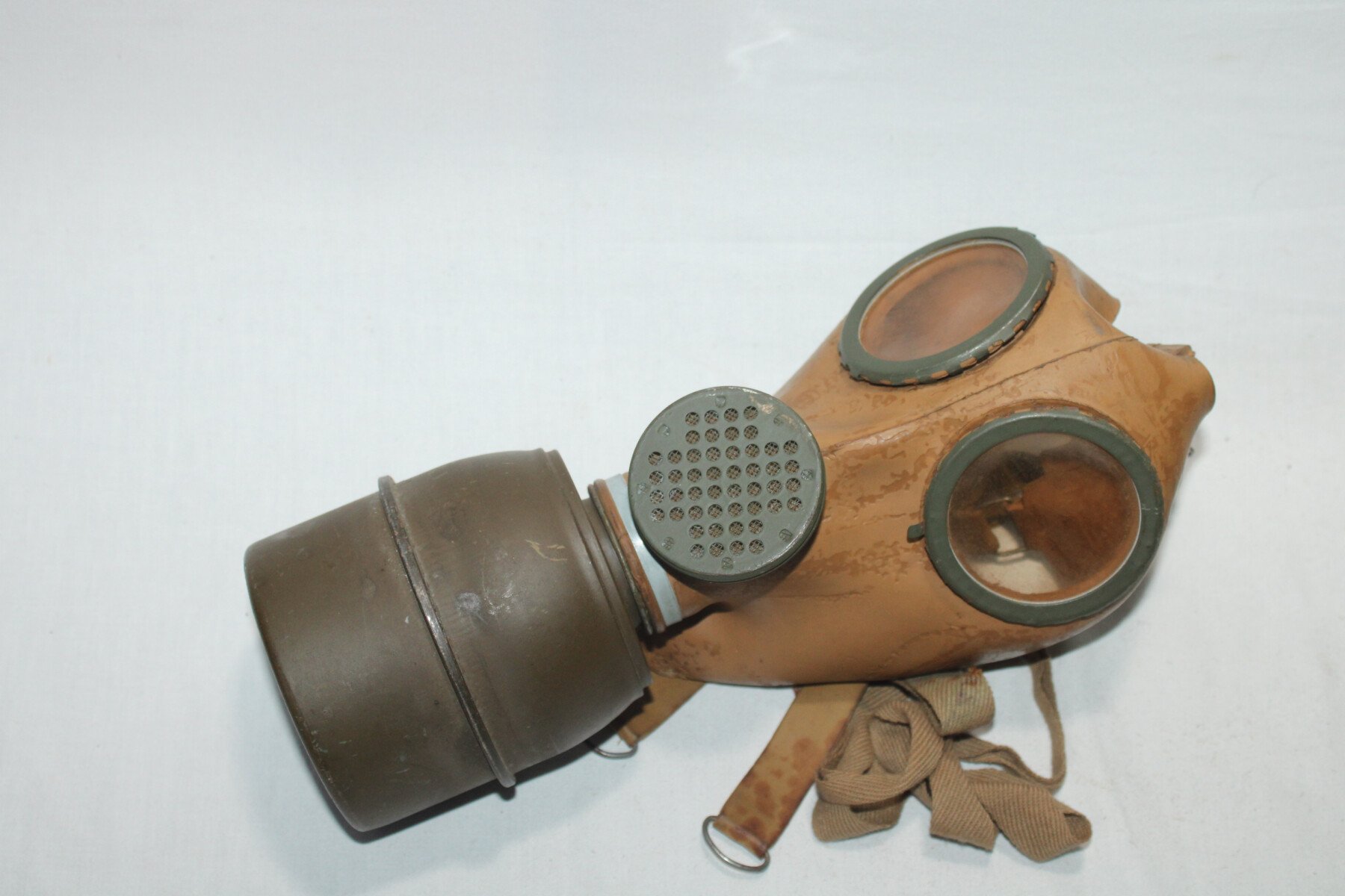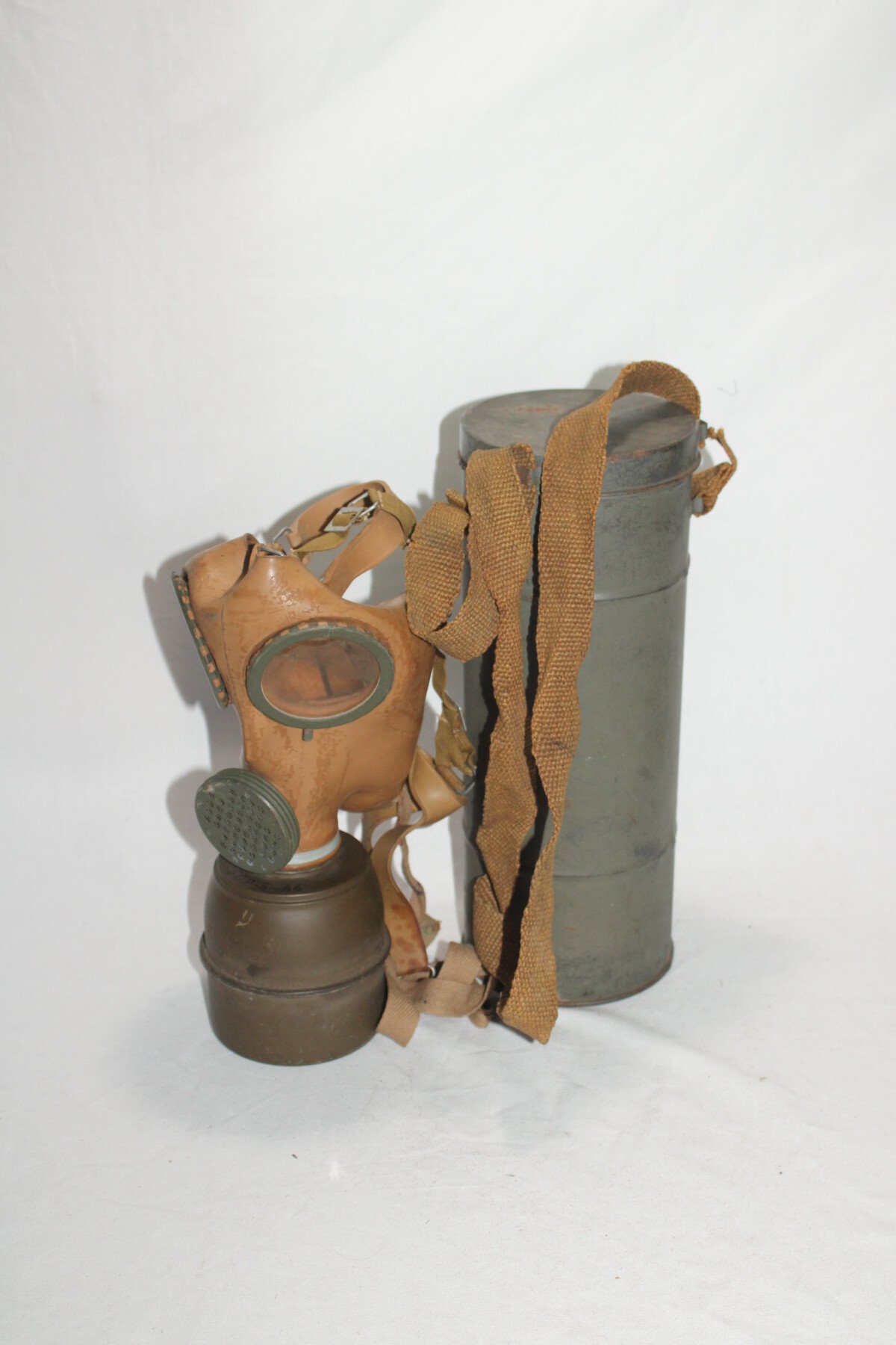 Masque à gaz de la défense passive, dans sa boite de transport. Masque complet et souple, une sangle détaché daté 1940, plusieurs autre date sur la sangle, cartouche daté 1940 retamponné 1944 et 1969 et boite daté 1939. Quelques déchirures sur la sangle mais encore solide.
