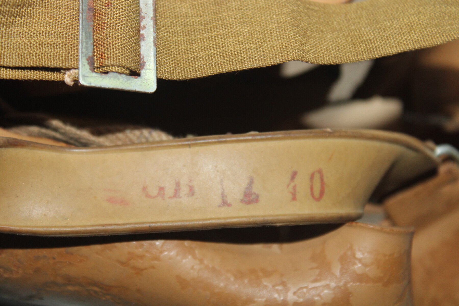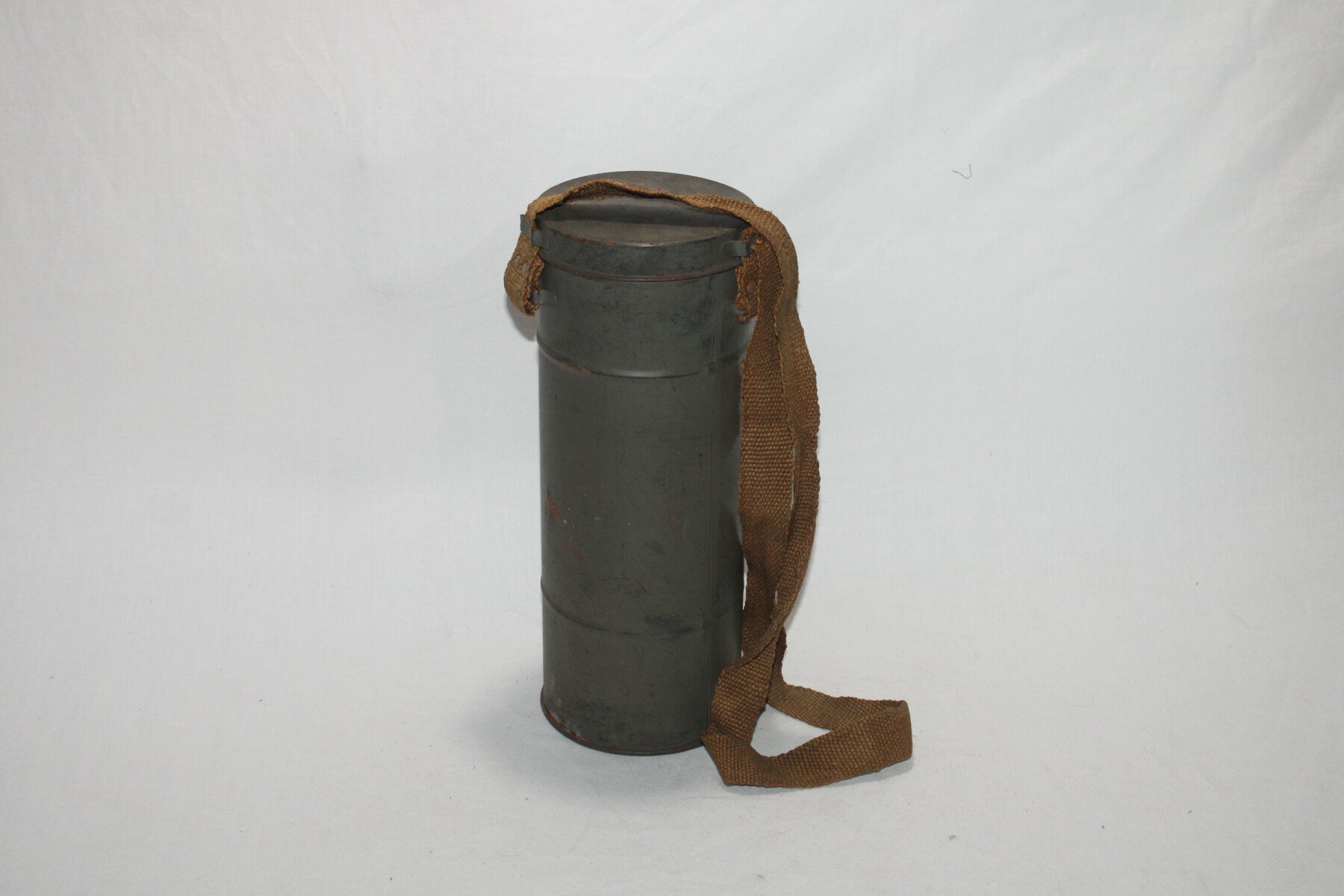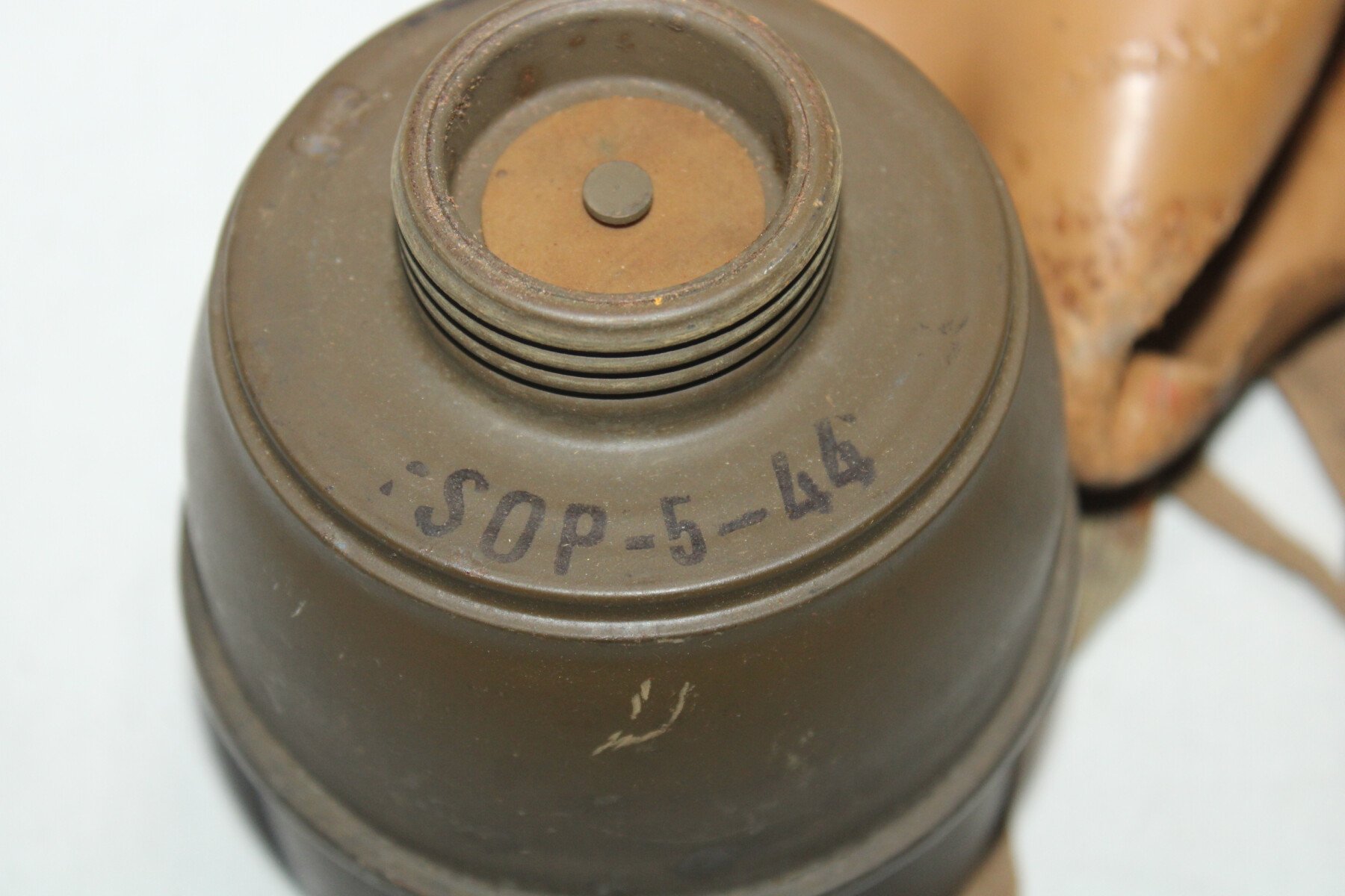 Masque à gaz de la défense passive, dans sa boite de transport. Masque complet et souple, une sangle détaché daté 1940, plusieurs autre date sur la sangle, cartouche daté 1940 retamponné 1944 et 1969 et boite daté 1939. Quelques déchirures sur la sangle mais encore solide.