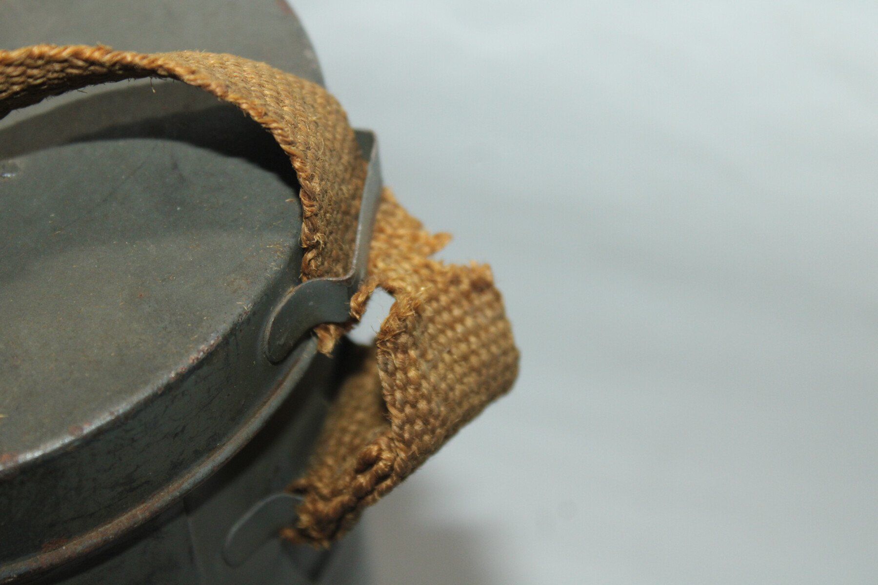 Masque à gaz de la défense passive, dans sa boite de transport. Masque complet et souple, une sangle détaché daté 1940, plusieurs autre date sur la sangle, cartouche daté 1940 retamponné 1944...