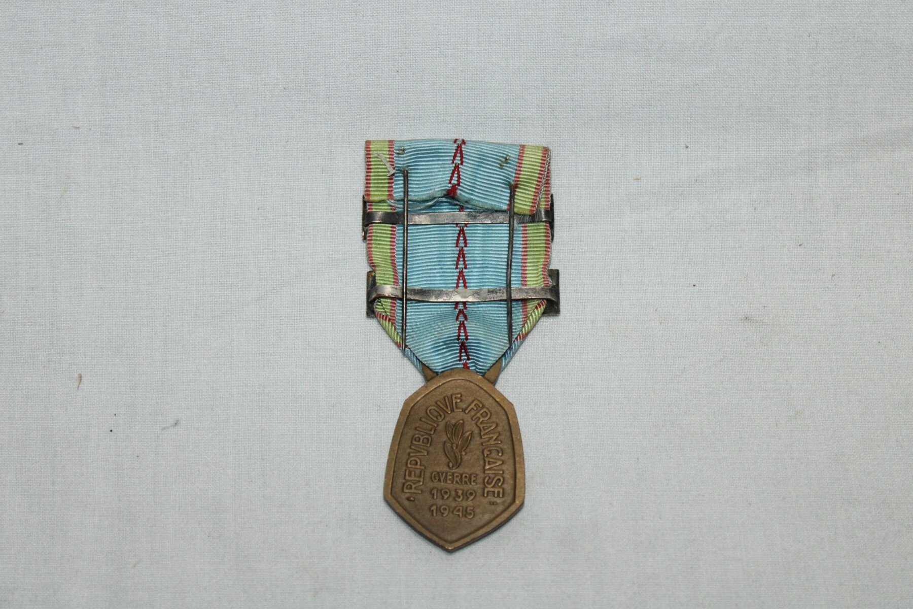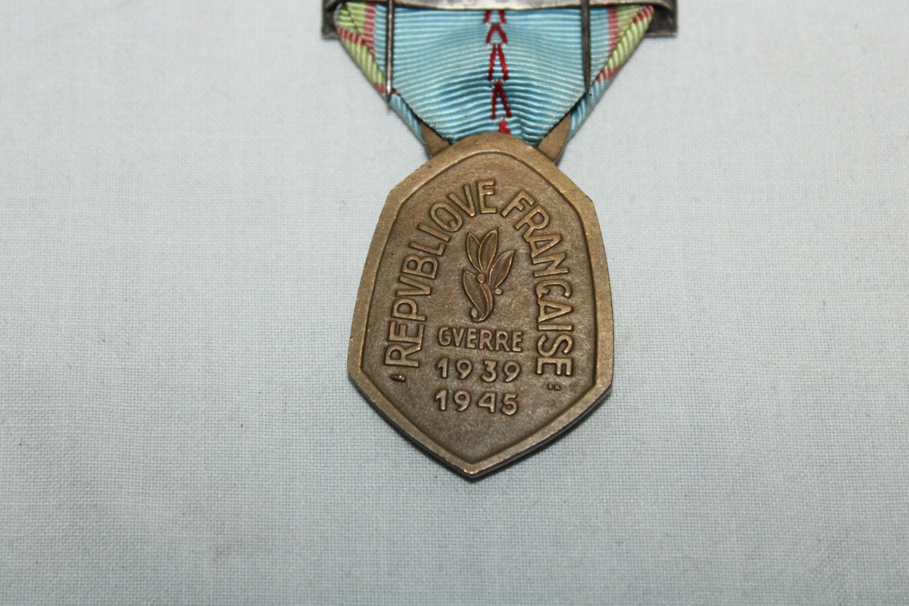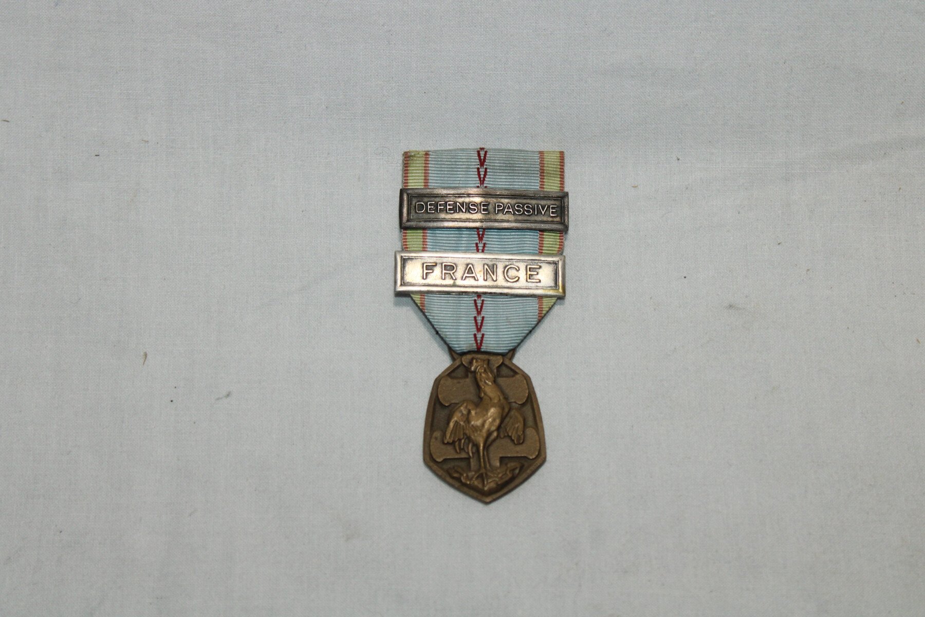 Médaille commémorative de la guerre 39/45 avec barrette défense passive et France. Son épinglette est présente.