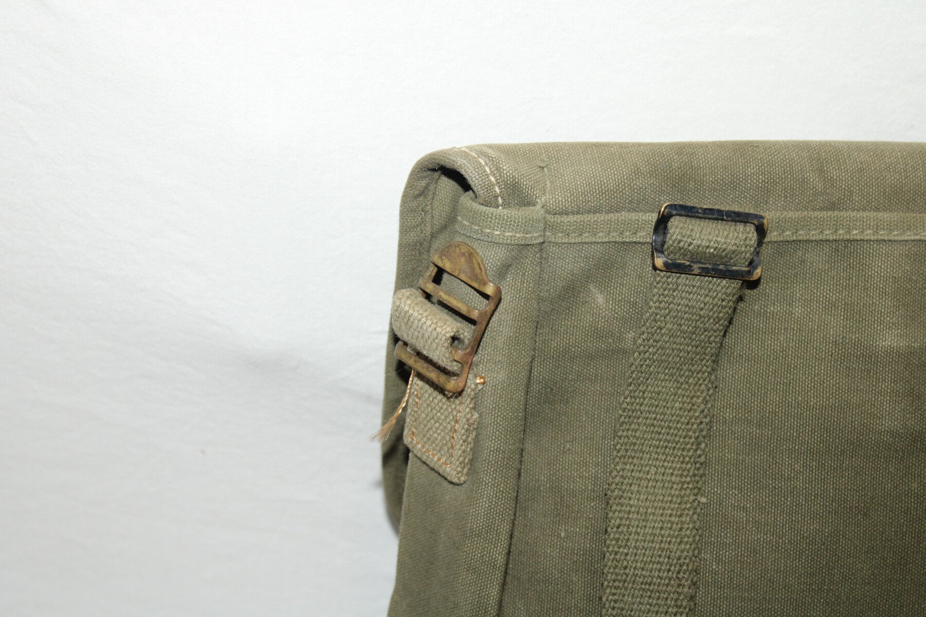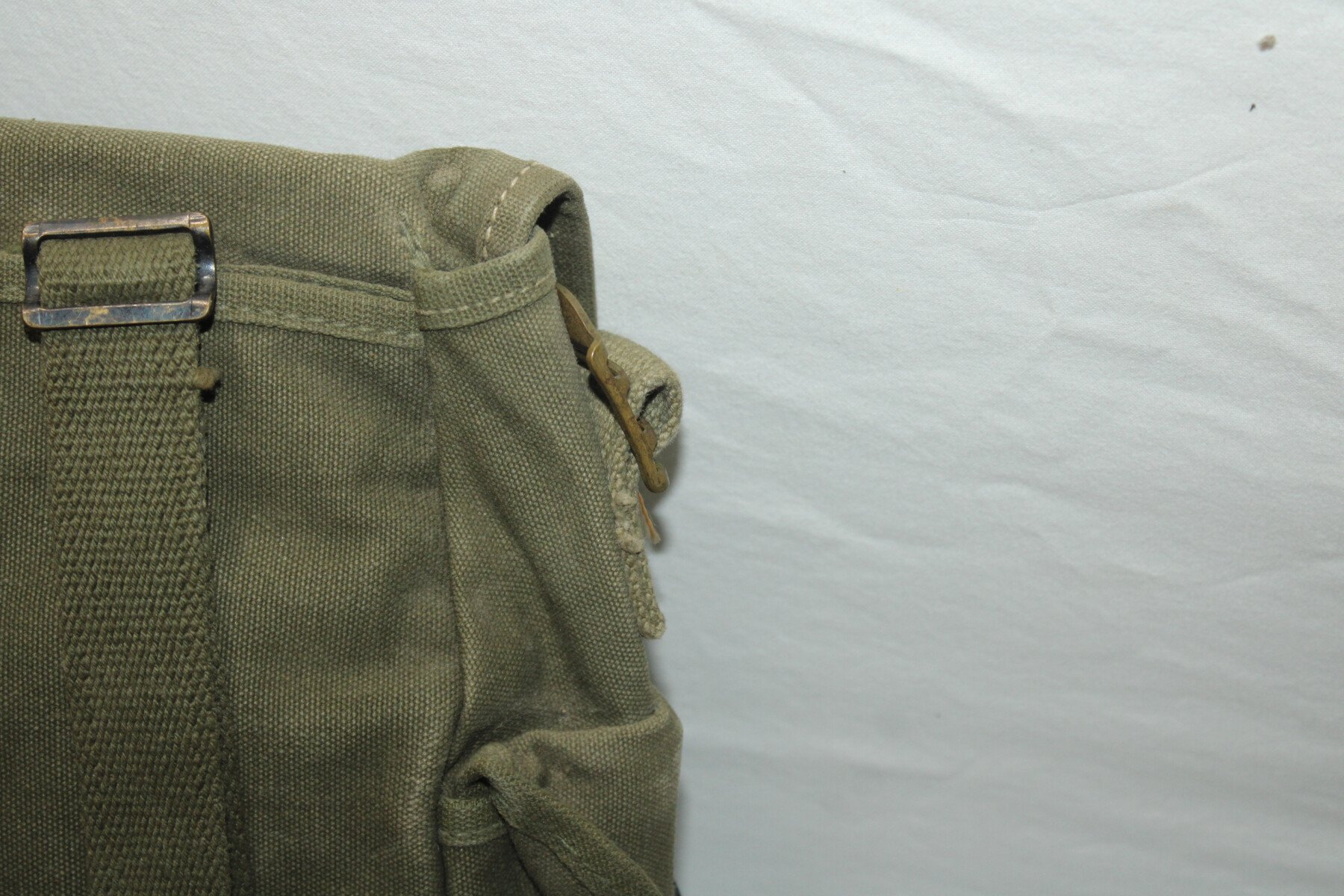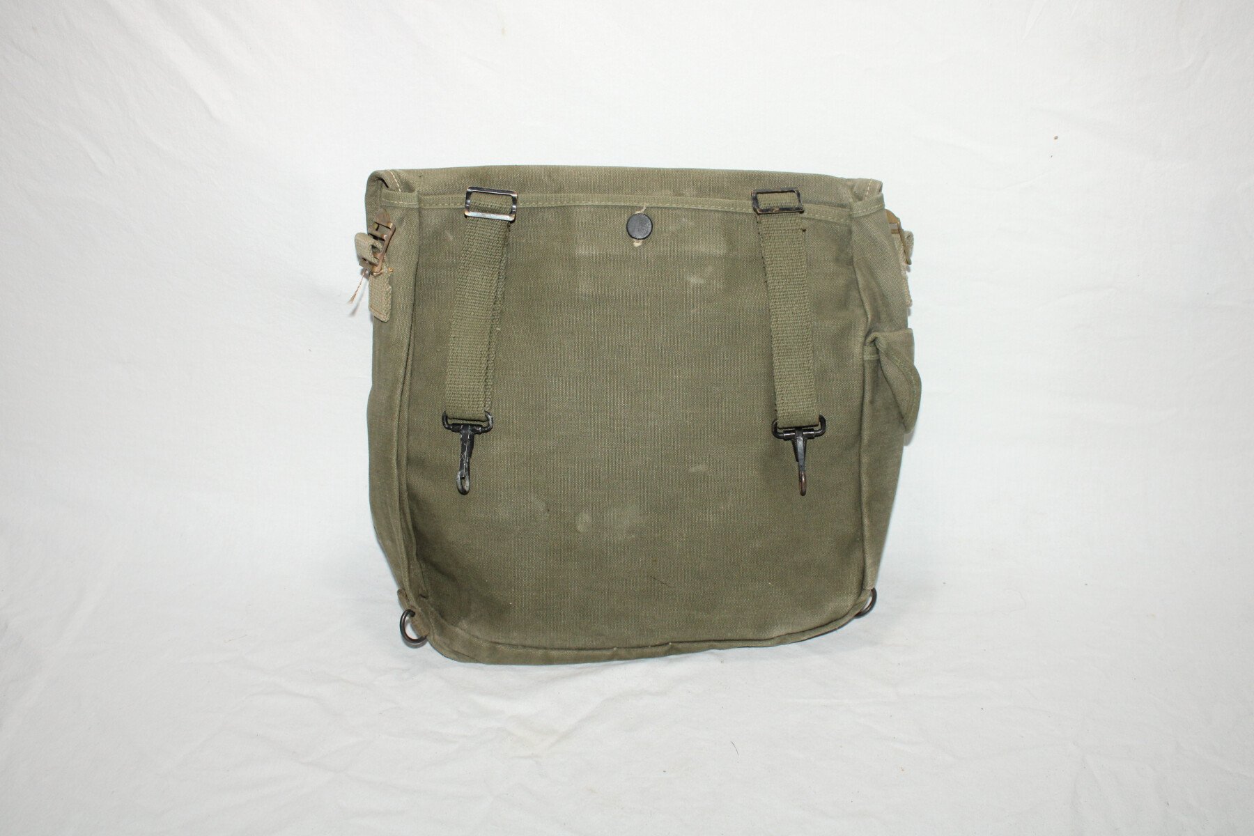 Musette de type mle 36, modifiée par l'ajout d'œillet pour la fixation d'un outil et passants sur le coté. Daté 1945.