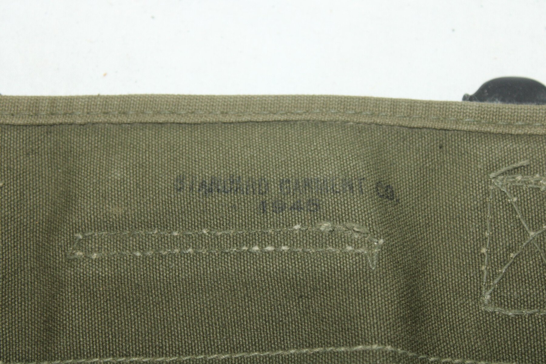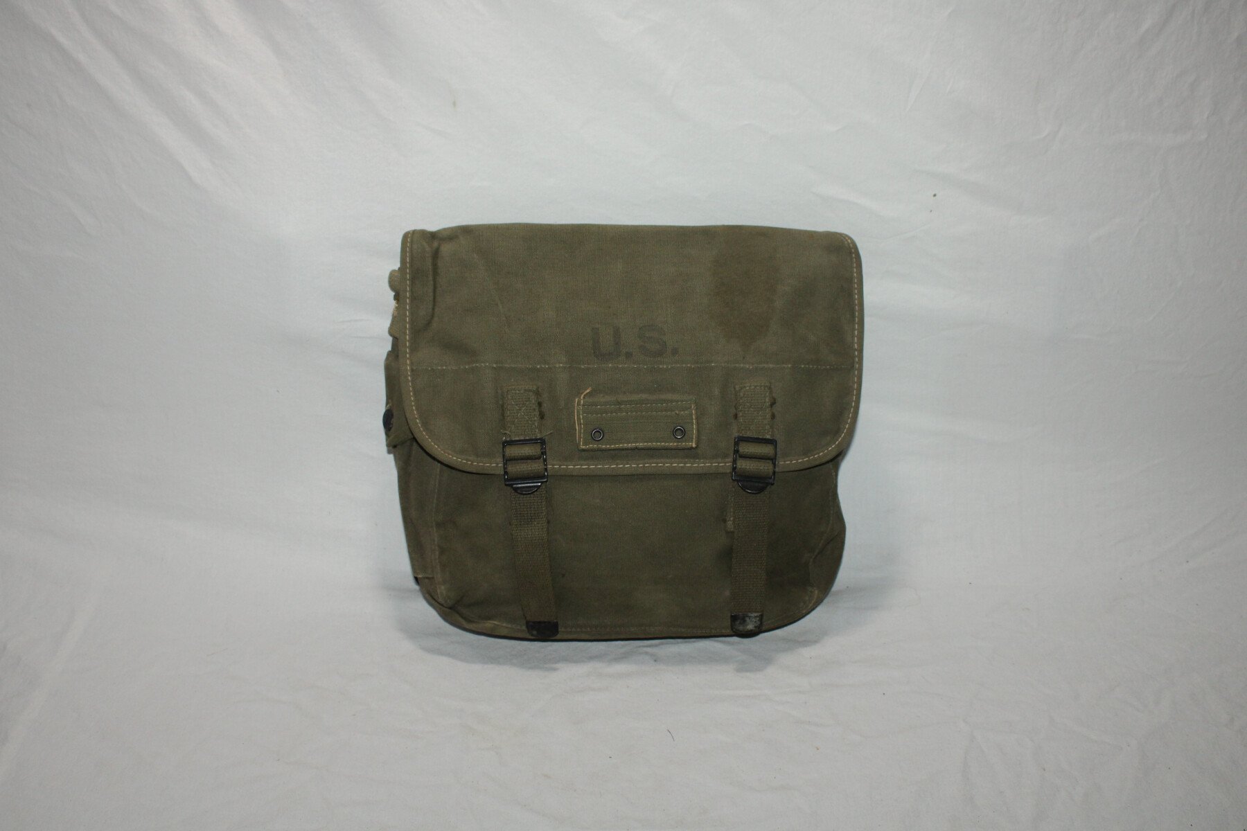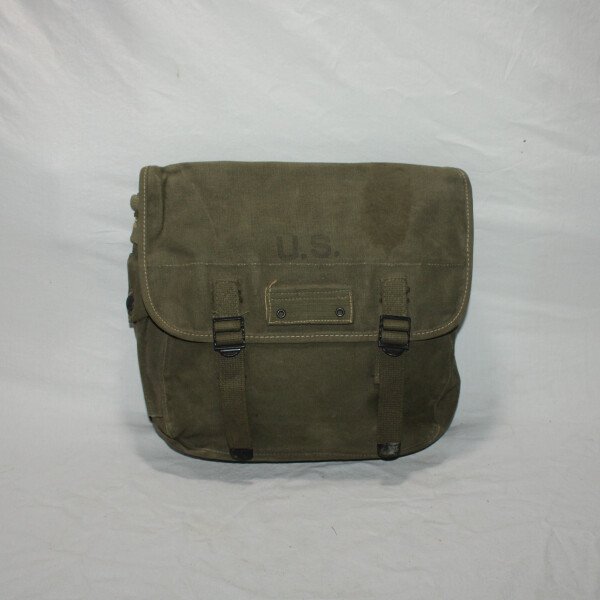 Musette de type mle 36, modifiée par l'ajout d'œillet pour la fixation d'un outil et passants sur le coté. Daté 1945.