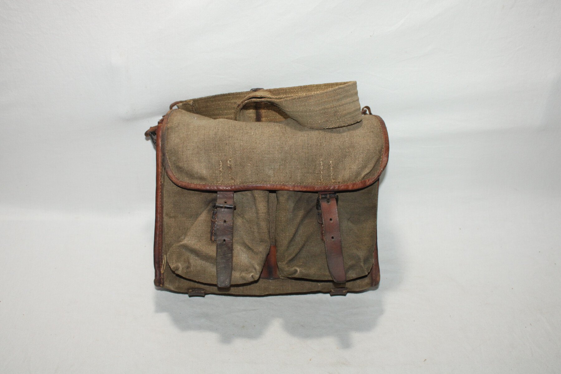 Musette modèle 1935 en toile, tampon présent mais peu lisible, cuir à entretenir. Déchirure sur un coté. Emplacement pour la béquille du FM 24/29. Rouille sur les parties métallique.
