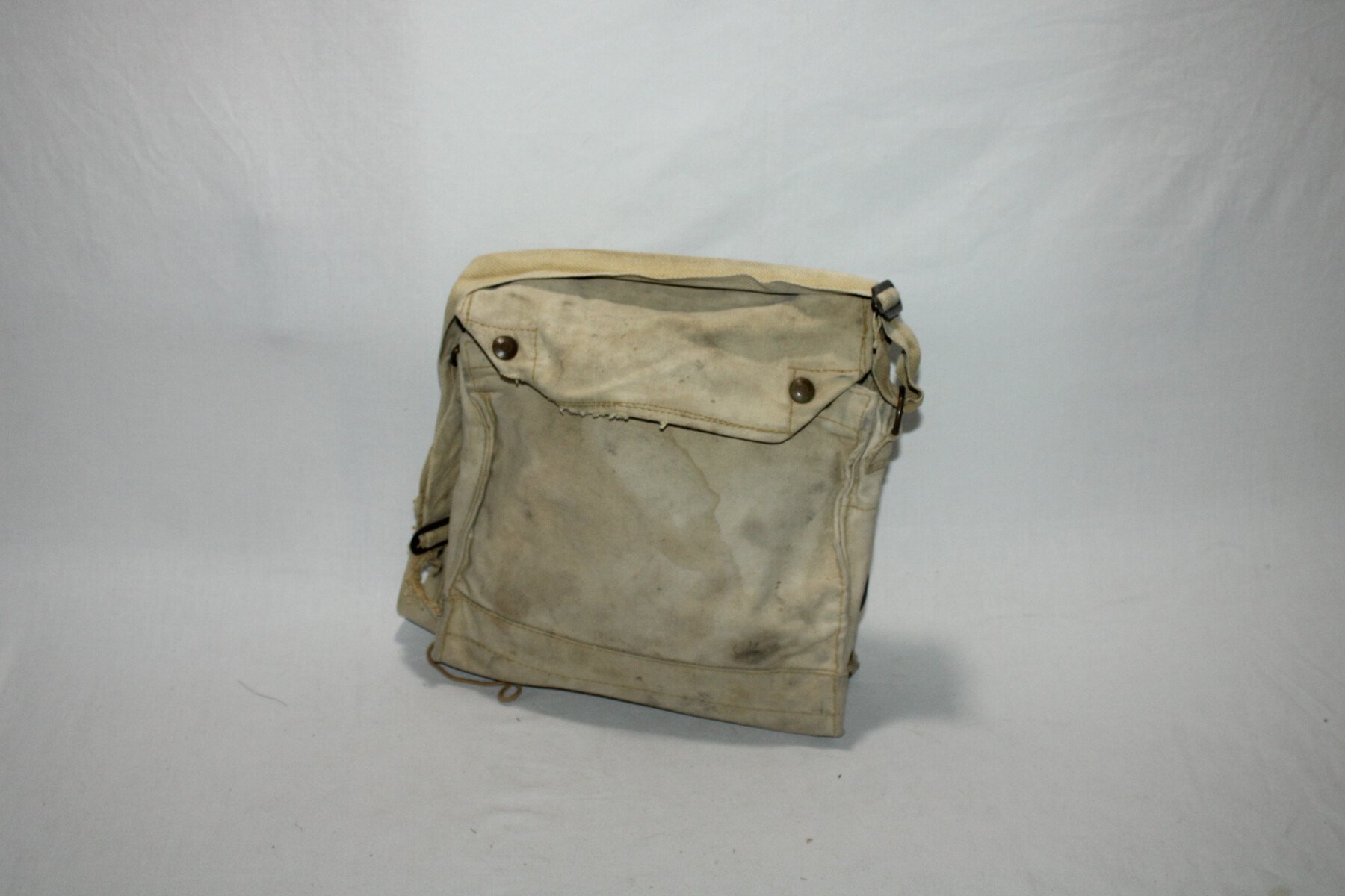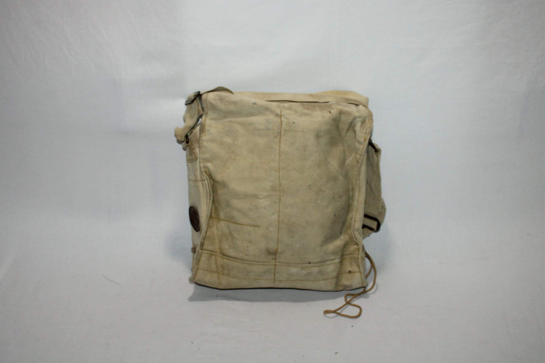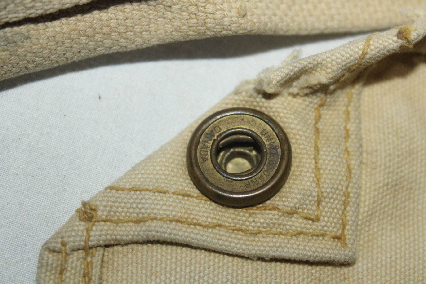 Musette MKVII pour masque à gaz. Marqué du C avec flèche, date peu lisible. Pression marqué United Carr Canada. Sangle en grande partie coupée.