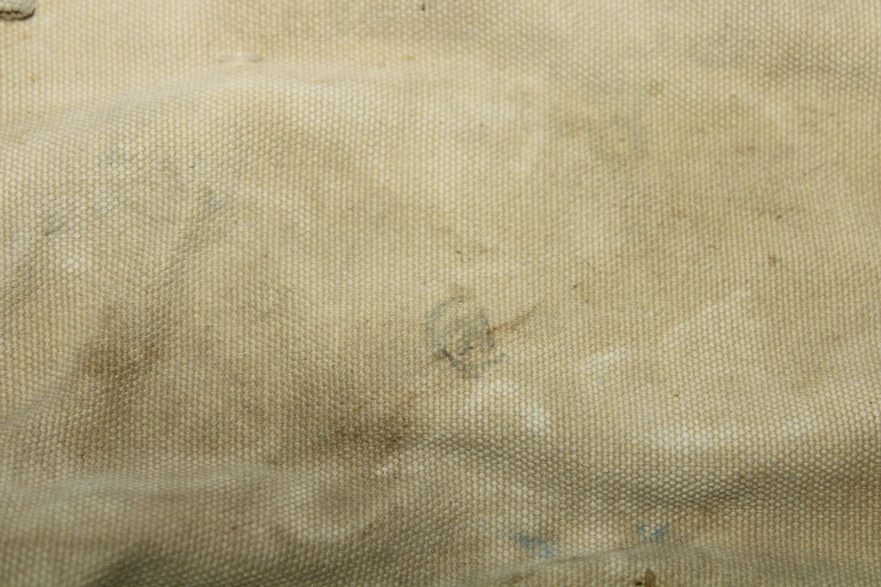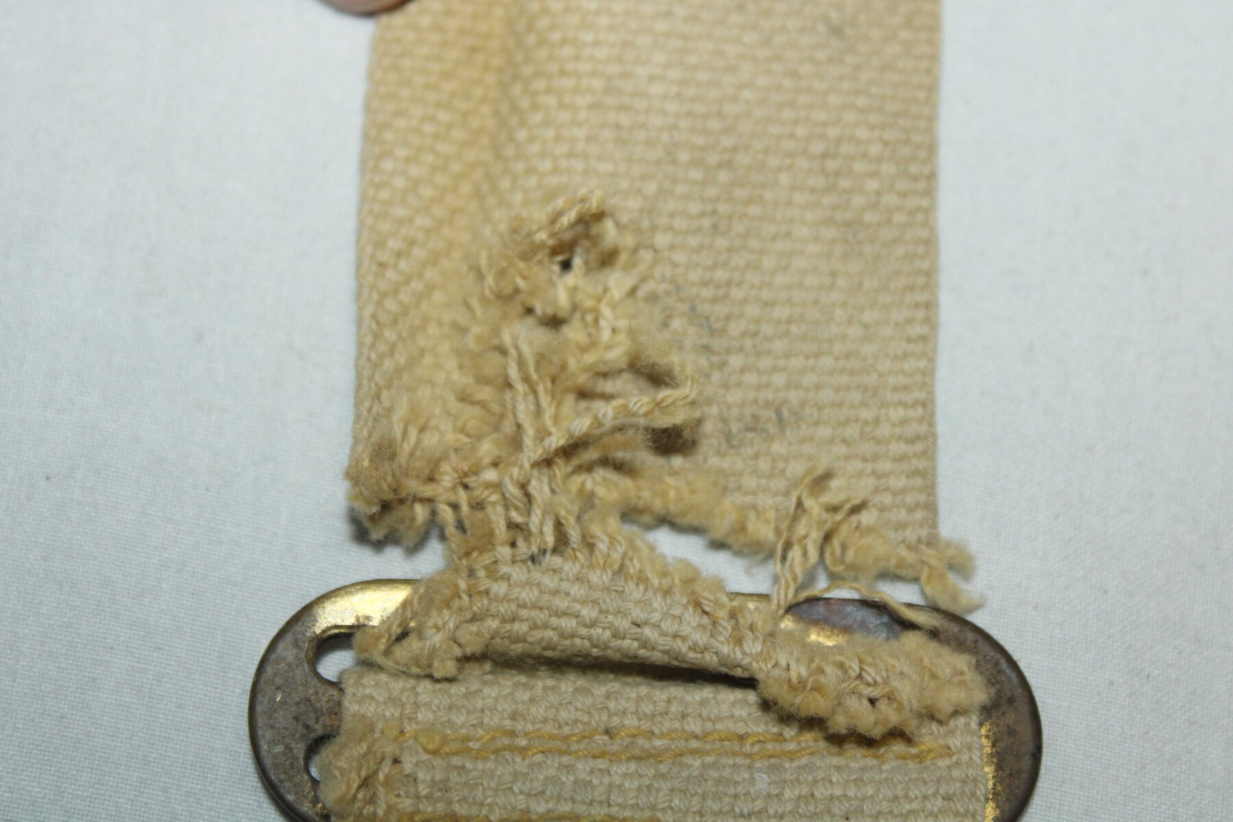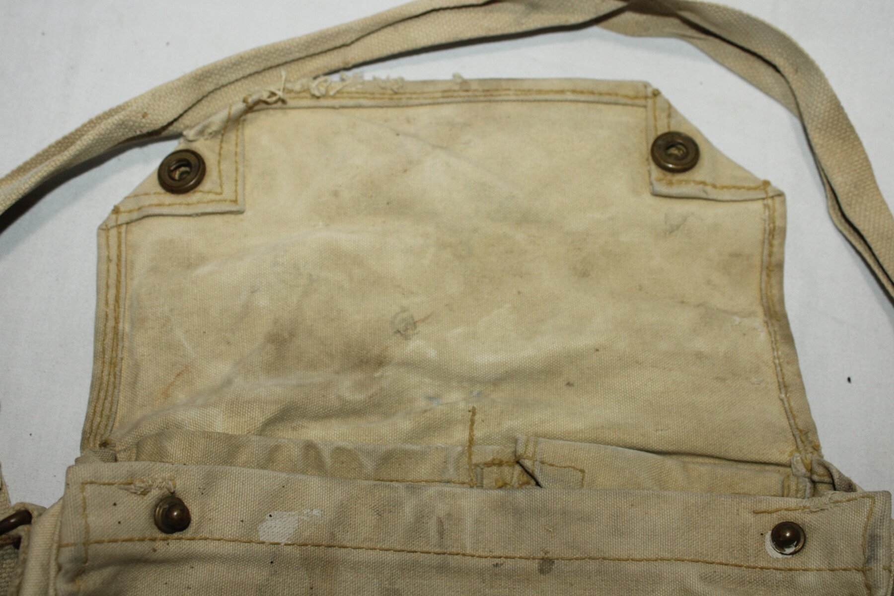 Musette MKVII pour masque à gaz. Marqué du C avec flèche, date peu lisible. Pression marqué United Carr Canada. Sangle en grande partie coupée.