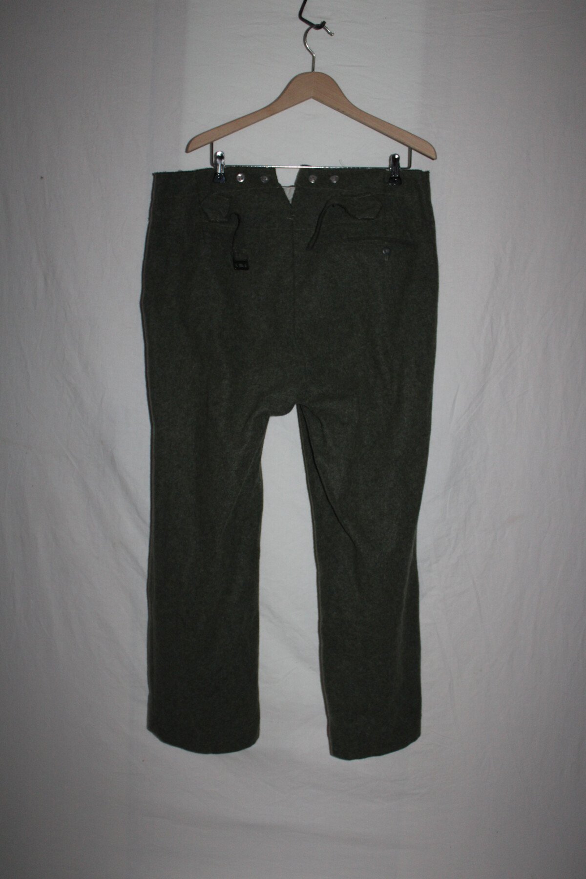 Pantalon modèle 36 de couleur Feldgrau. Porté mais en bon état. Taille: tour de taille 52cm à plat, hauteur total 120cm, hauteur d'entrejambe 85cm.