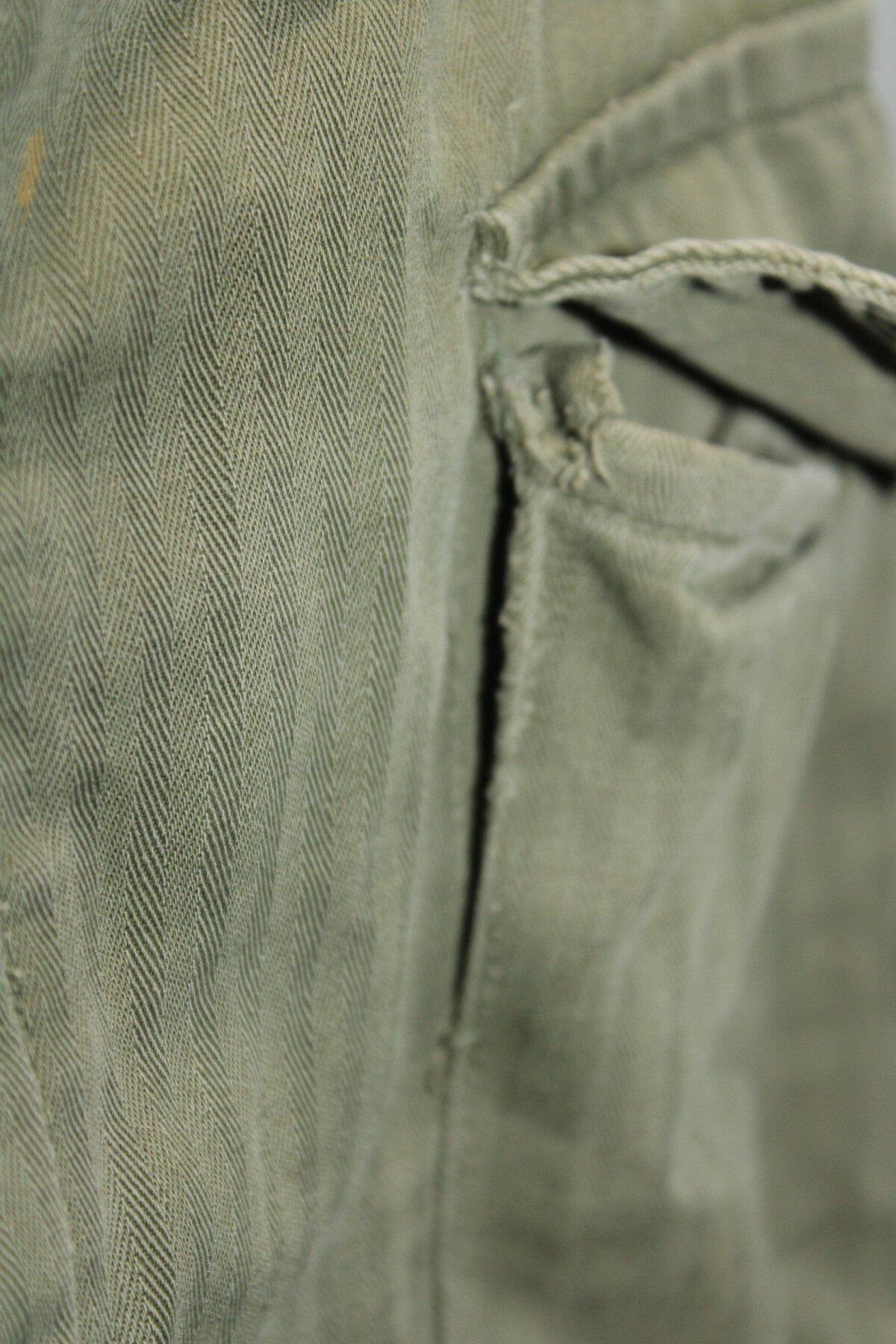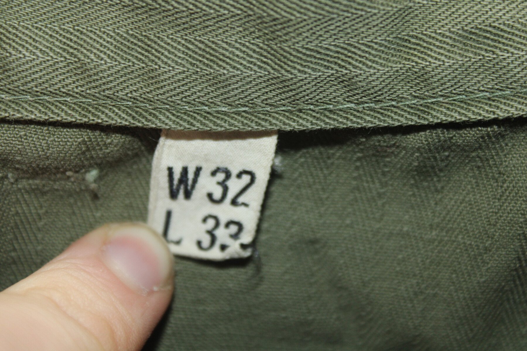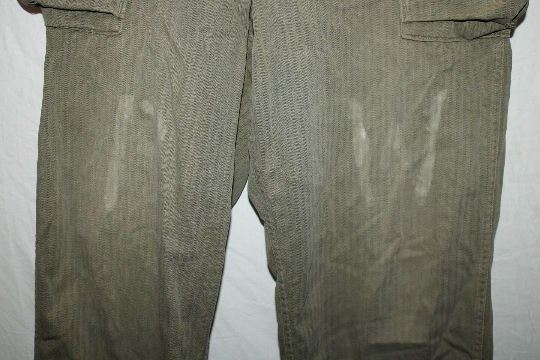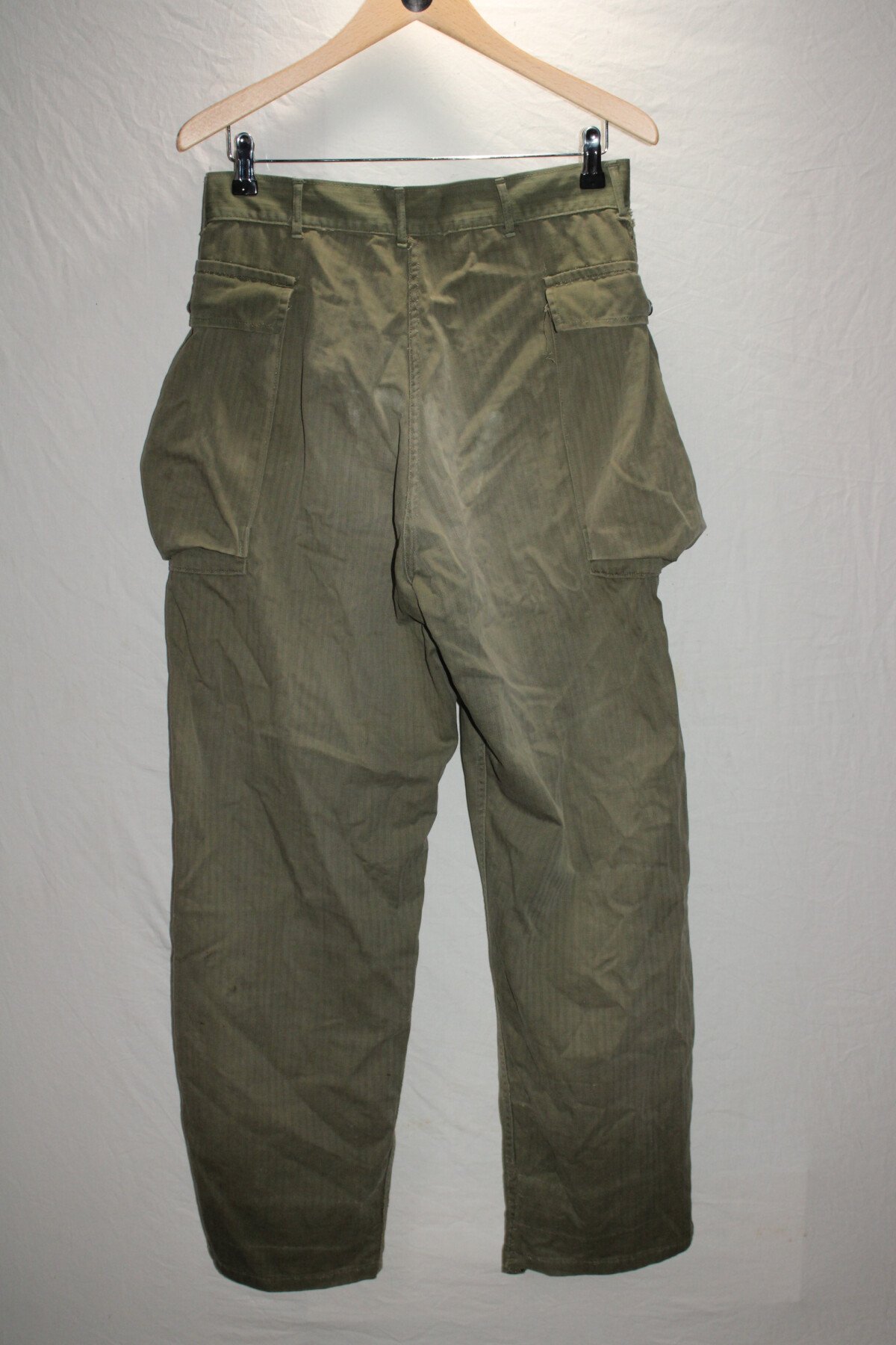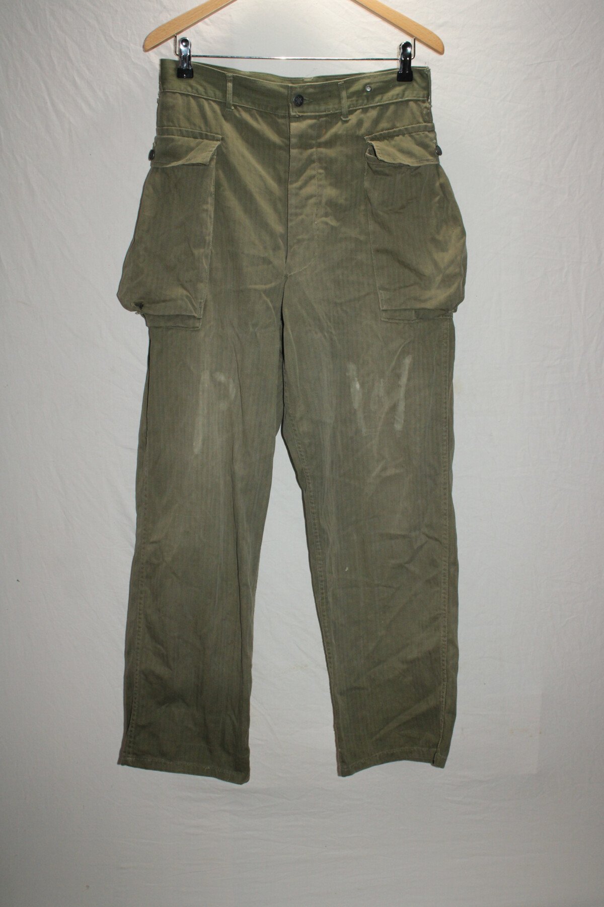 Pantalon de treillis HBT (Herringbone Twill) marqué PW (Prisonner of War) sur les cuisses et les fesses. Poches à soufflet médian. Taille W32-L33. Rabat anti gaz présent, étiquette absente....